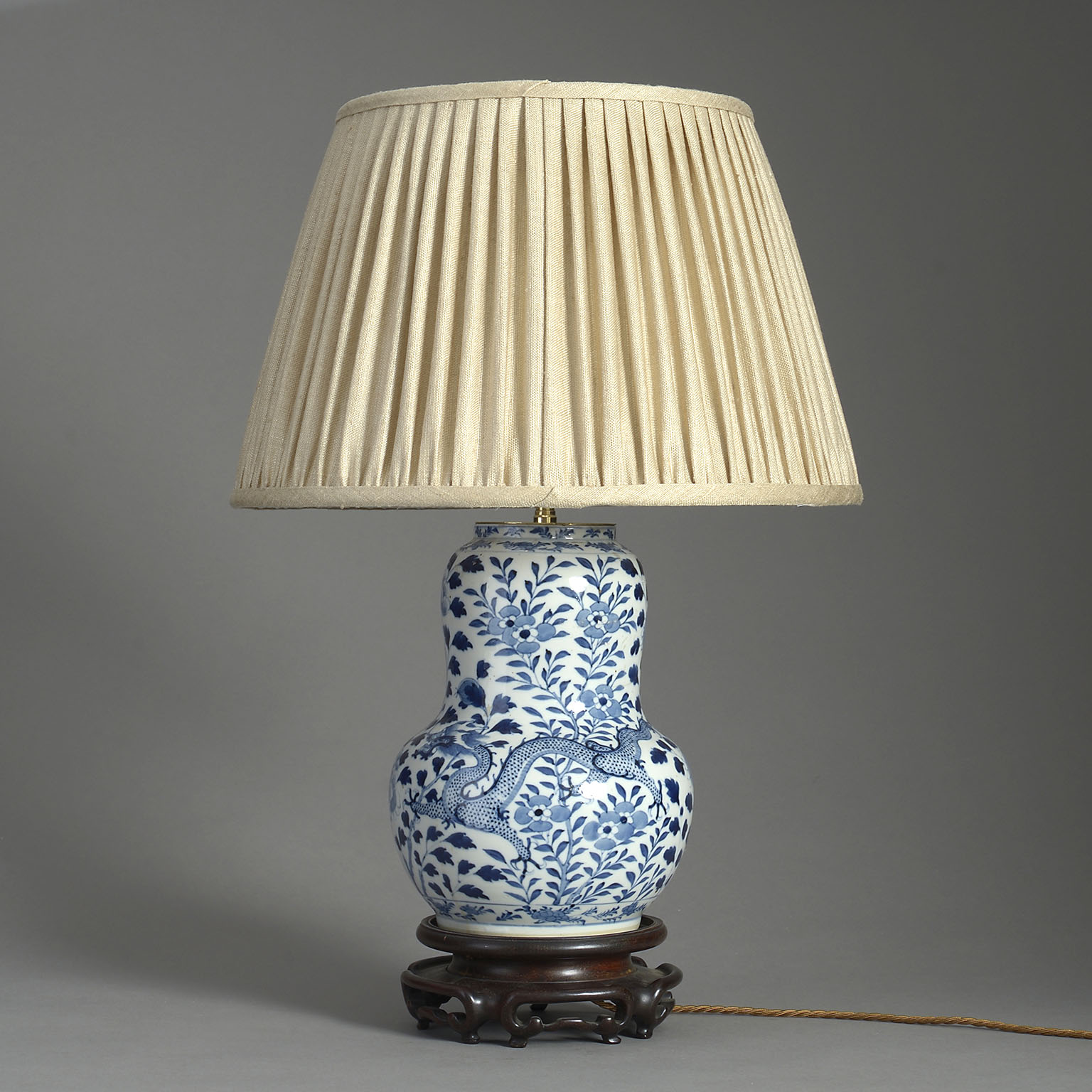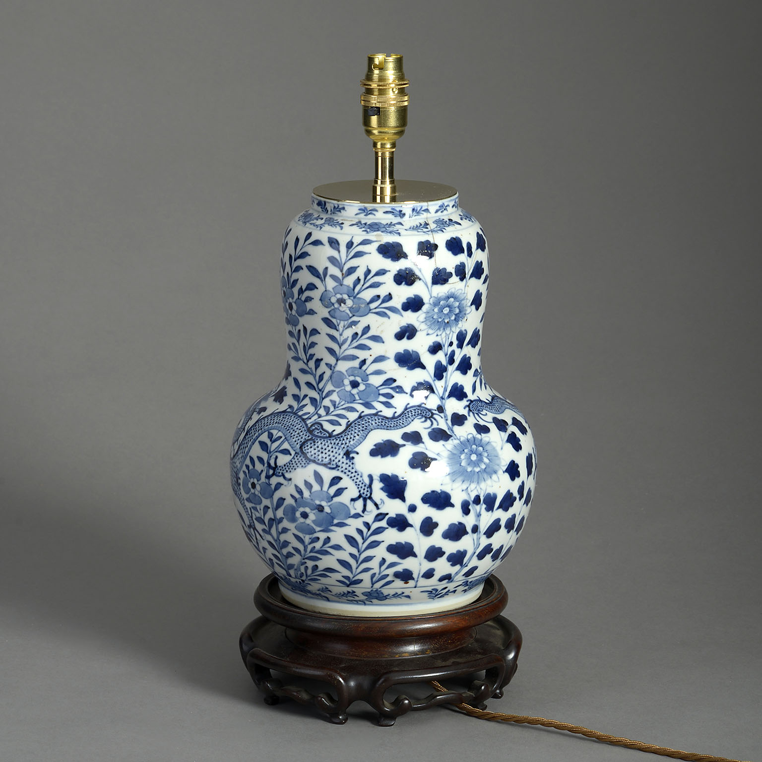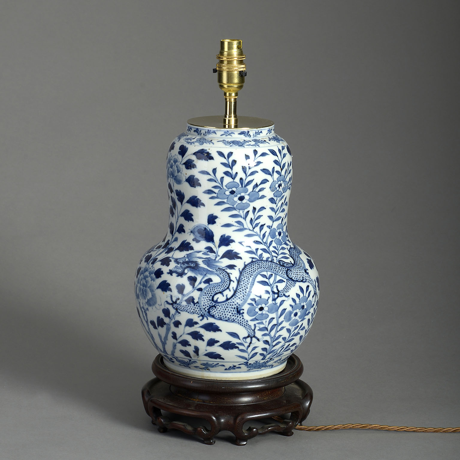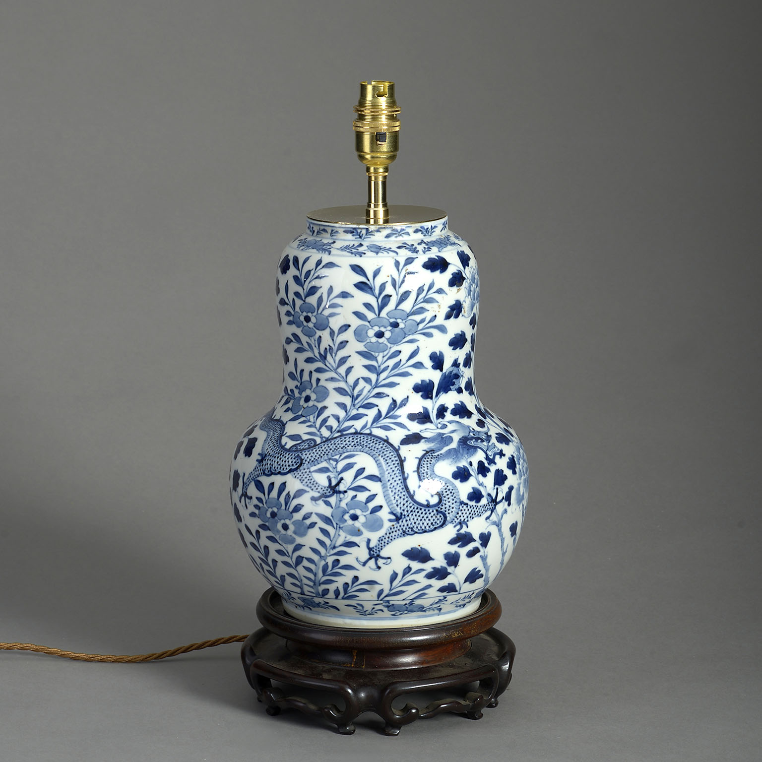 A mid-nineteenth century blue and white glazed vase of generous gourd form, decorated with dragons, flowers and foliage, set upon a carved hard wood stand and now wired as a lamp.