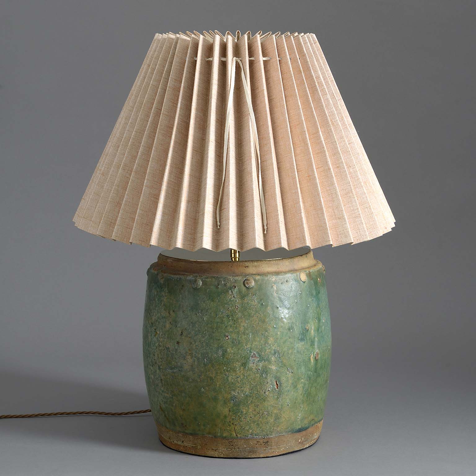 A late nineteenth century green glazed pottery jar mounted as a lamp base.