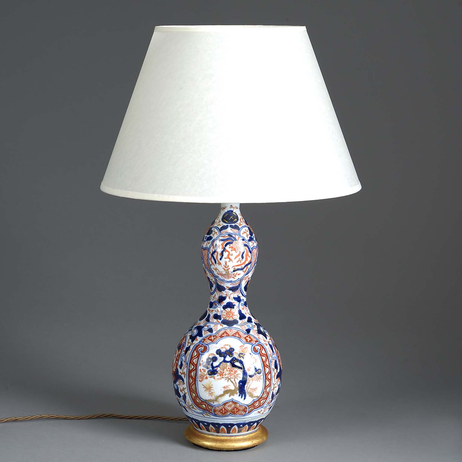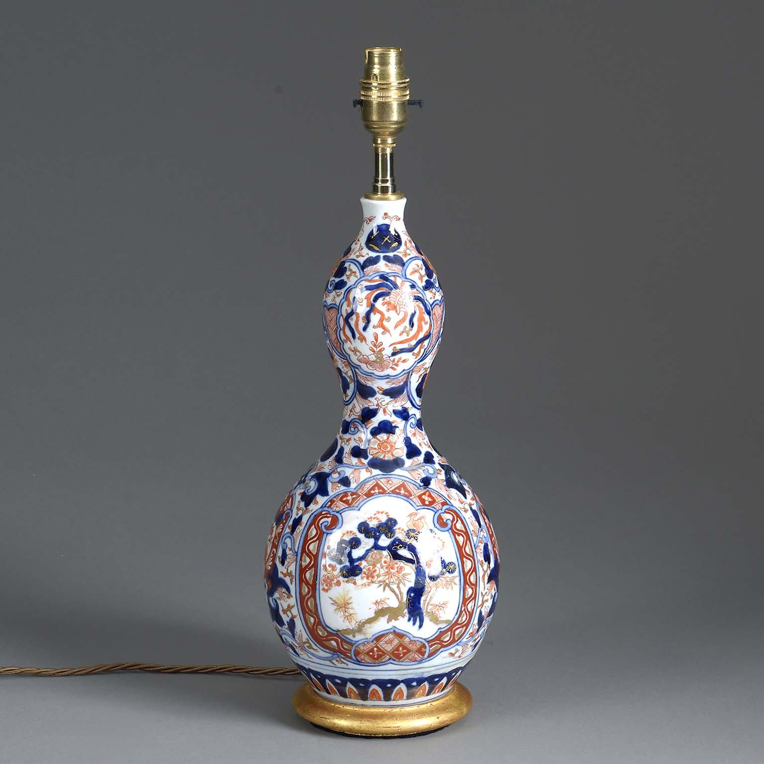 A late nineteenth century Meiji Period Imari porcelain vase of gourd form, decorated in red, blue and gold glazed upon a white ground in the traditional manner. Wired as a table lamp and set upon a turned gilded base.