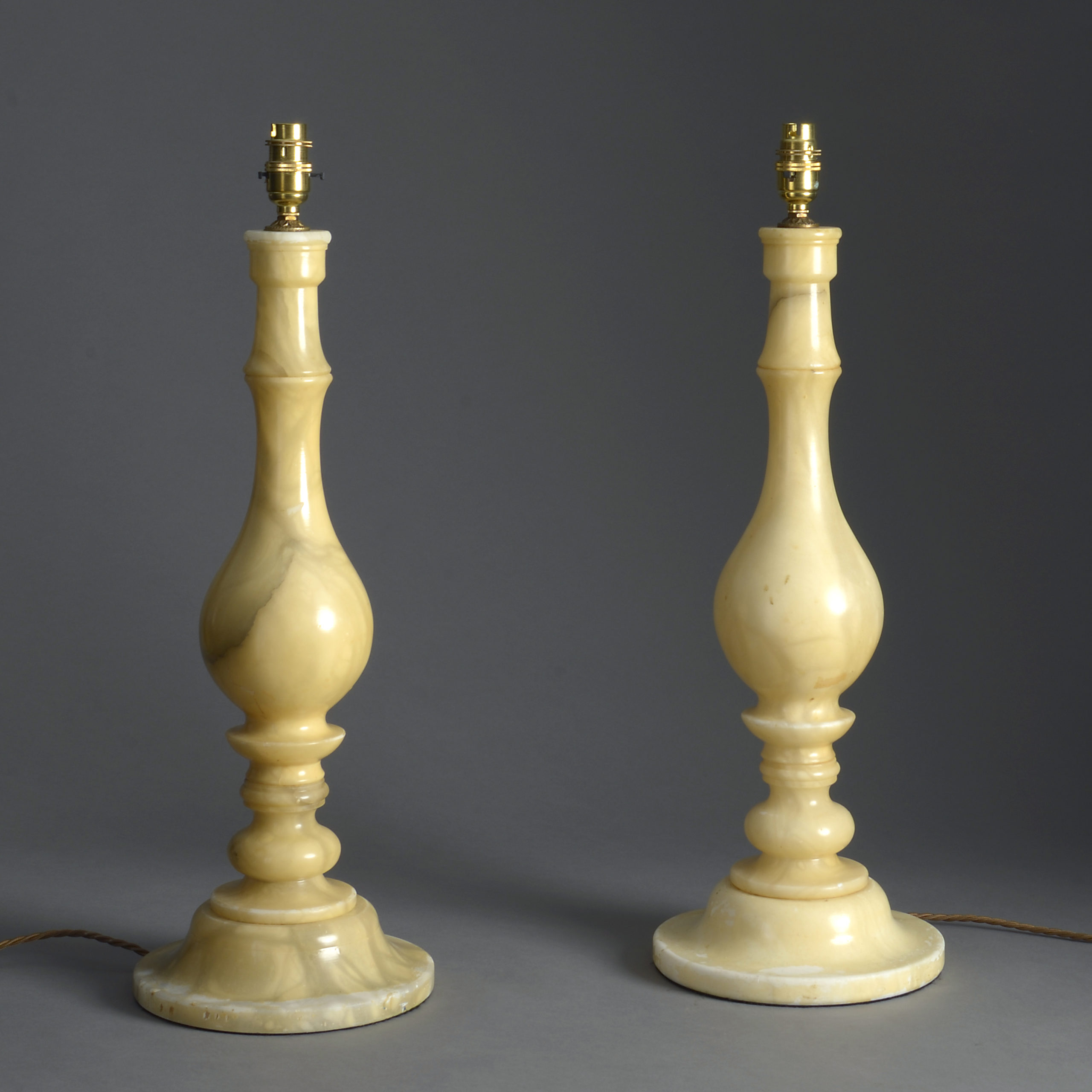 A large late nineteenth century pair of finely turned alabaster table lamps, taking the form of chess pieces.