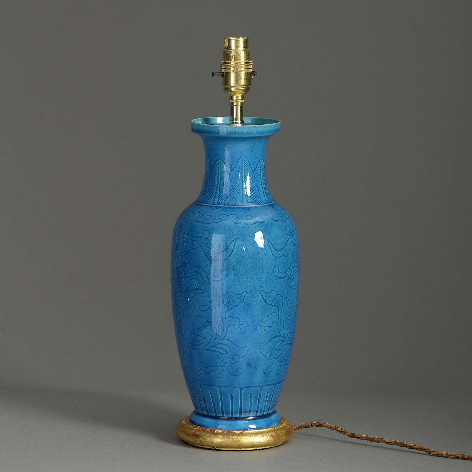 A nineteenth century baluster vase of medium scale with rich turquoise glaze, the body with incised decoration. Now mounted on a hand-turned water gilded base.
