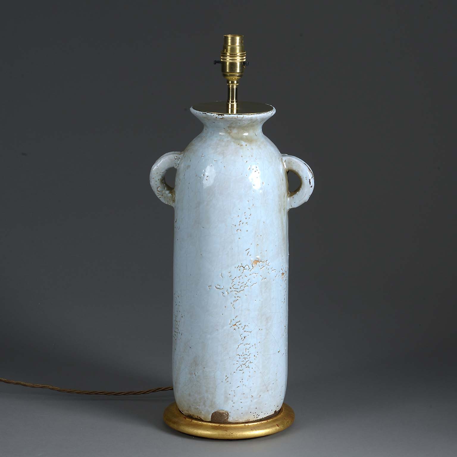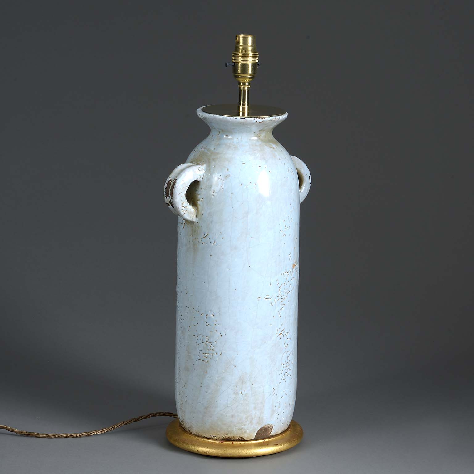 A twentieth century Modernist Style pottery jar with bluish cream glaze, the body with loop handles. Now mounted upon a turned gilded base as a table lamp.