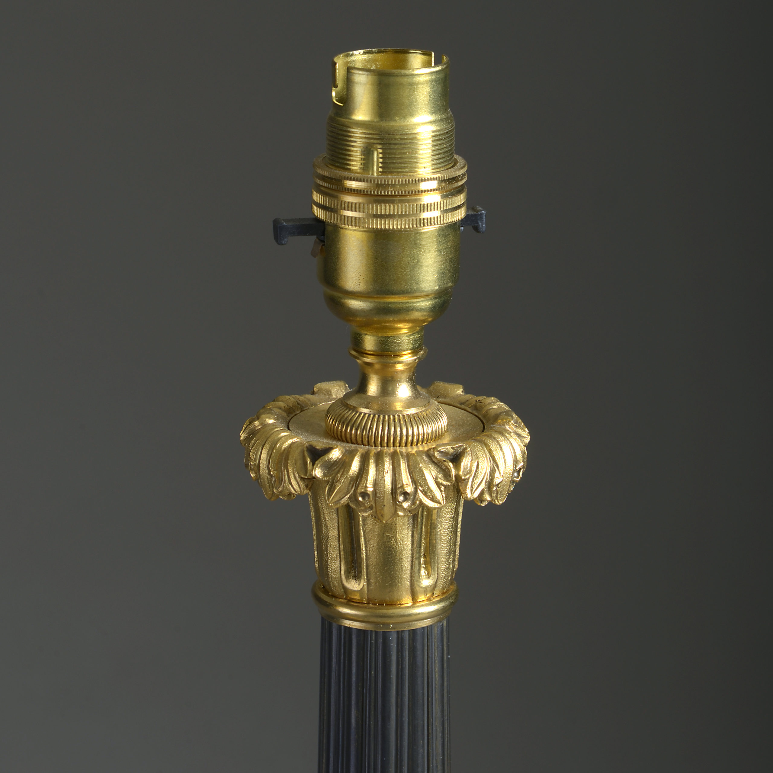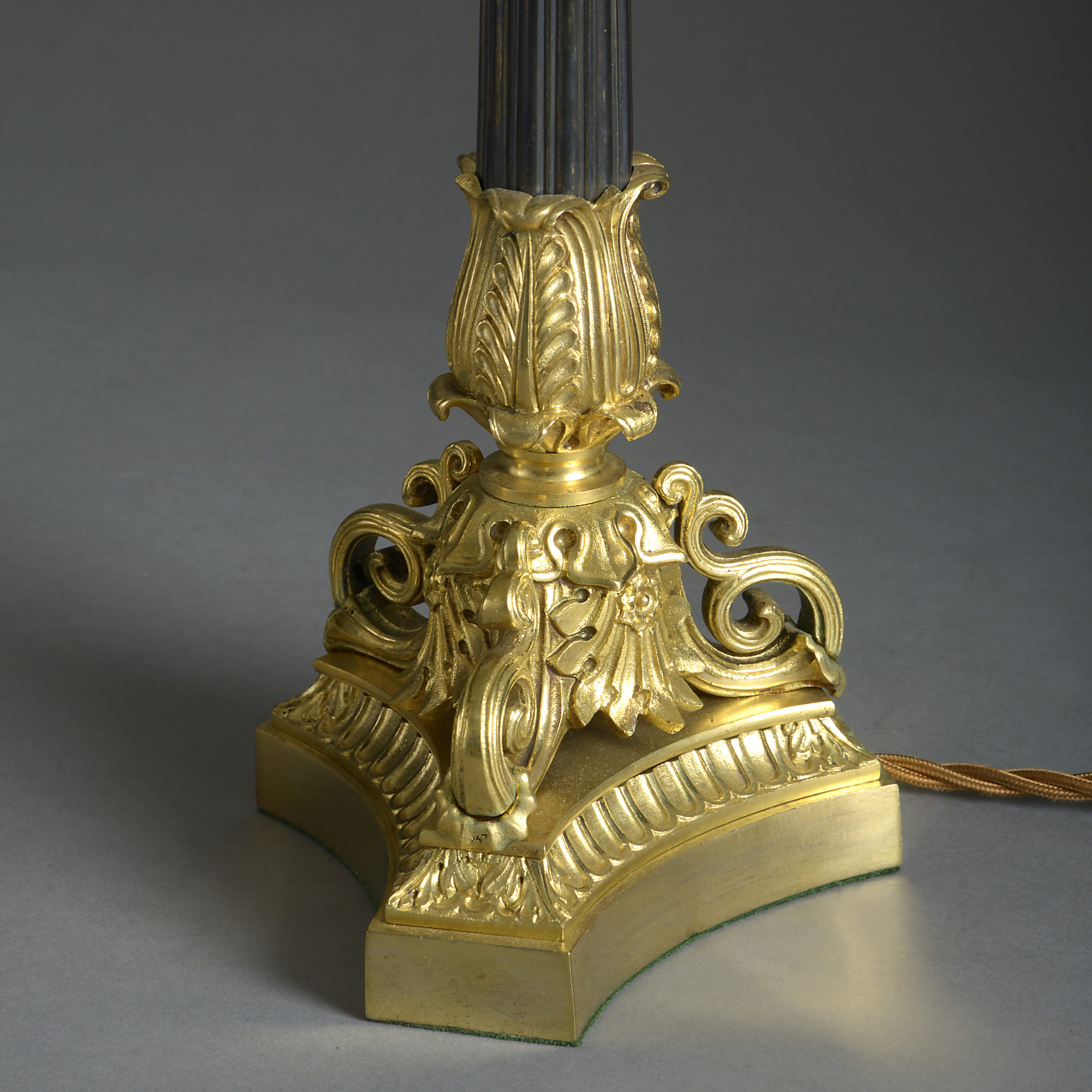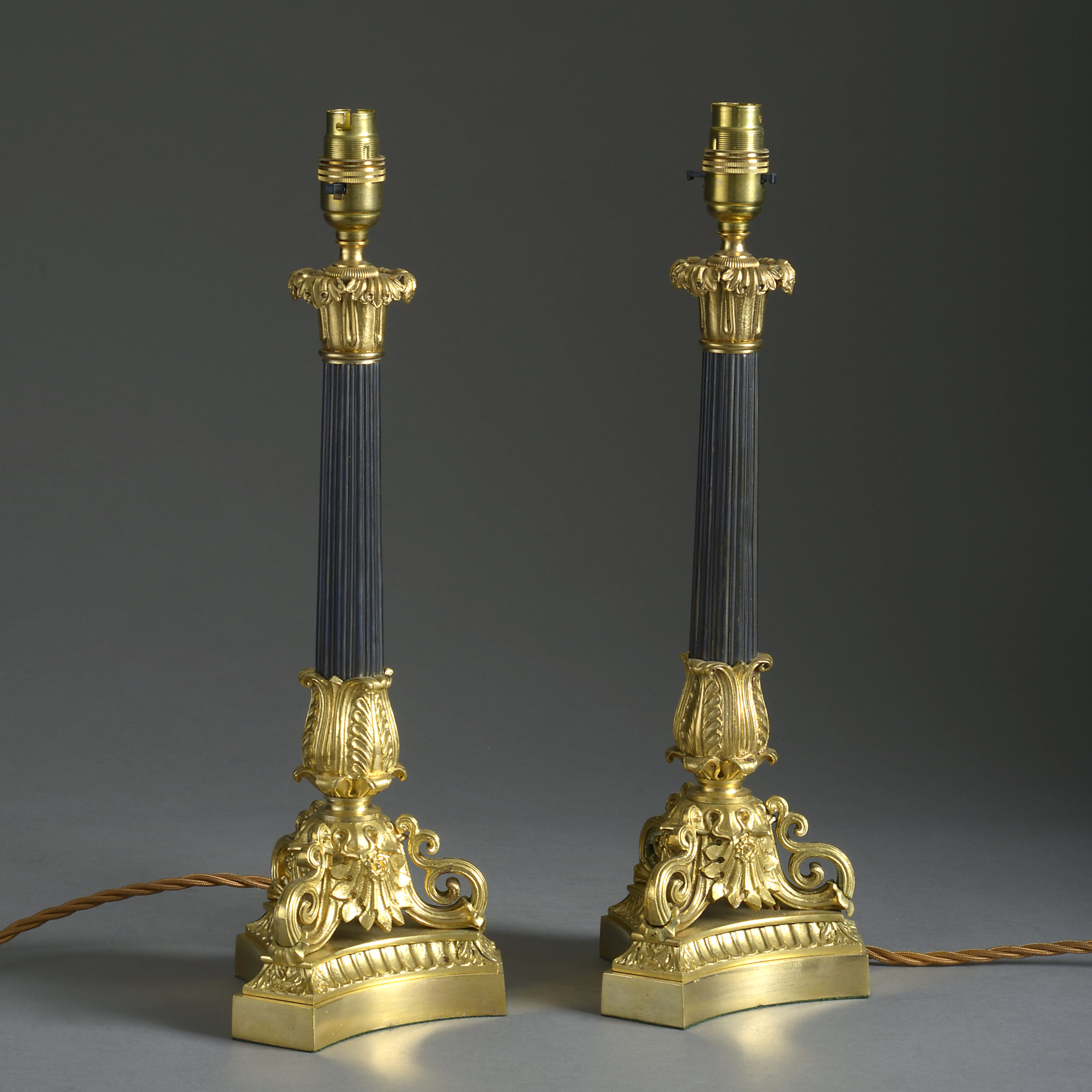 A late nineteenth century pair of candlesticks, the fluted bronze columns mounted with finely chased ormolu capitals and scrolling bases, terminating in concave tri-form plinths. Now mounted as table lamps.