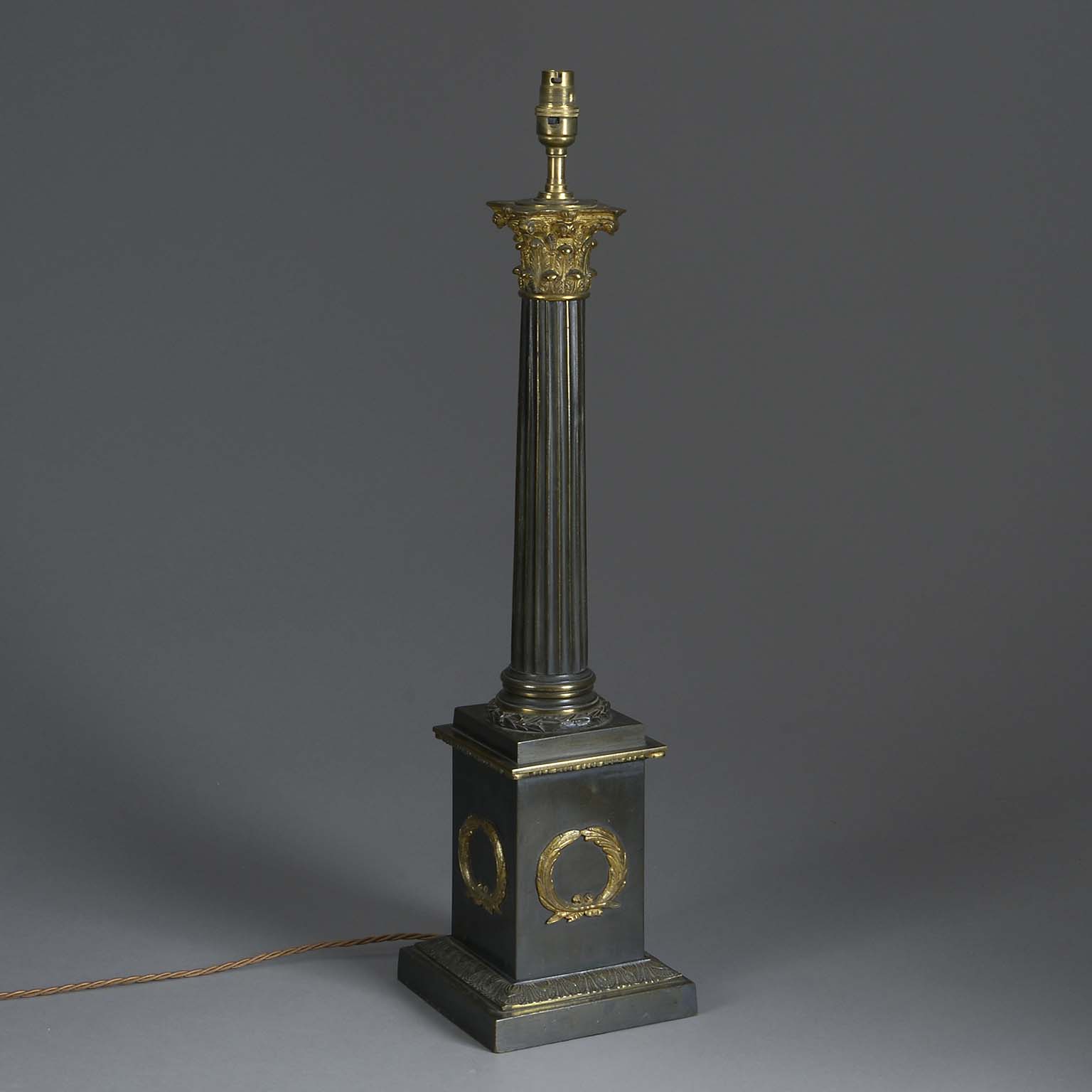An early nineteenth century bronzed tole fluted column lamp with ormolu corinthian capital, the plinth base with ormolu mounted laurel wreathes.