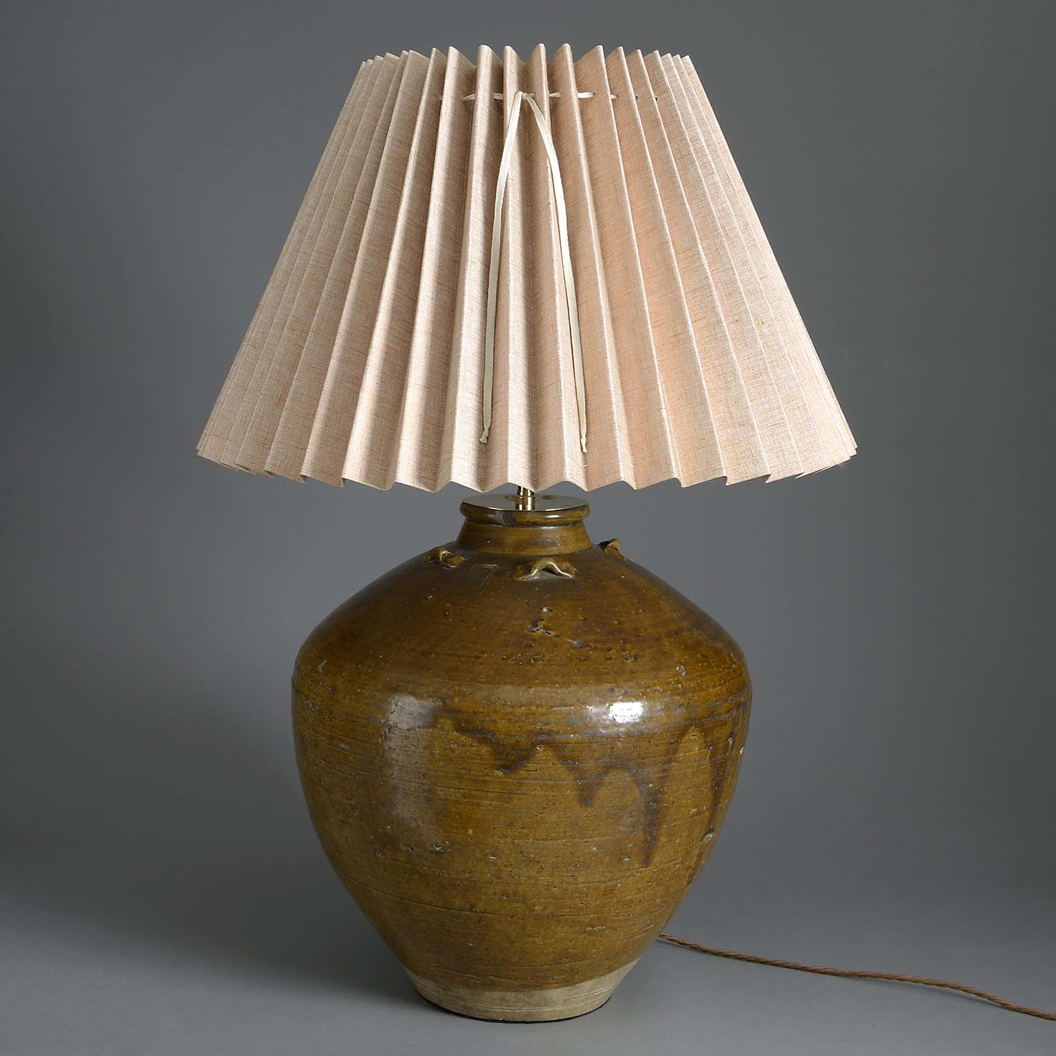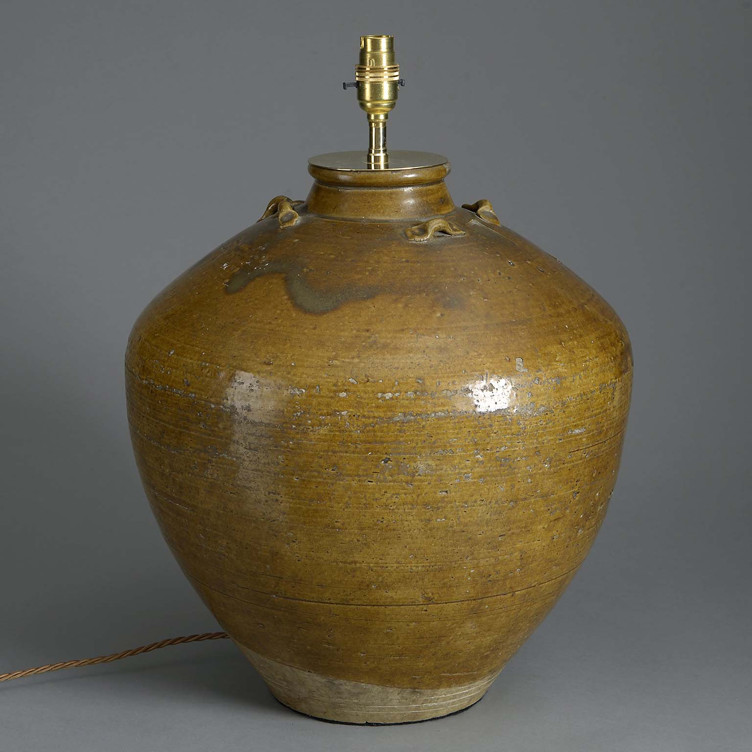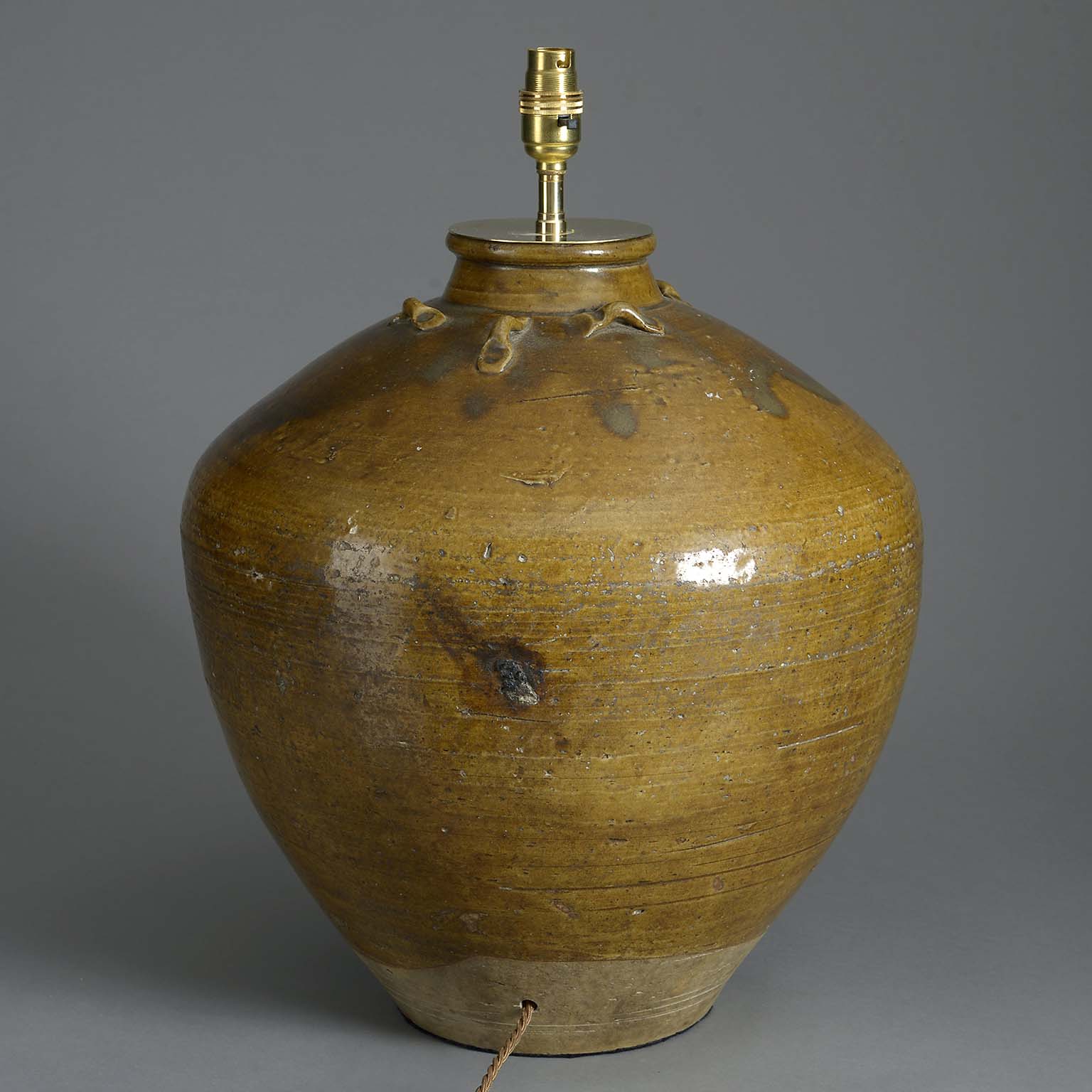 An early twentieth century caramel glazed pottery jar of good scale, mounted as a table lamp.