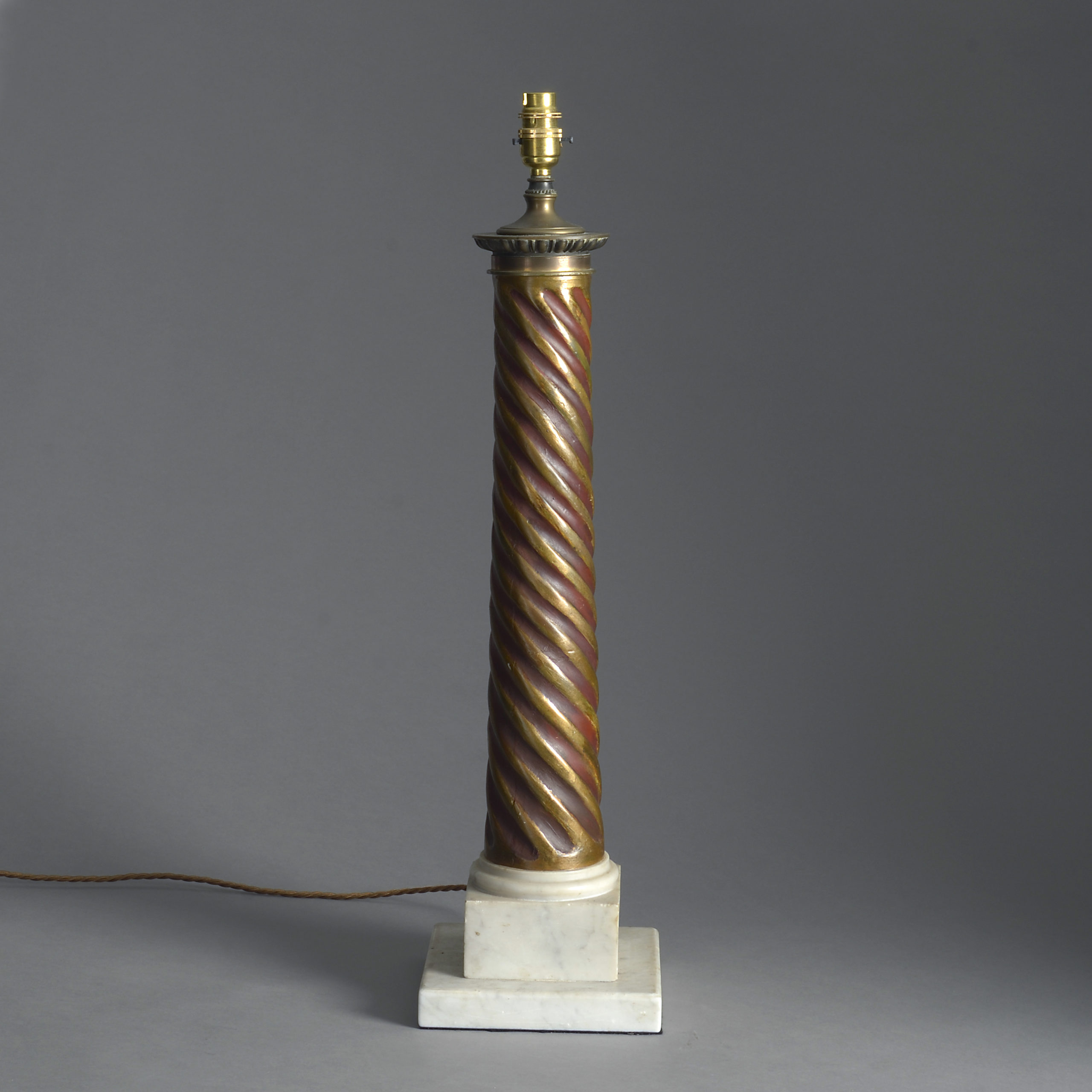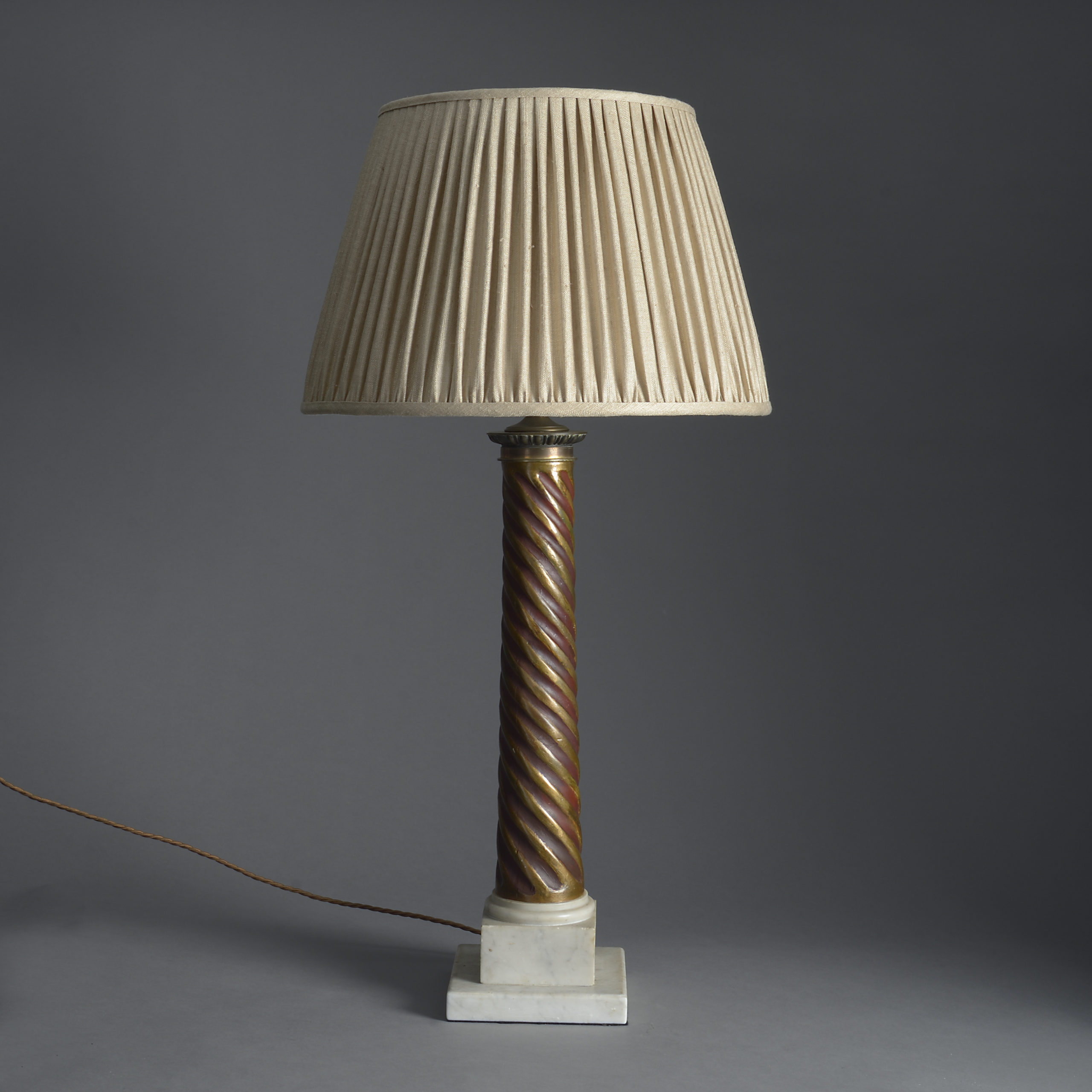 An early twentieth century parcel gilded spiral fluted column lamp, set upon a square white marble plinth base.