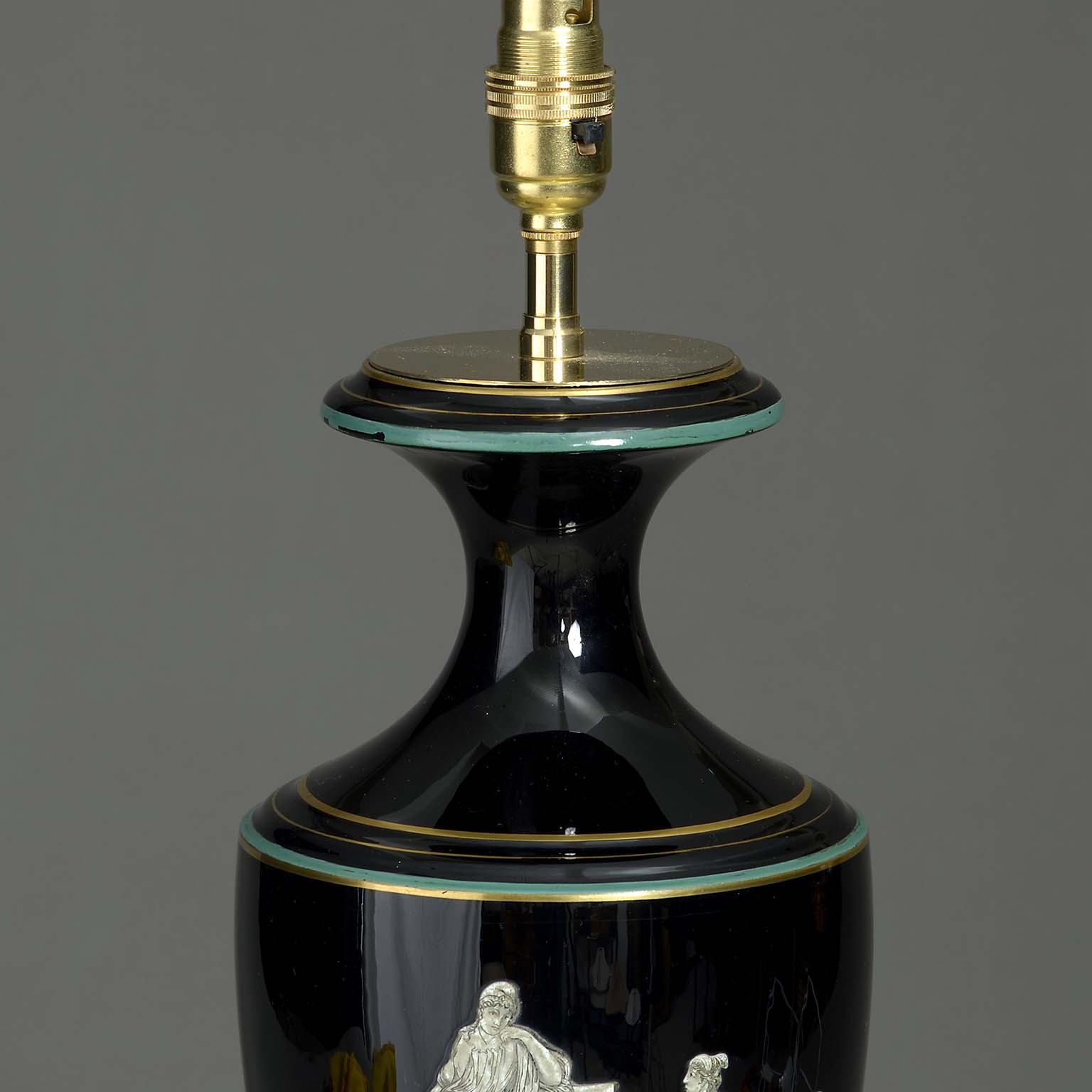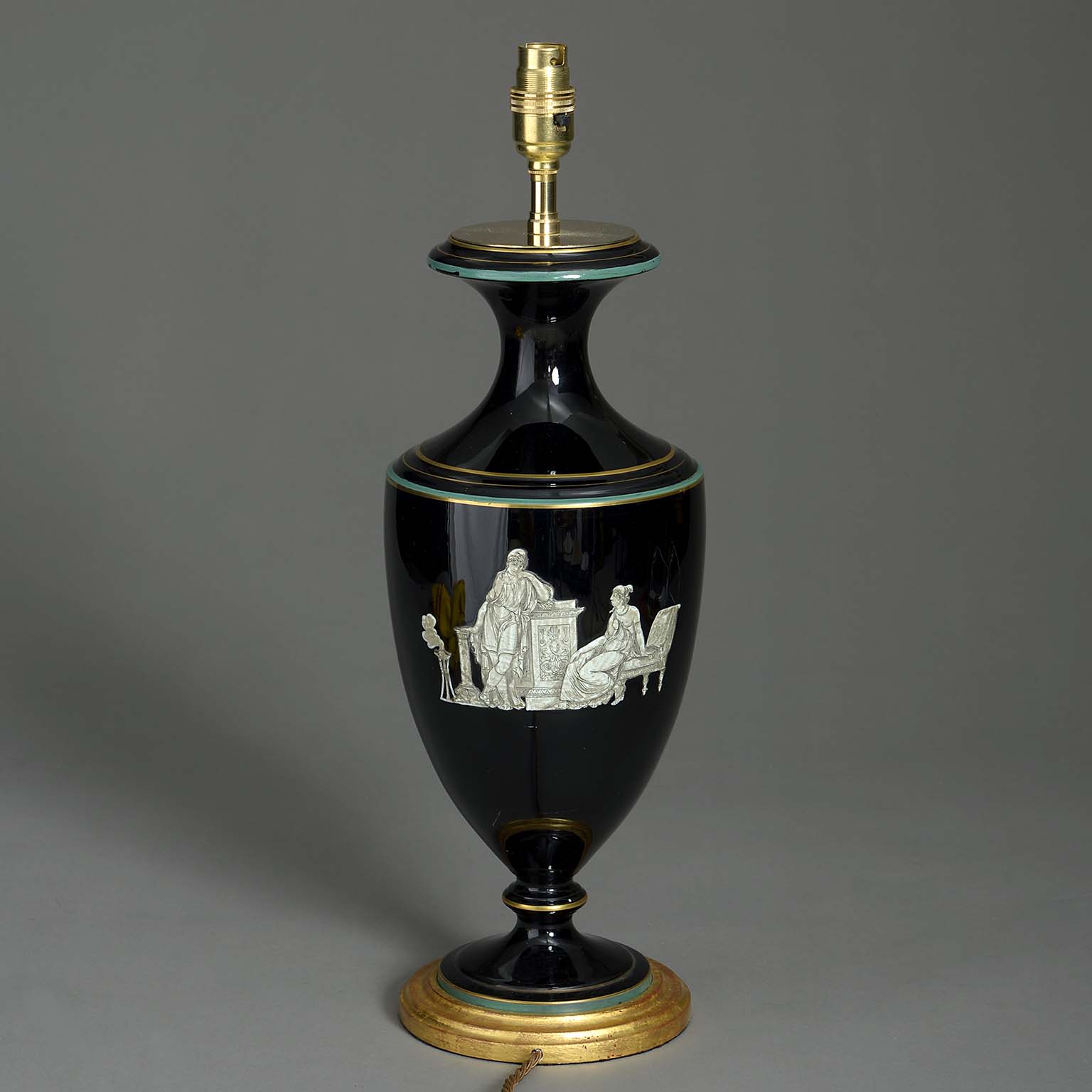 A late nineteenth century black opaline glass vase, decorated with scenes of Classical Antiquity, now mounted on a turned water gilded base as a table lamp.