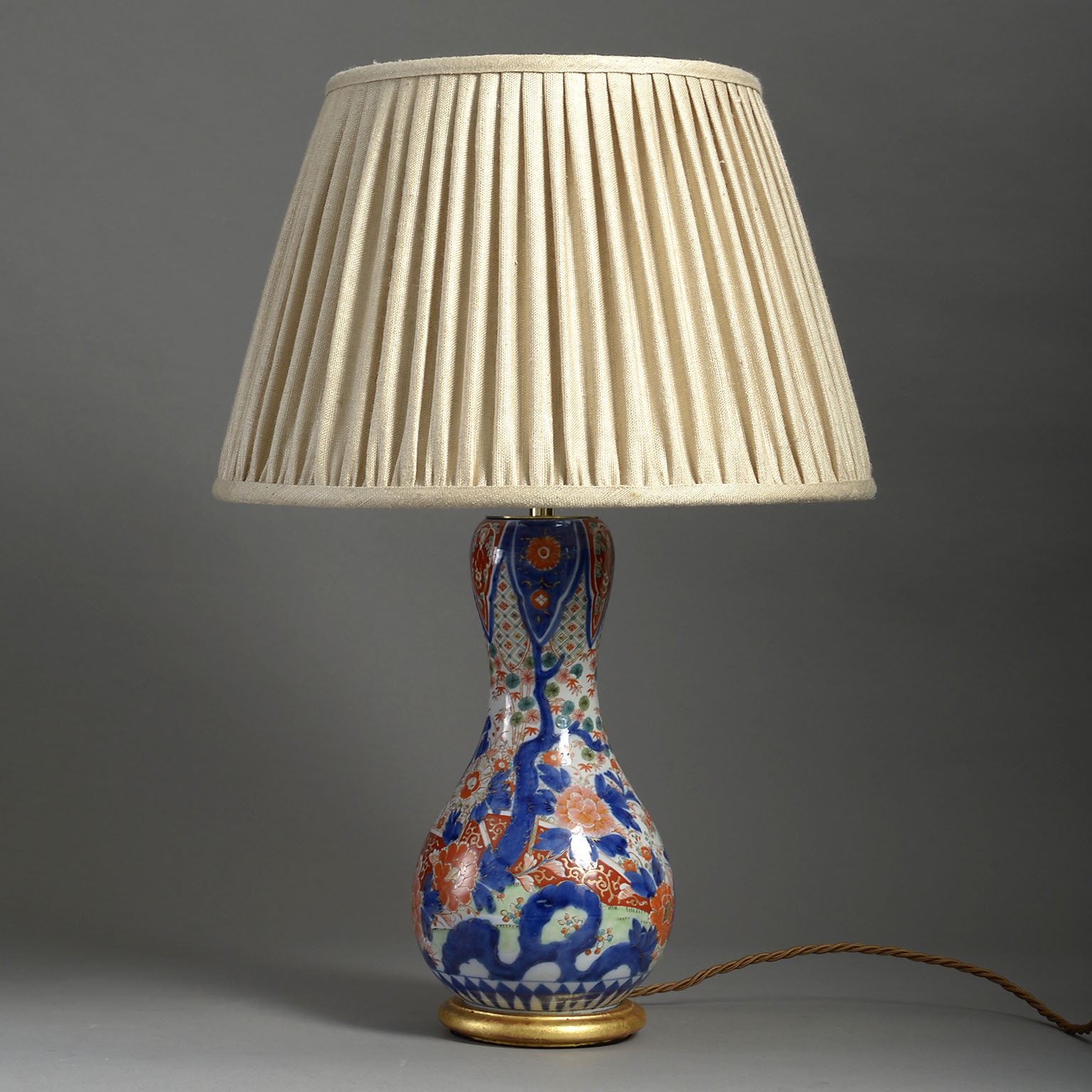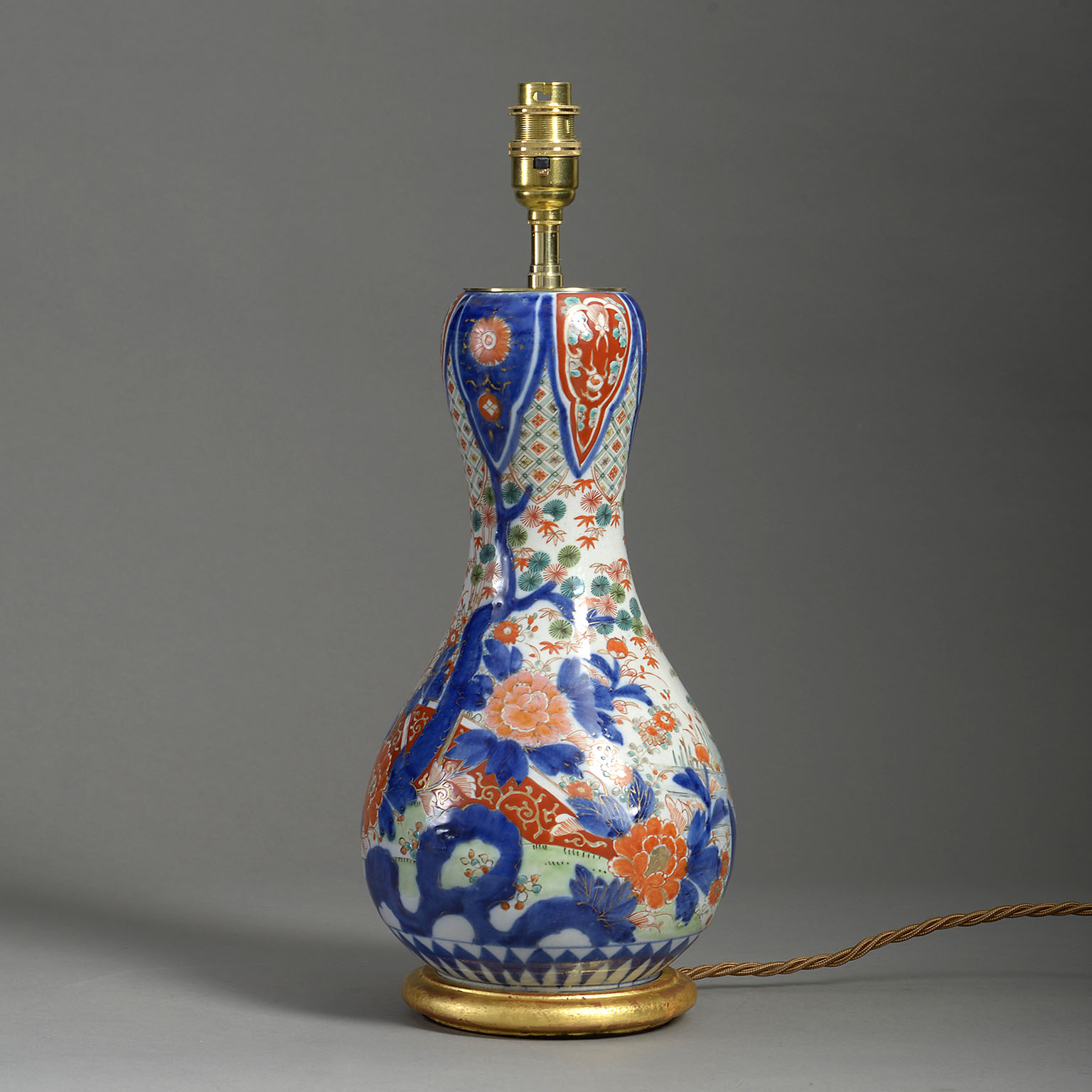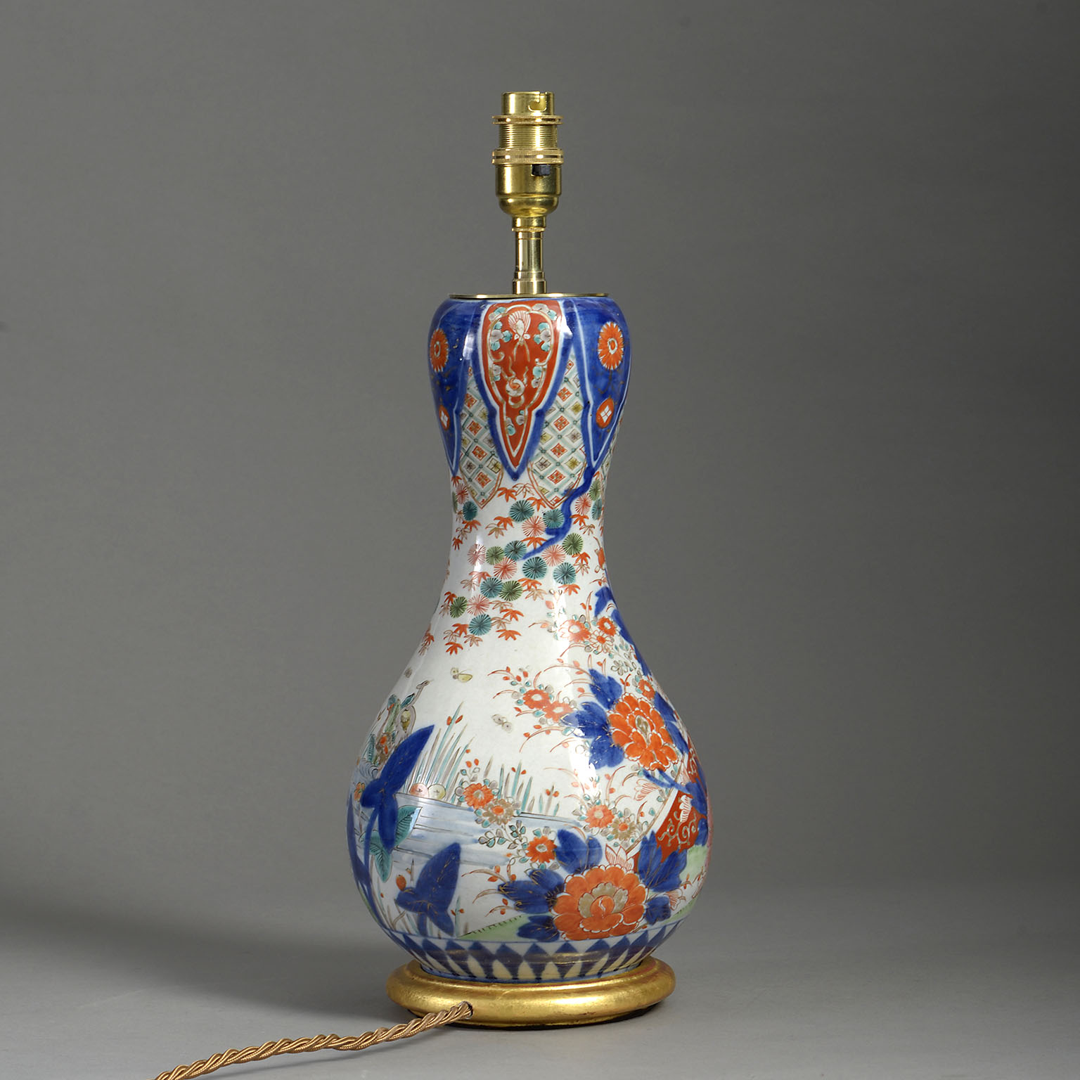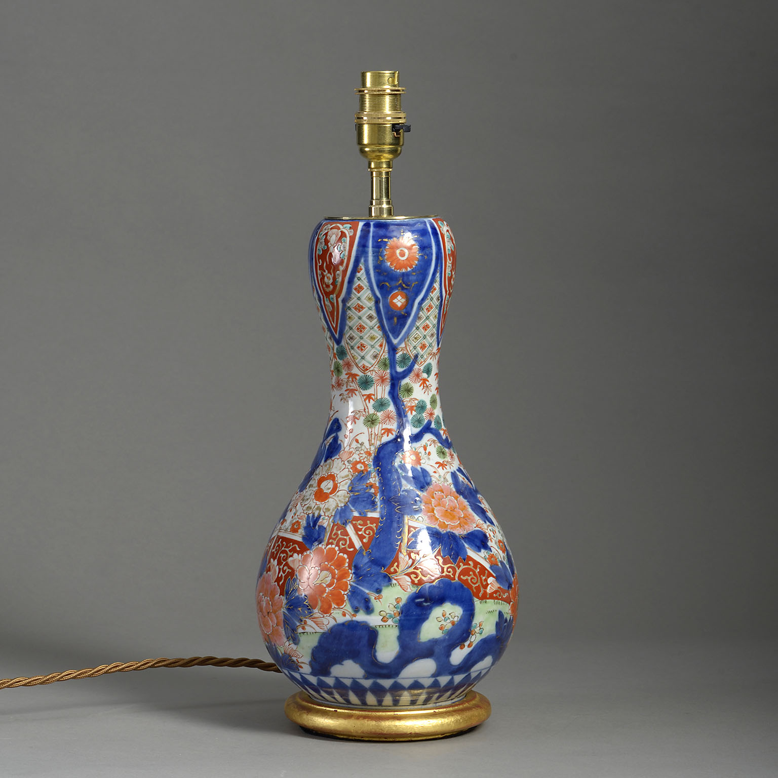 A late nineteenth century Meiji Period Imari vase of gourd form, decorated in the traditional manner with polychrome glazes and now mounted as a lamp on a turned giltwood base.