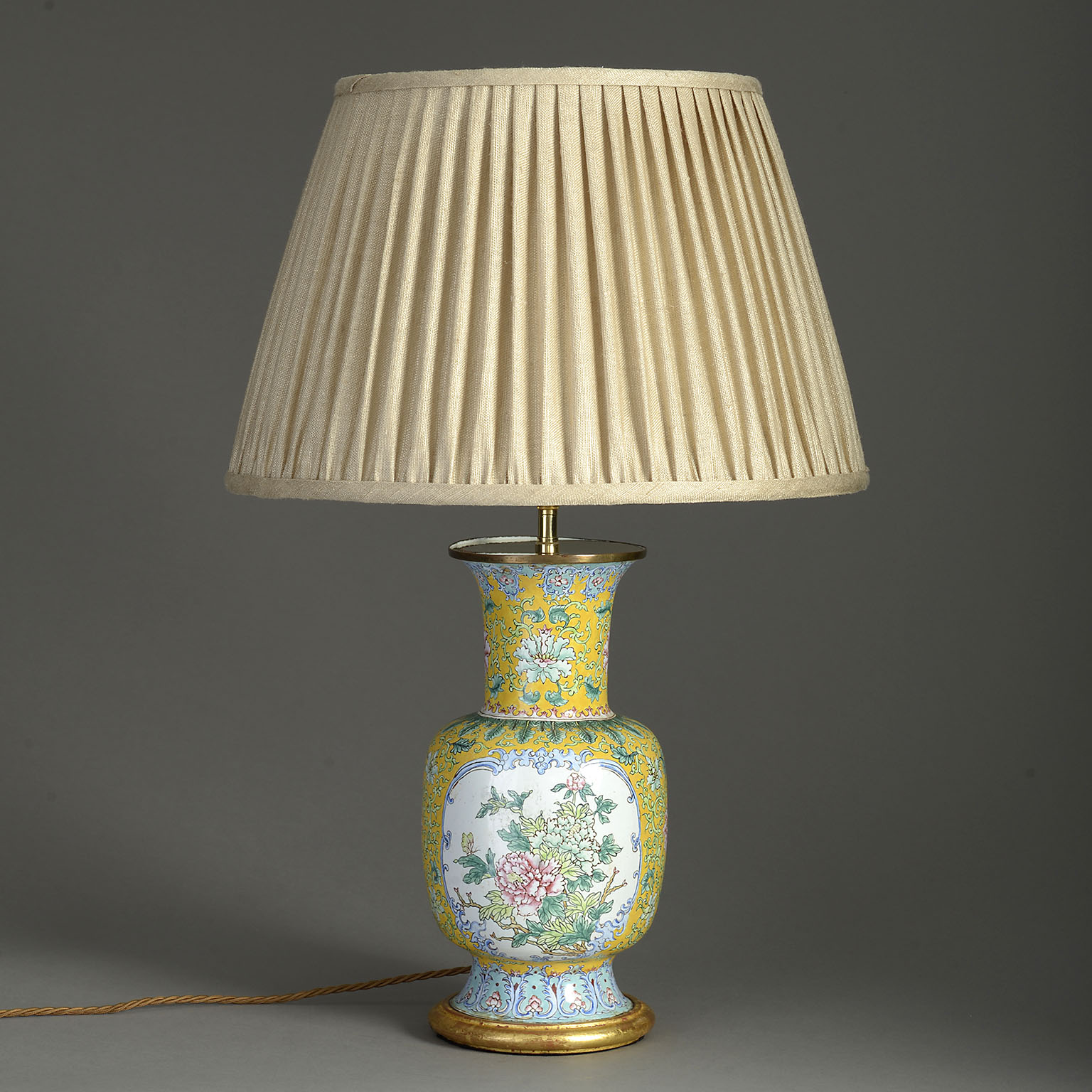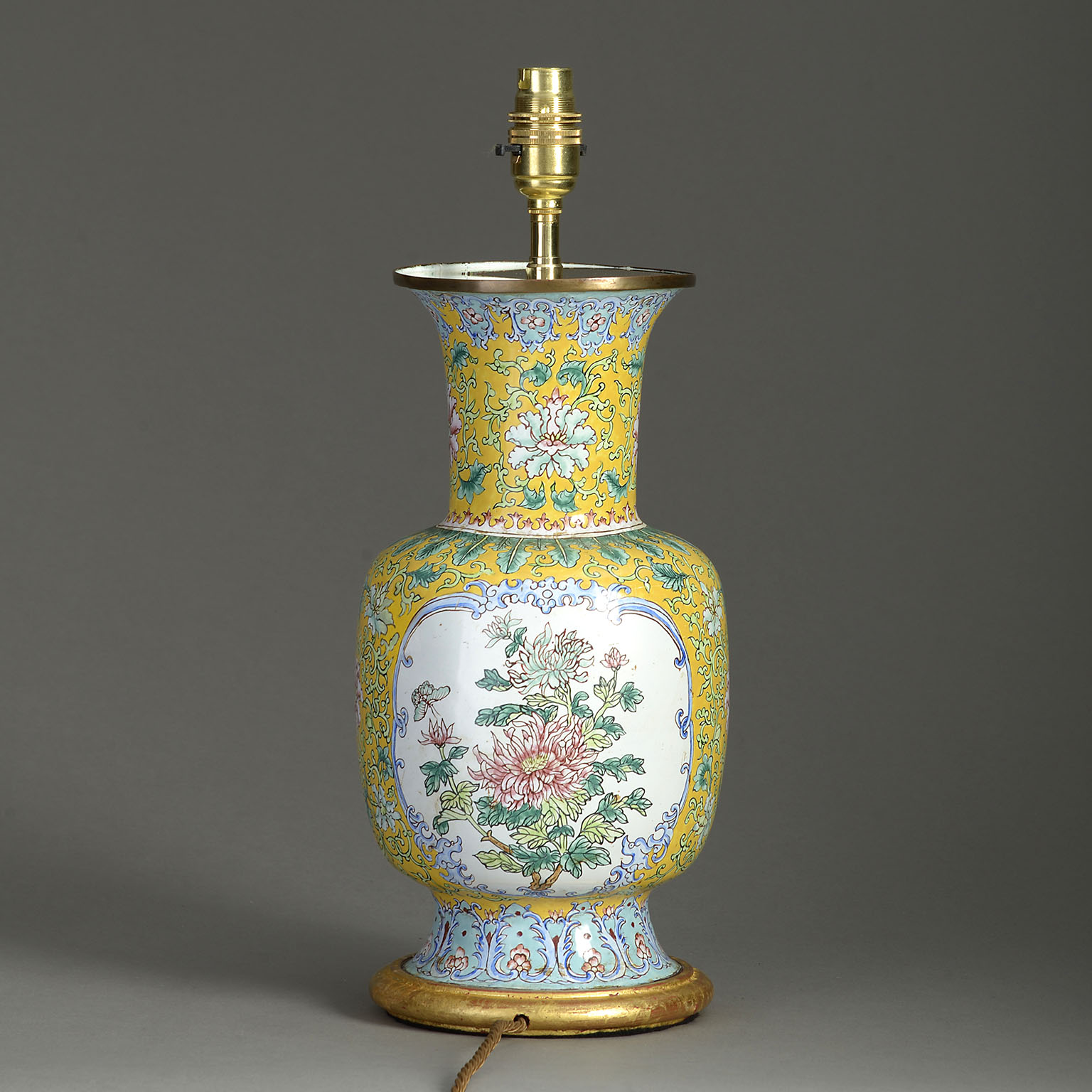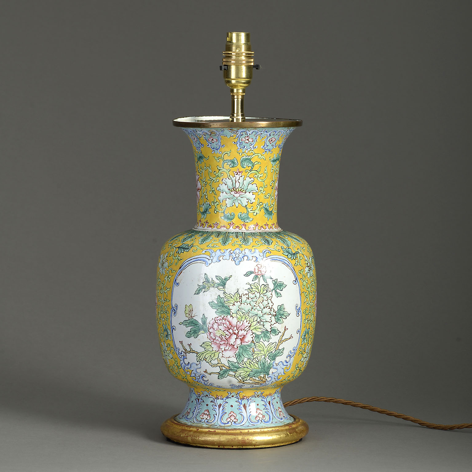 A mid-twentieth century Canton enamel vase of baluster form, the Imperial yellow ground with scrolling foliage and set with floral cartouches. Now mounted as a table lamp on a hand-turned water gilded base.