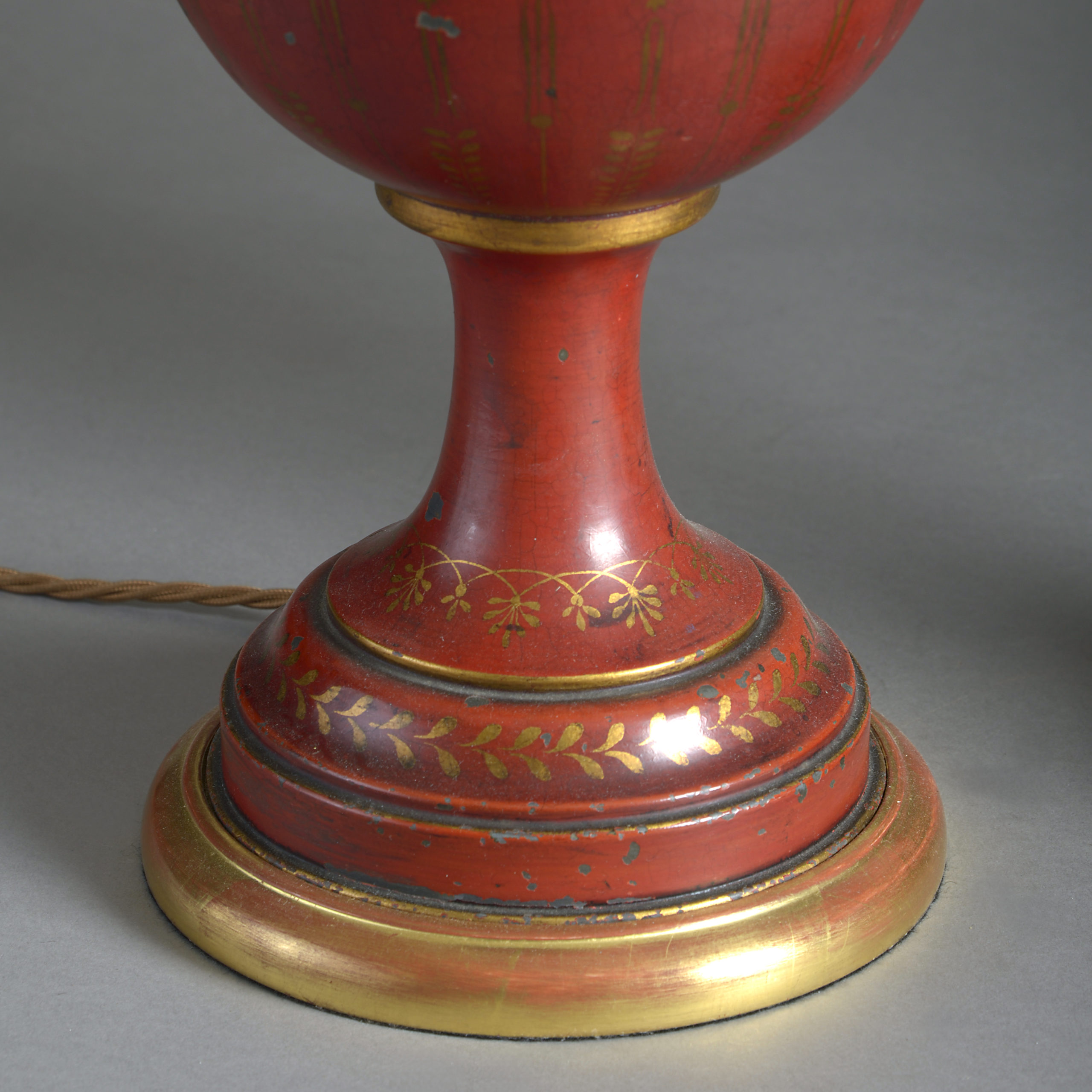 An early twentieth century pair of red tôle vases and covers, having gilded decoration throughout, now mounted as table lamps on turned giltwood bases and wired for electric lighting.