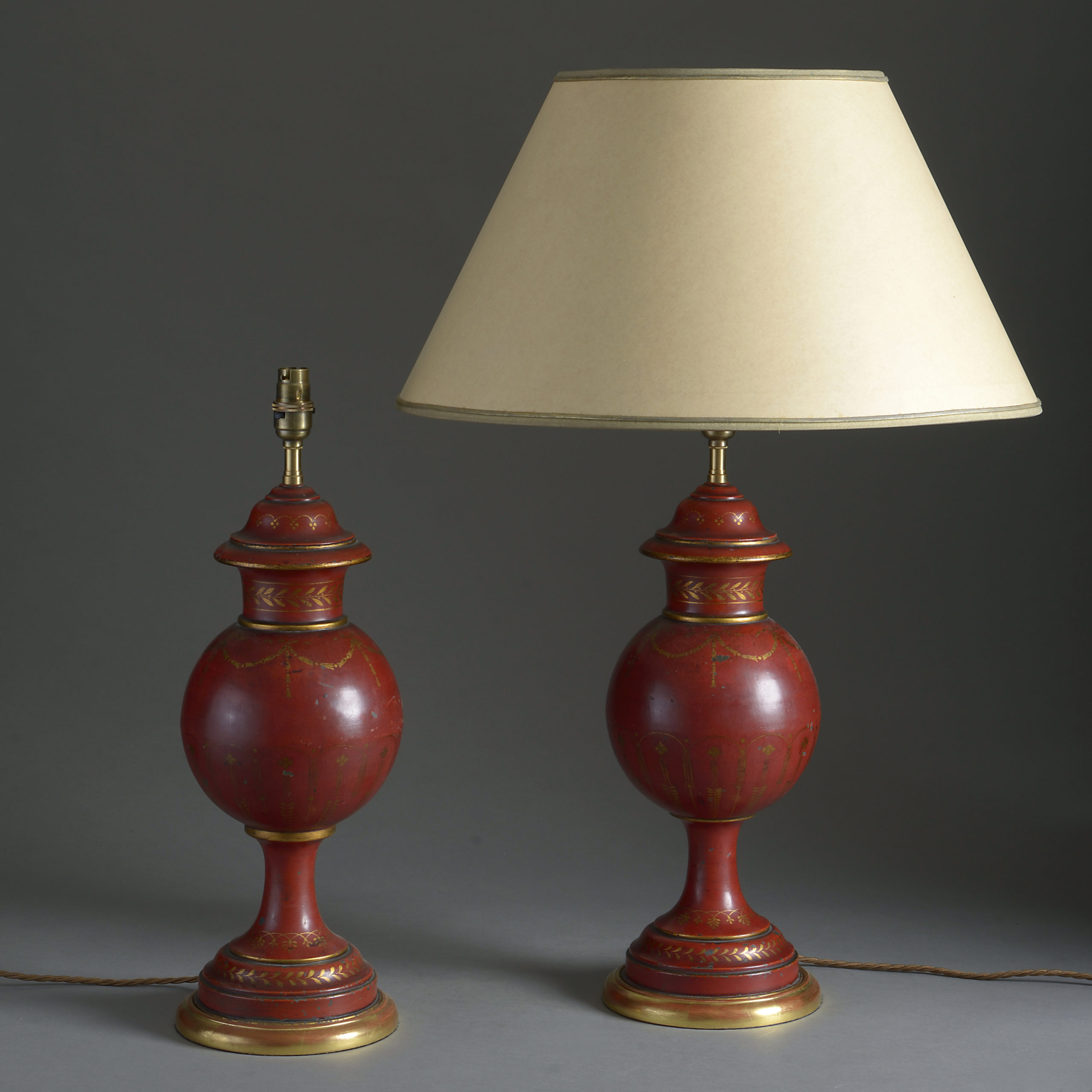 Pair of Red & Gilded Tole Vase Lamps