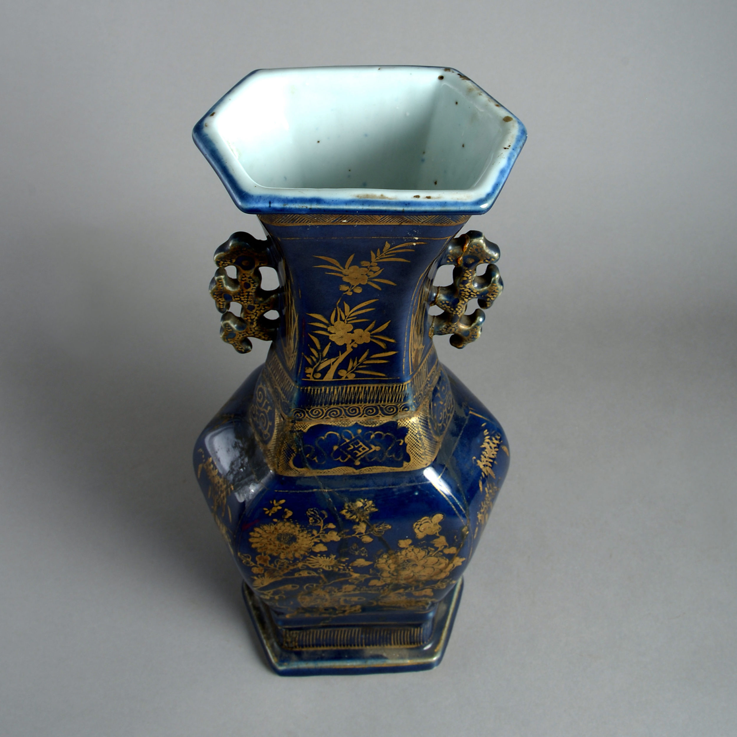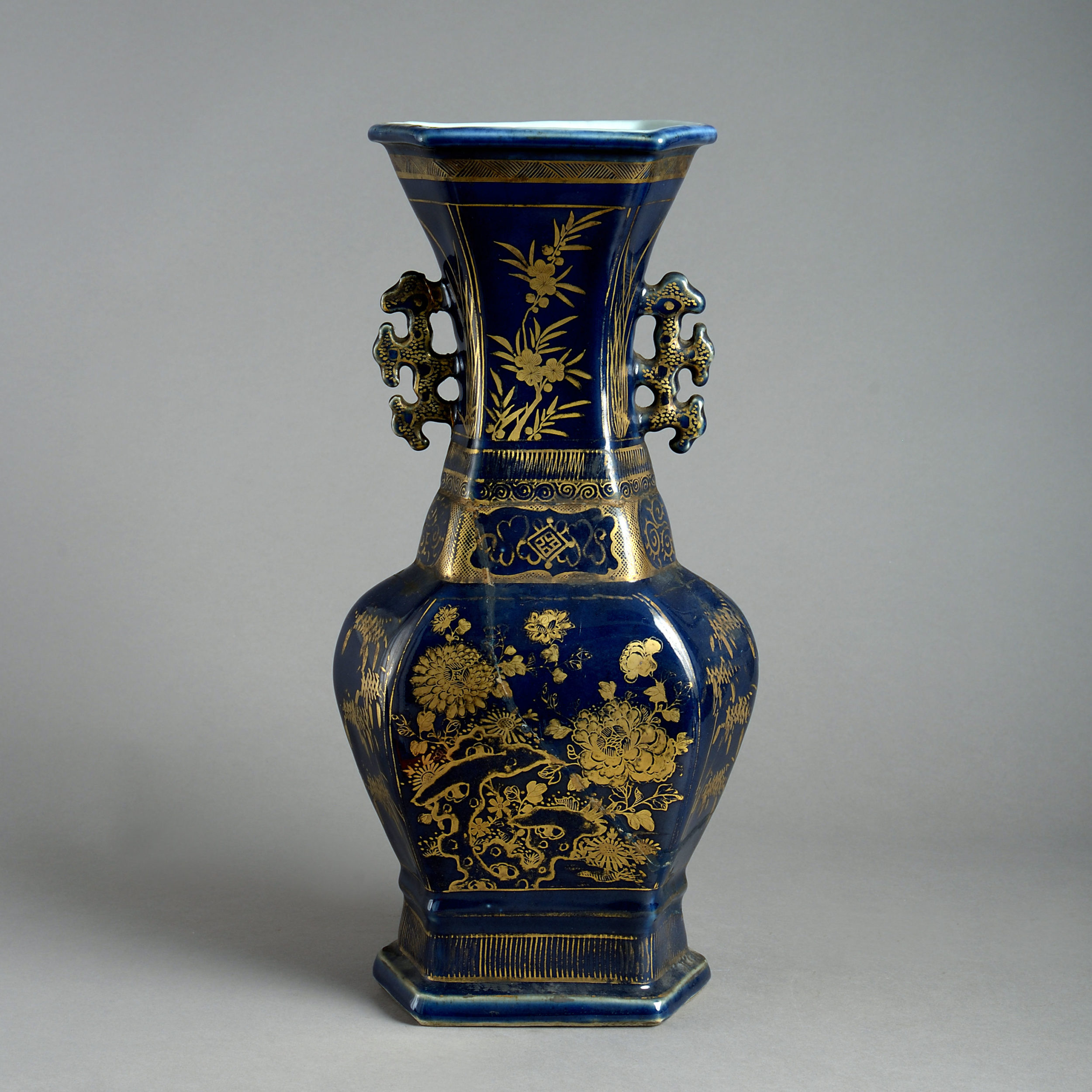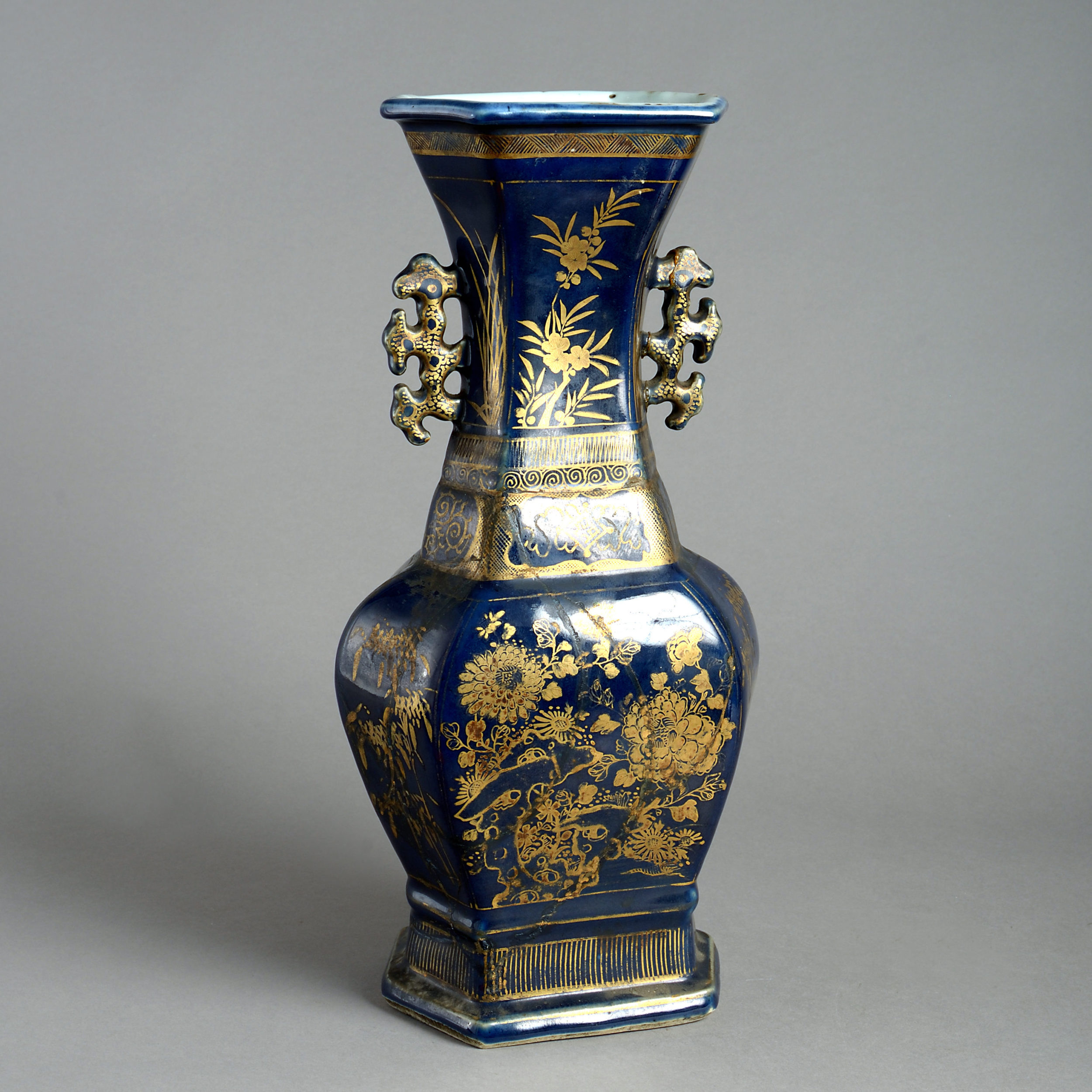 A late 18th century porcelain vase of faceted form, having handles and gilded decoration throughout upon a deep blue ground.