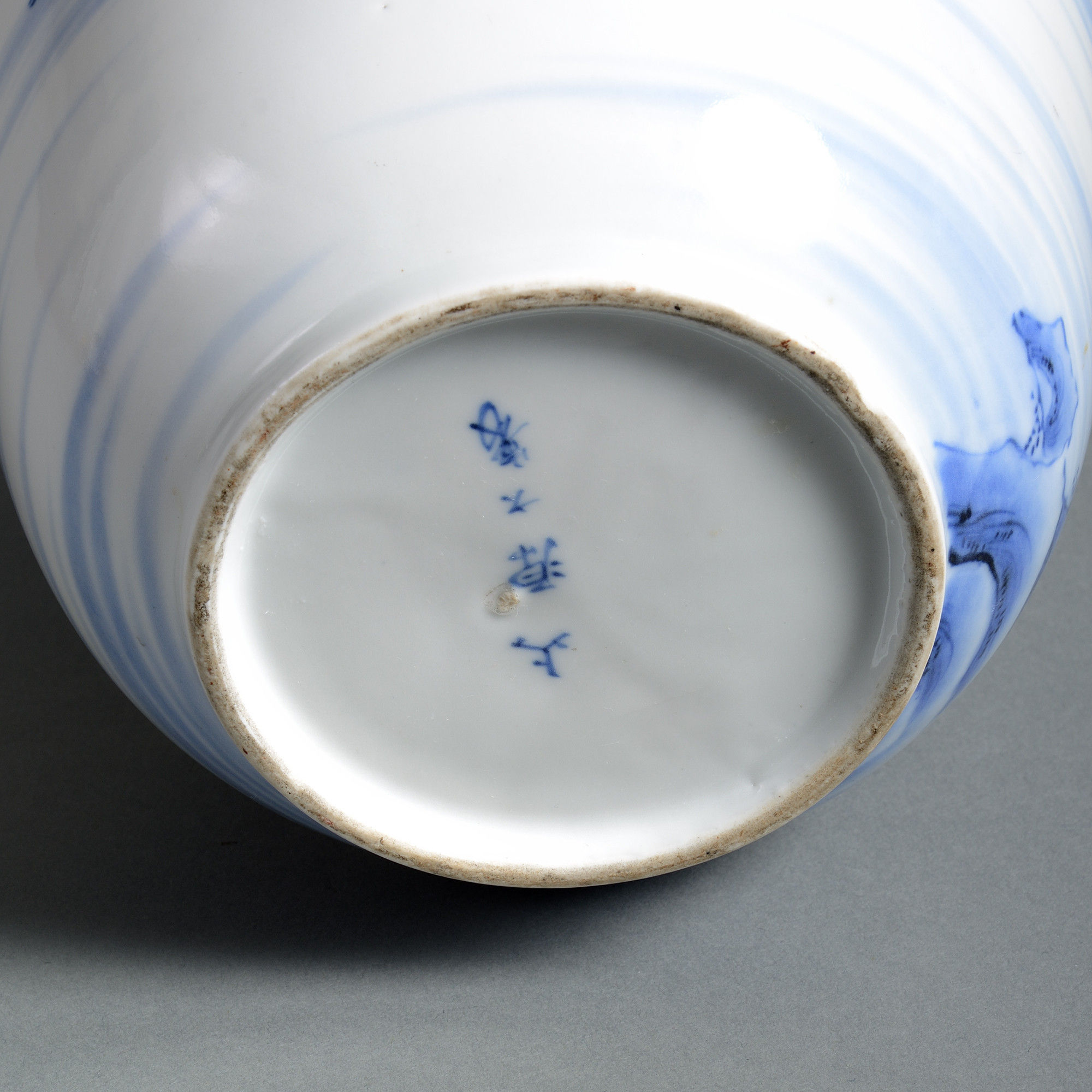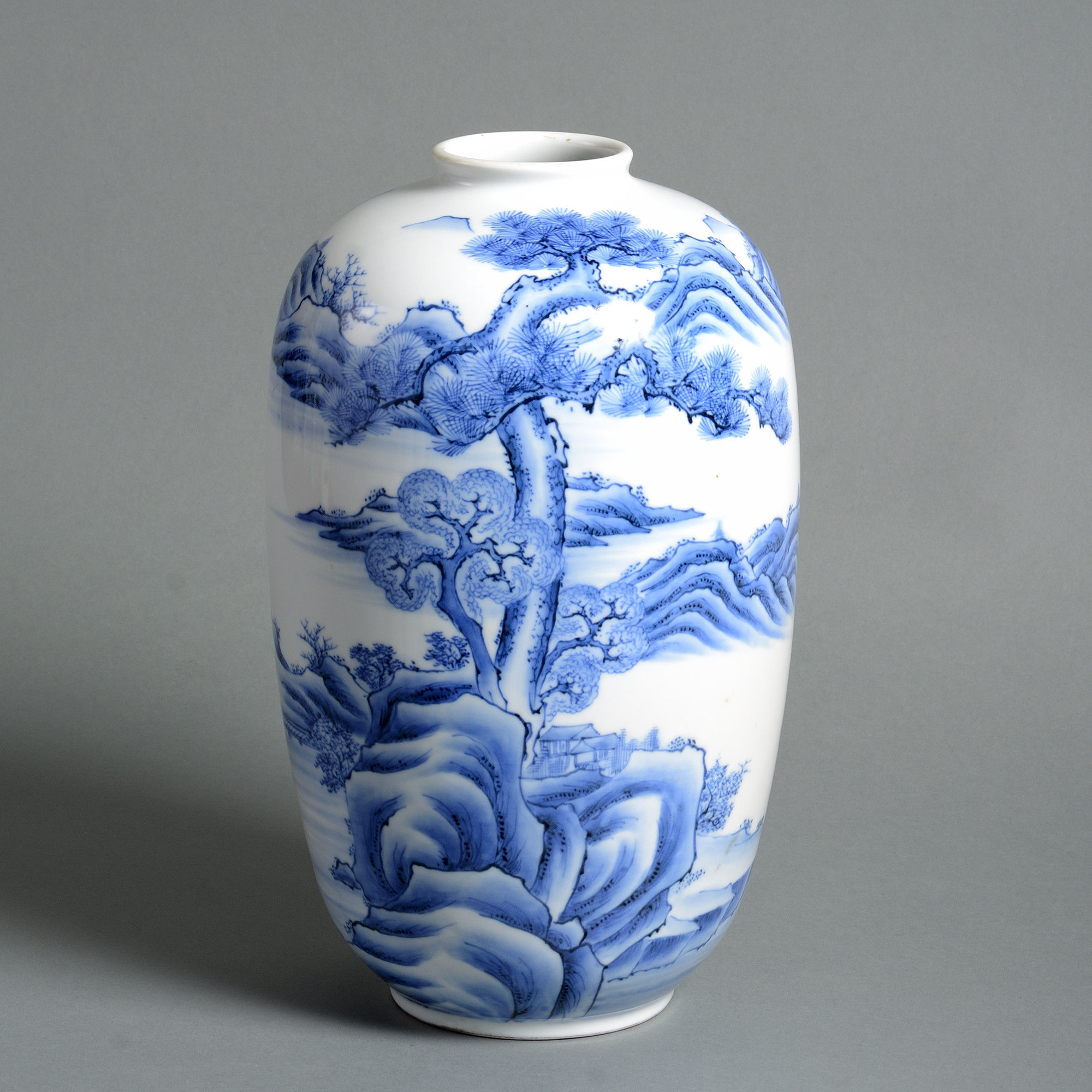 A late 19th century blue and white glazed vase, decorated throughout with landscapes, seascapes, fishing boats with distant mountains.