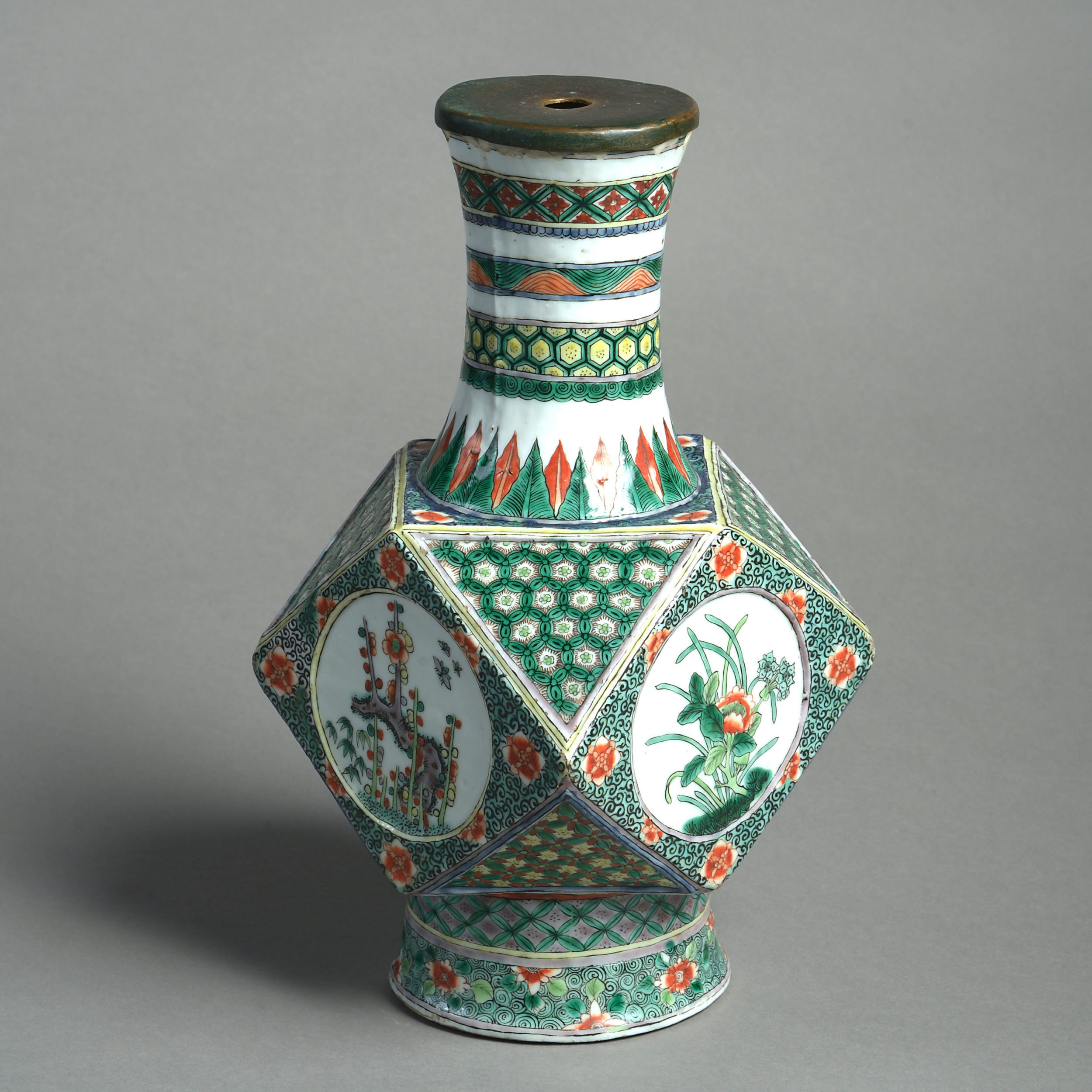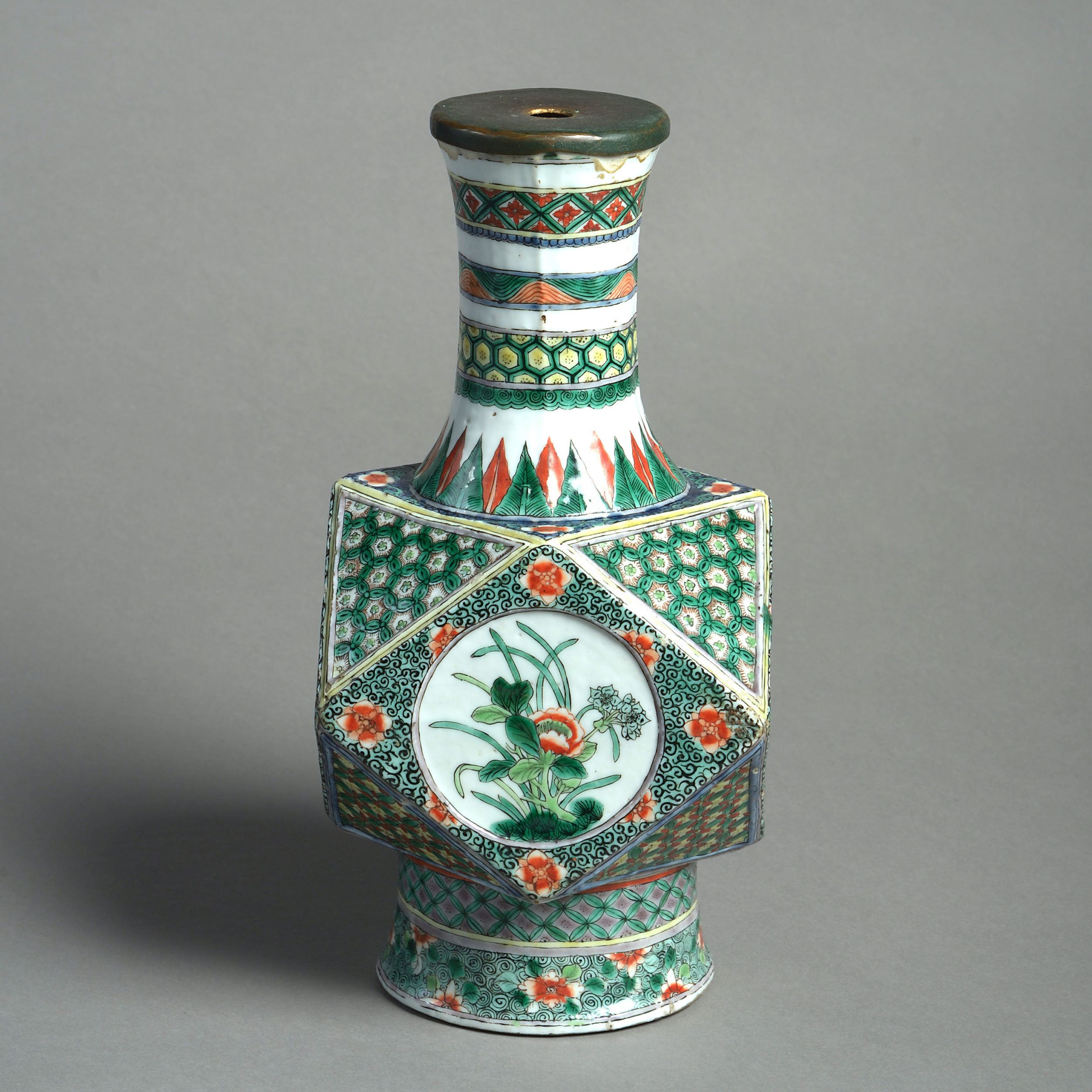 A mid-19th century famille verte vase, in the Kangxi manner, the body of faceted form and having circular cartouches with floral decoration.