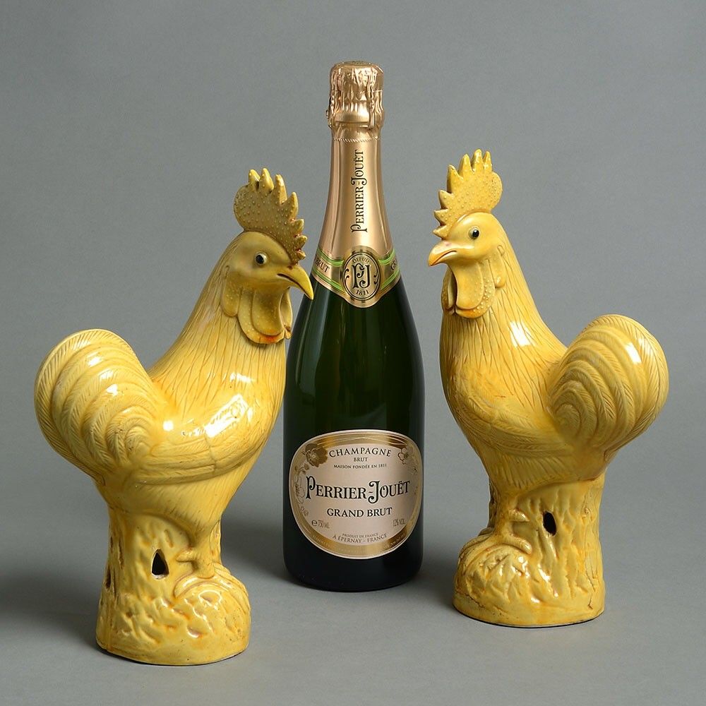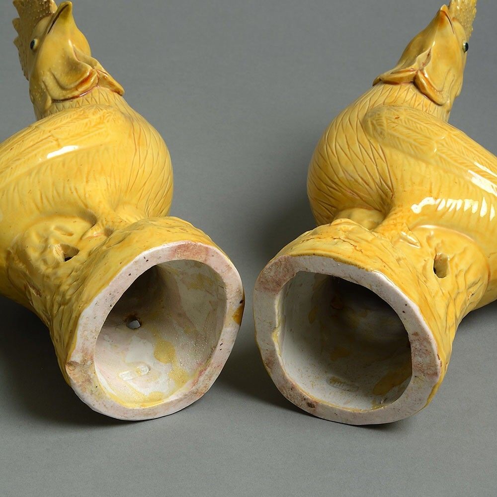 A pair of late 19th century porcelain cockerels, naturalistically modelled and painted with a yellow glaze