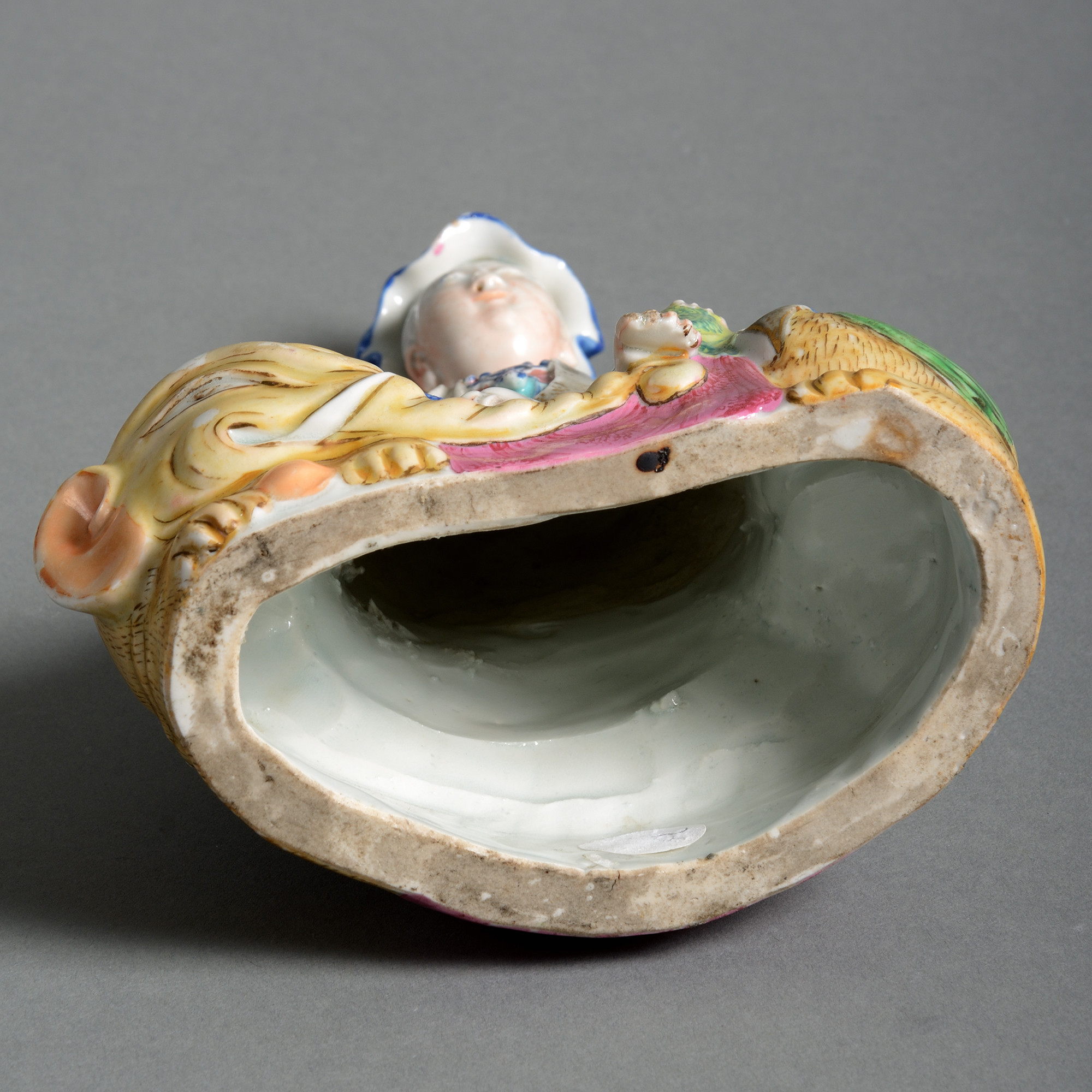 A late 19th century polychrome porcelain figure, depicted seated upon a recumbent elephant.