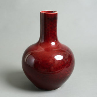 The name ‘sang de boeuf’ refers to the colour of the vase, which is French for ‘ox blood’. The difficult manufacturing process of this shade, which is achieved through an oxidisation process of iron and copper, was first recorded in China between the 11th and 13th century. European earthenware producers were not able to replicate the lengthily firing process involved in the production of sang de boeuf until the 20th century, leaving China to monopolise on such wares for centuries.