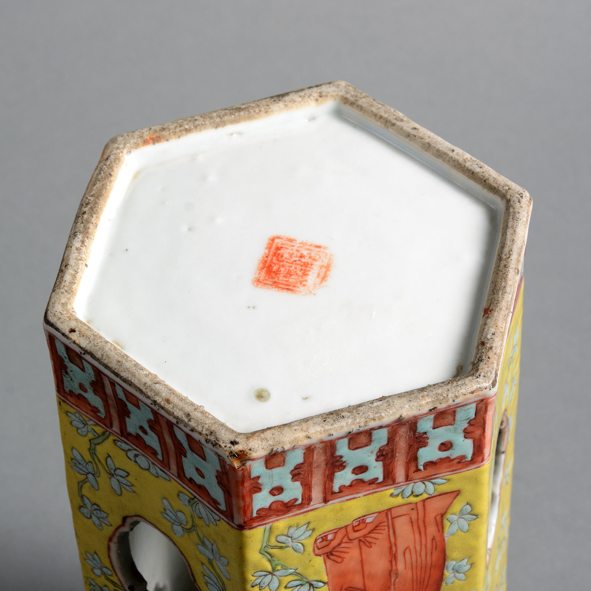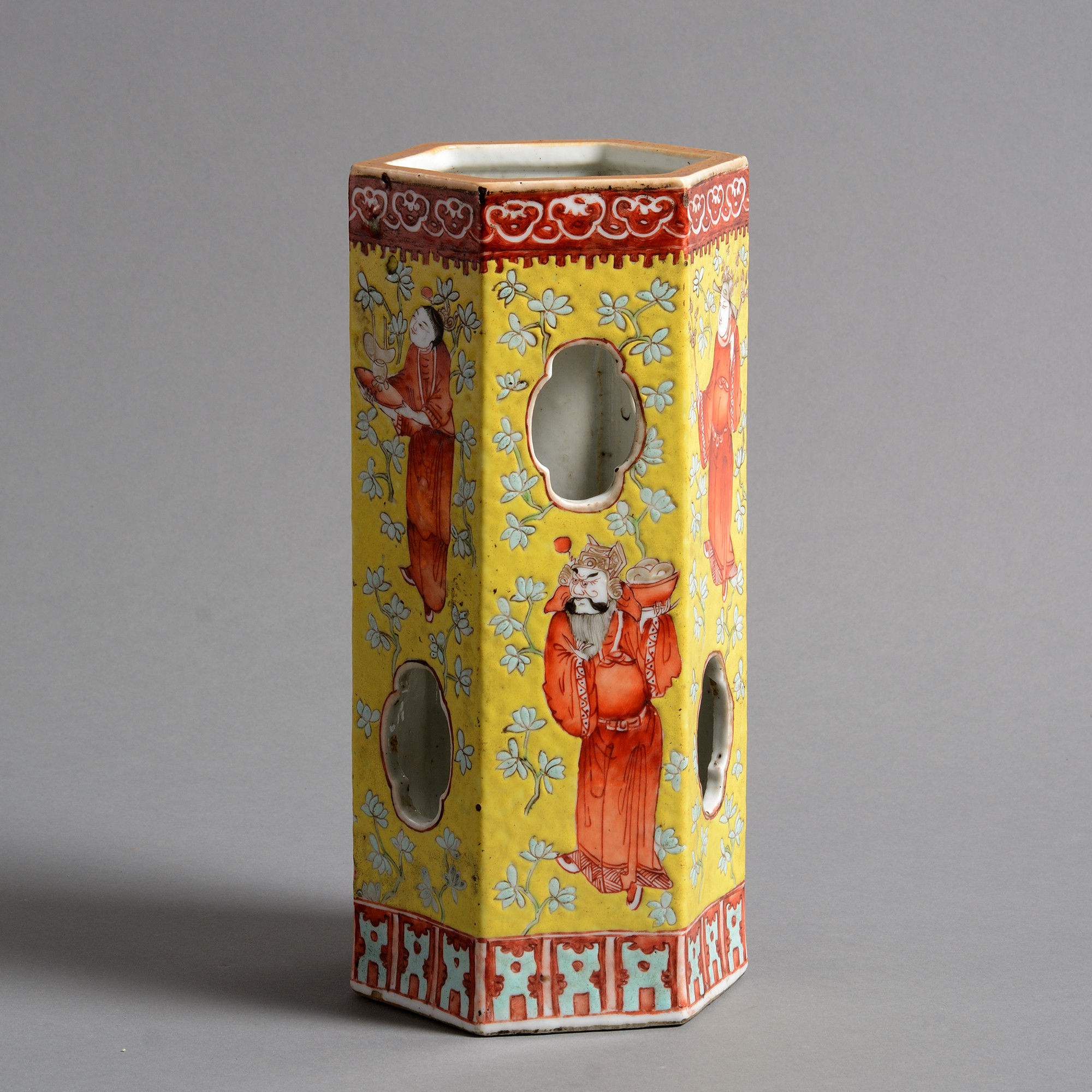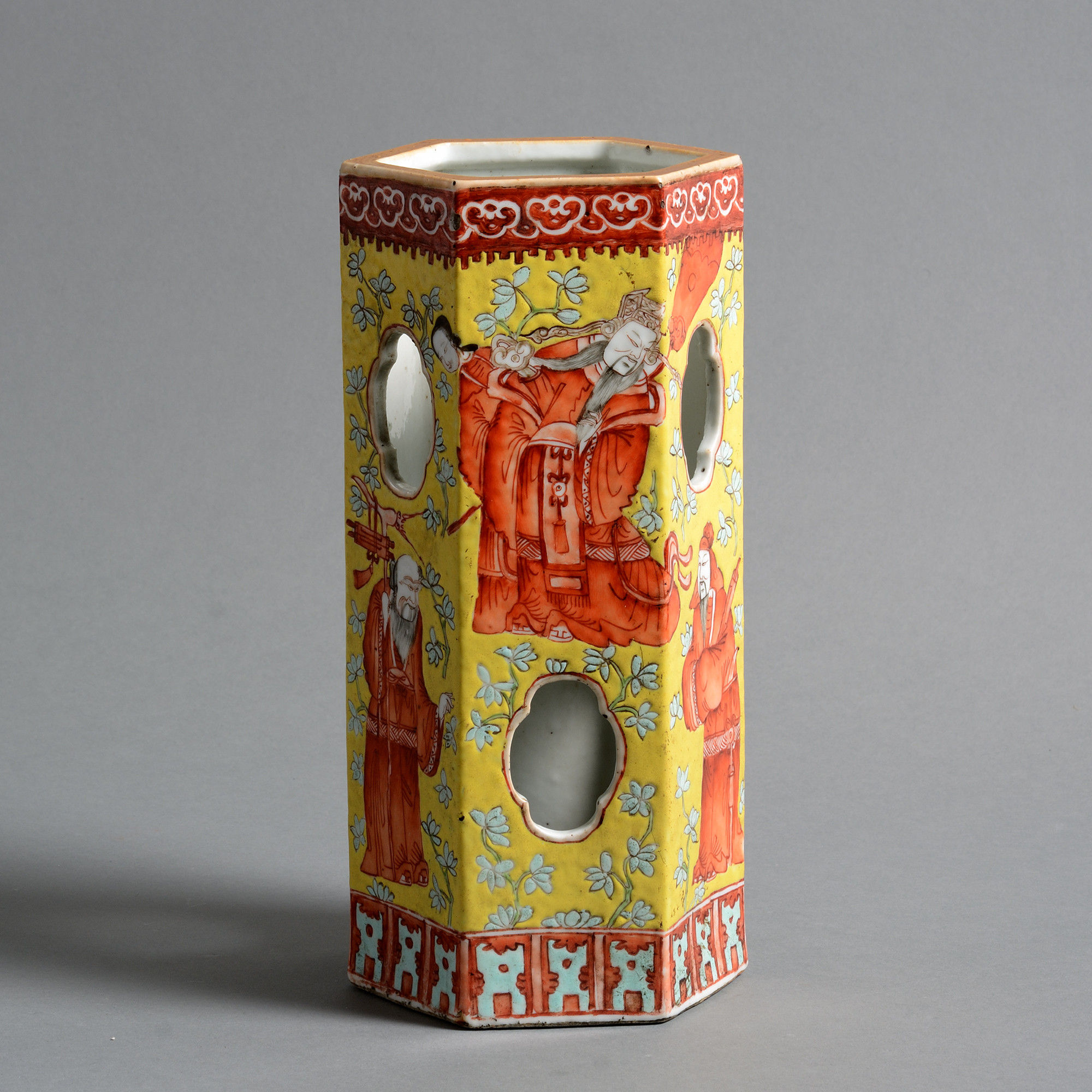 Ceramic hatstands were first produced during the Jiaqing period as tall slender objects with a number of cut-outs providing ventilation for the hat sitting on top. This hexagonal example is richly decorated in yellow, red and orange, featuring an opulently dressed person on each of the six panels.