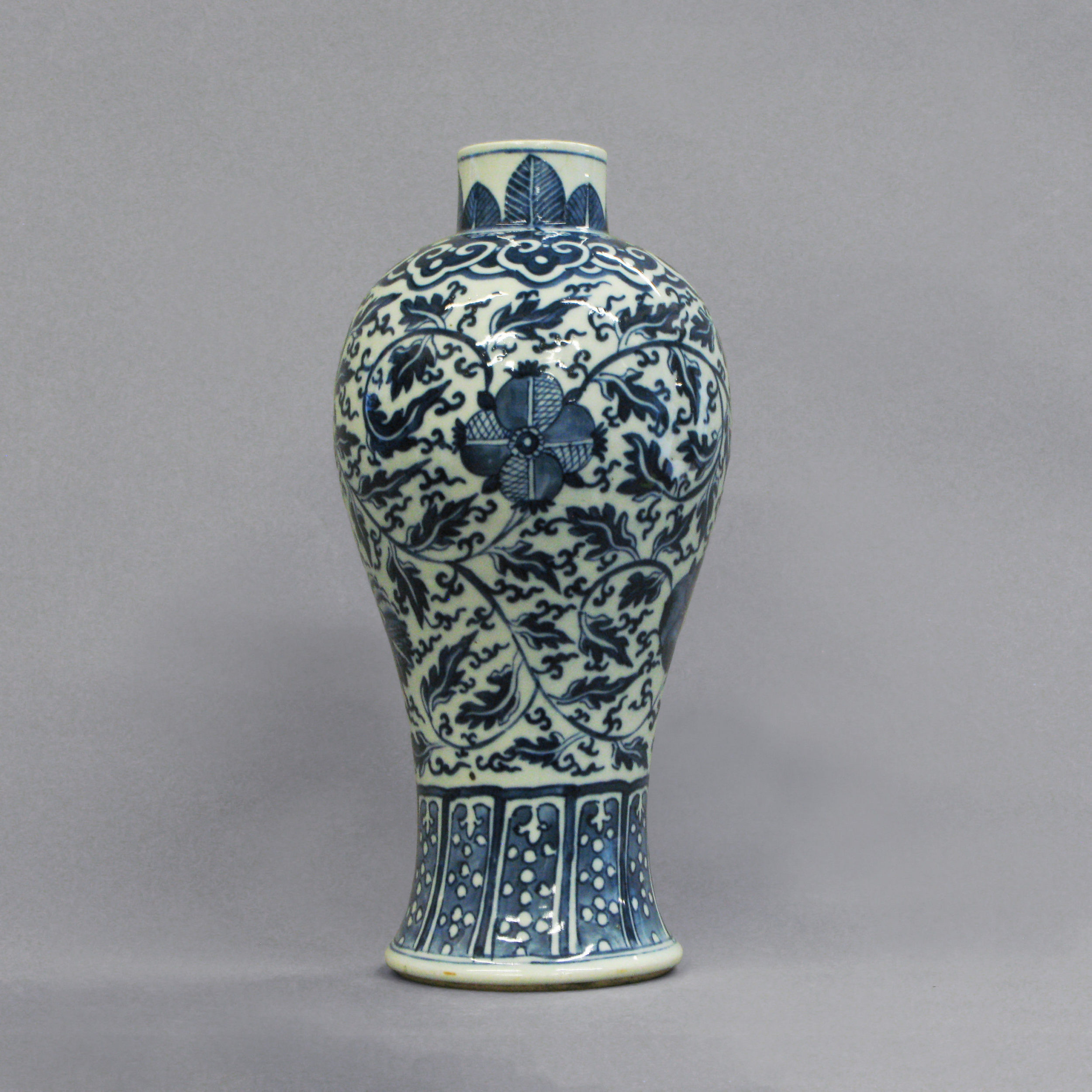 A baluster form vase decorated with blue foliage upon a white ground
