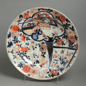 A magnificent Imari porcelain charger of exceptionally large scale, decorated throughout in red, blue, black and gold glazes upon a white ground, in the traditional manner.