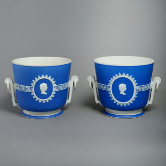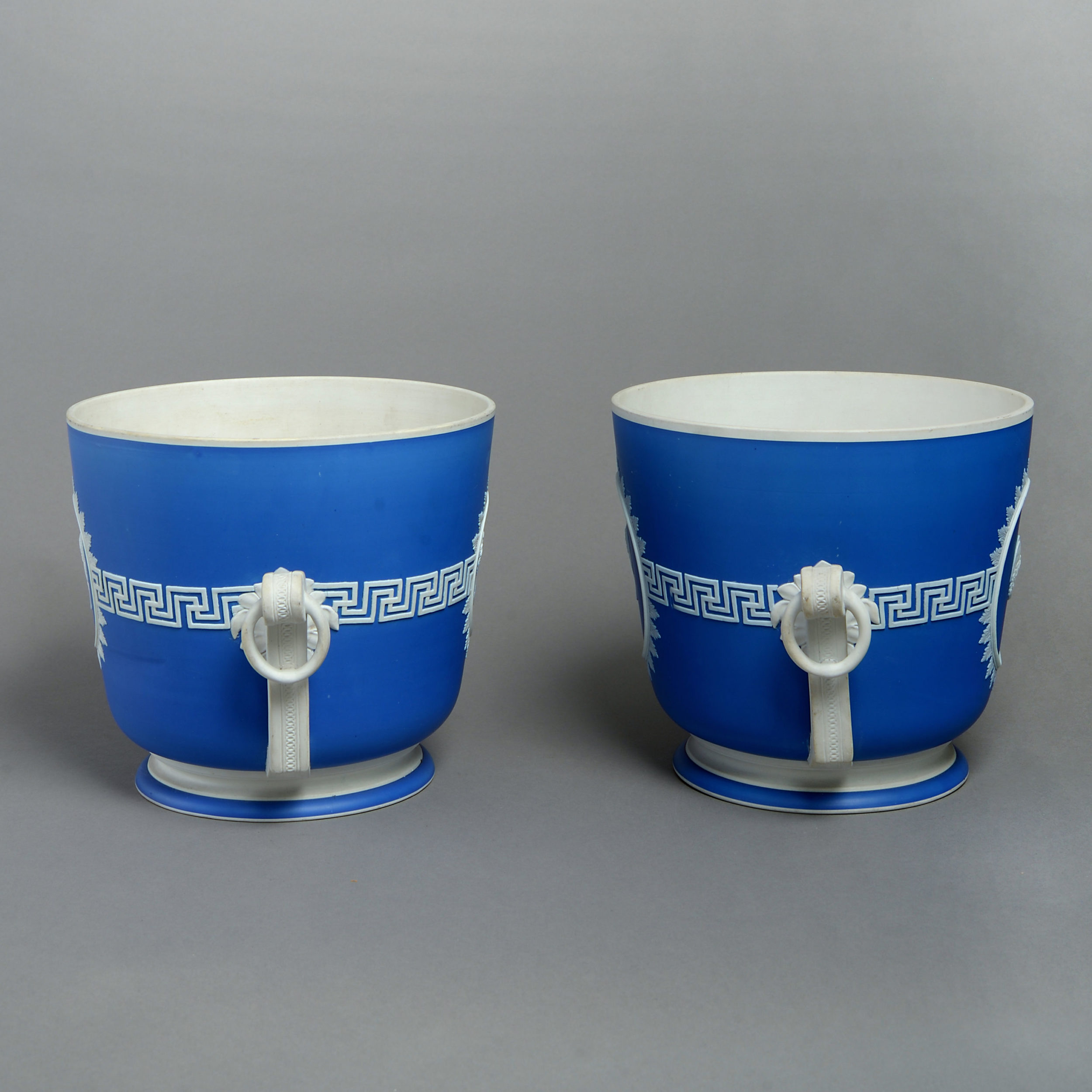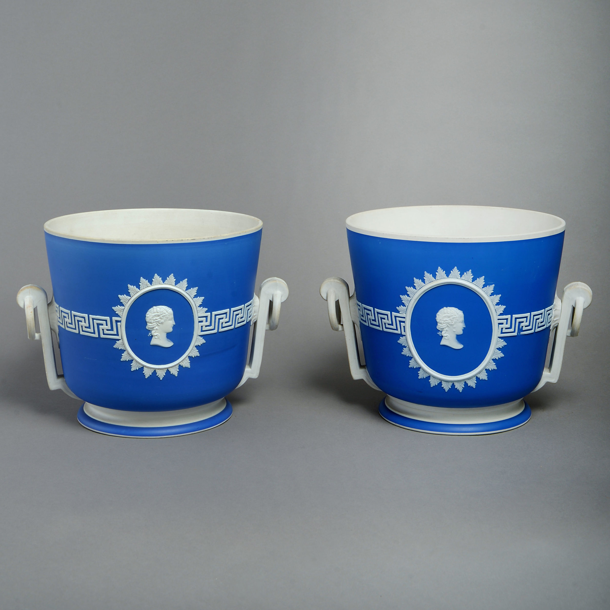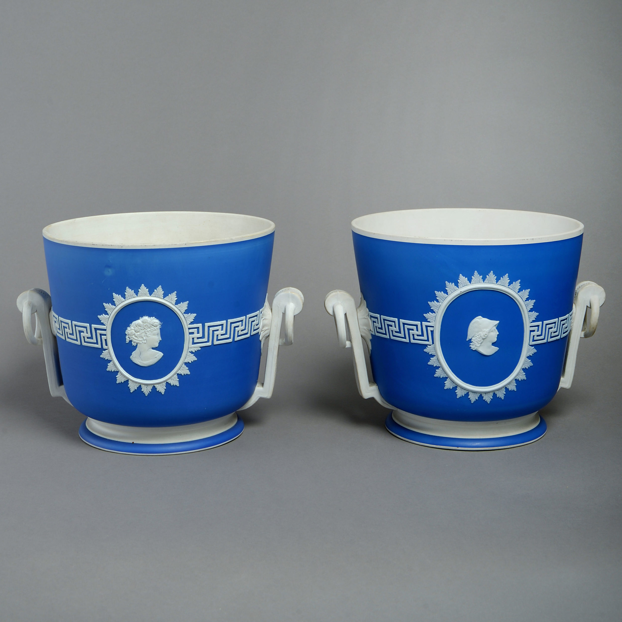 A pair of late 18th century jasperware cache pots, the blue grounds having applied decoration in the neo-classical manner of cameos within cartouches set upon bands of Greek Key.