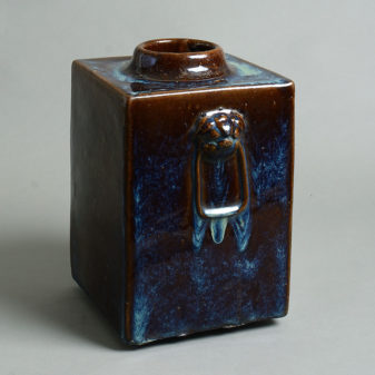 This attractive square monochrome vase is of particularly rich and exquisite colour. The glaze has an organic feel to it as the colours blend into one another like oil, catching the light. Faux Fu lion and ring handles to either side are the only ornamentation upon this piece.