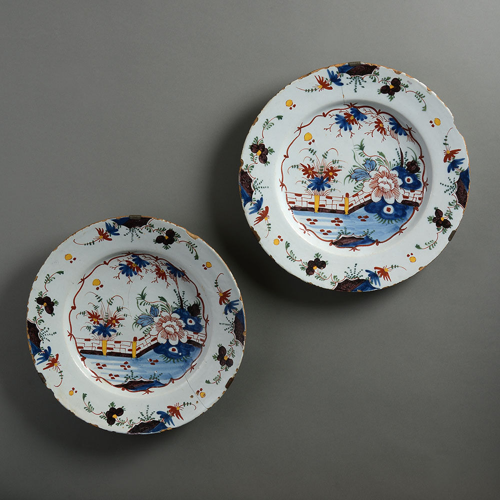 A pair of large scale Delft chargers, with polychrome glazes, with floral decoration in the chinoiserie manner.