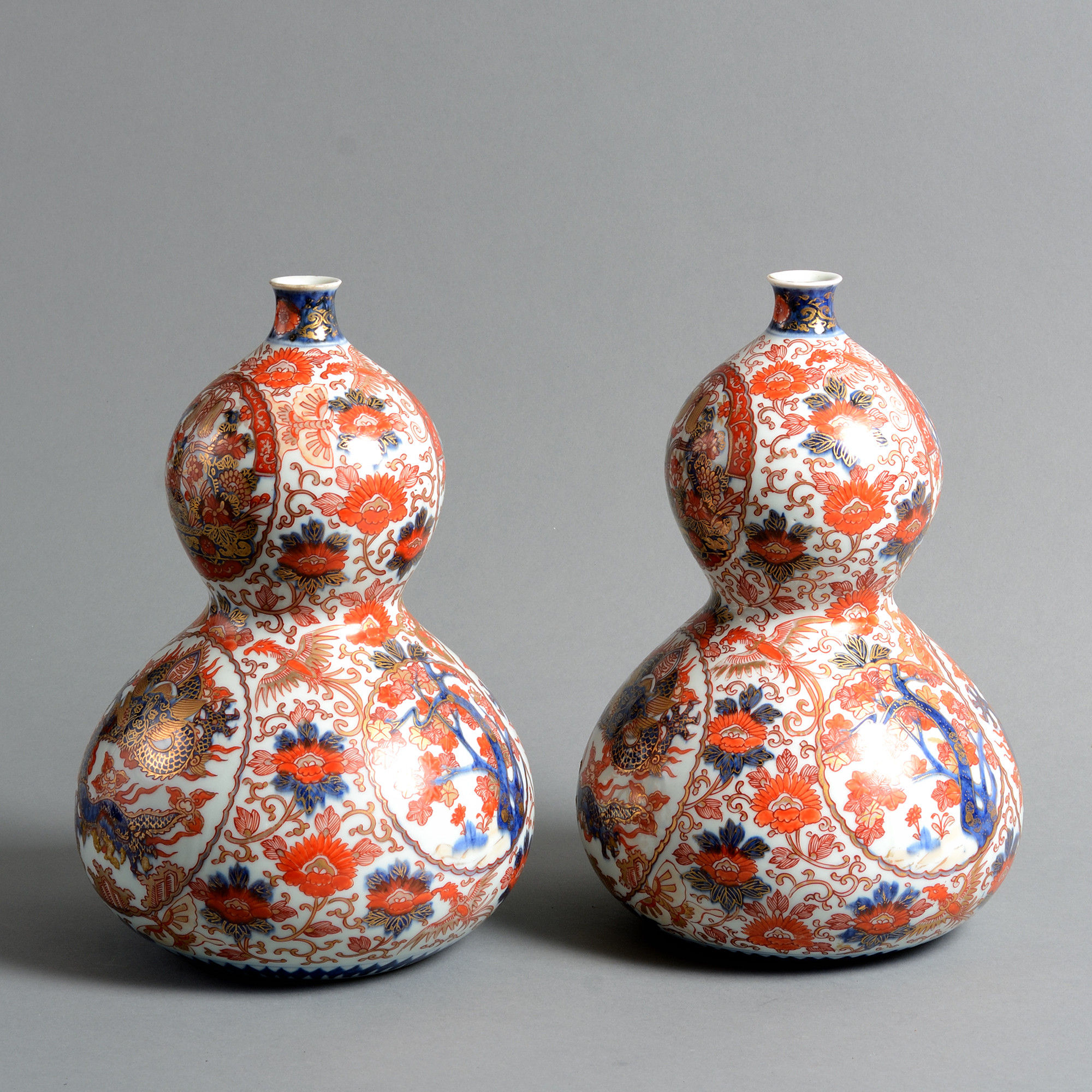 A fine pair of 19th Century Meiji Period vases of double gourd form, the bodies profusely decorated with red, blue and gold glazes upon a white ground.