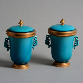 A fine pair of late 19th century Samson porcelain vases and covers, having turquoise glazes and mounted with ormolu finials, rims and bases.