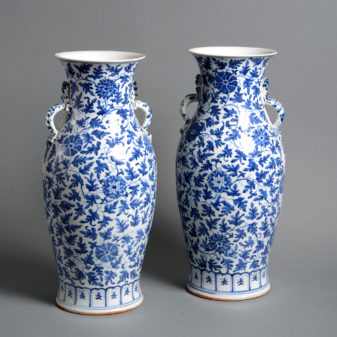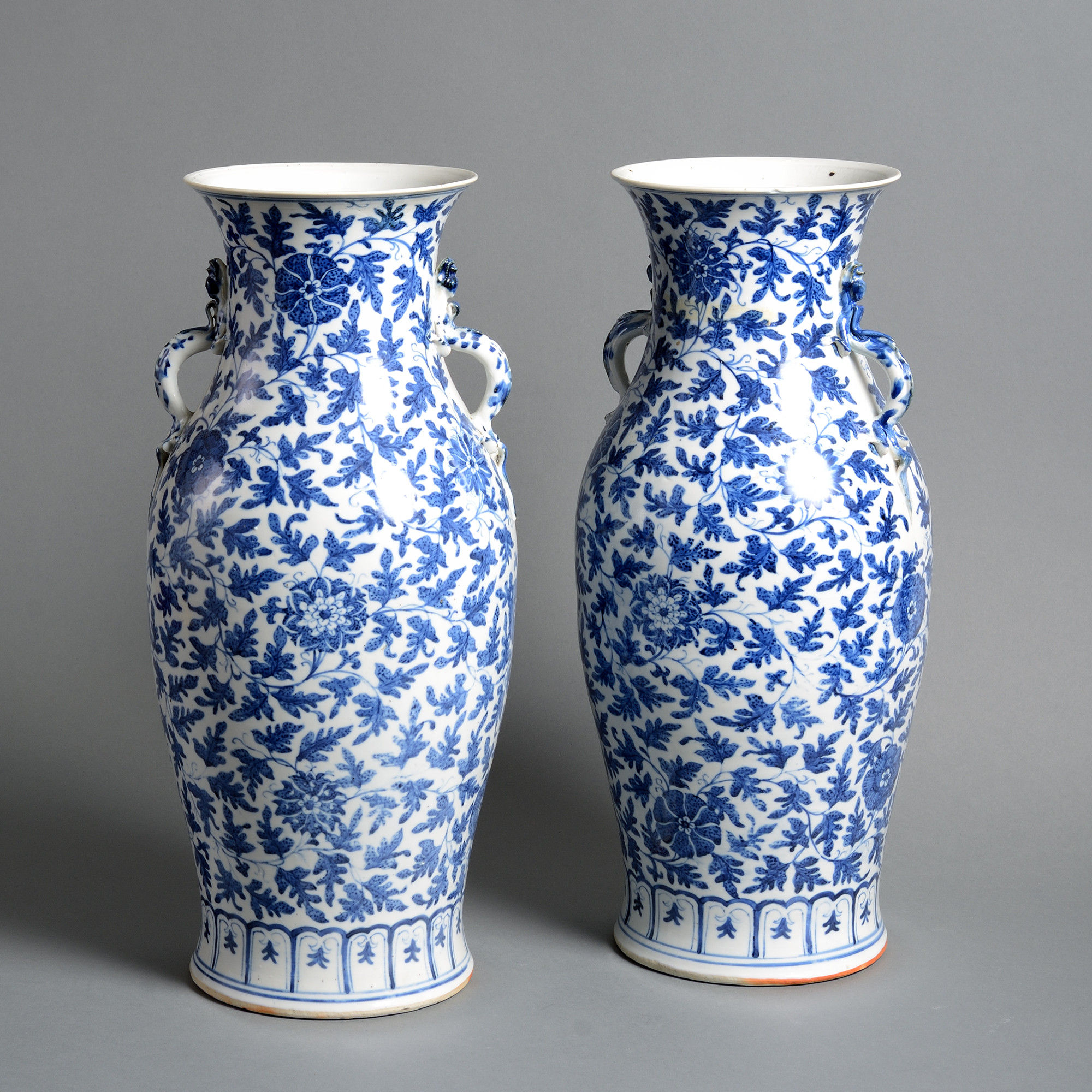 A fine late 19th century pair of blue and white porcelain vases of good scale, with dragon handles and decorated throughout with foliage.