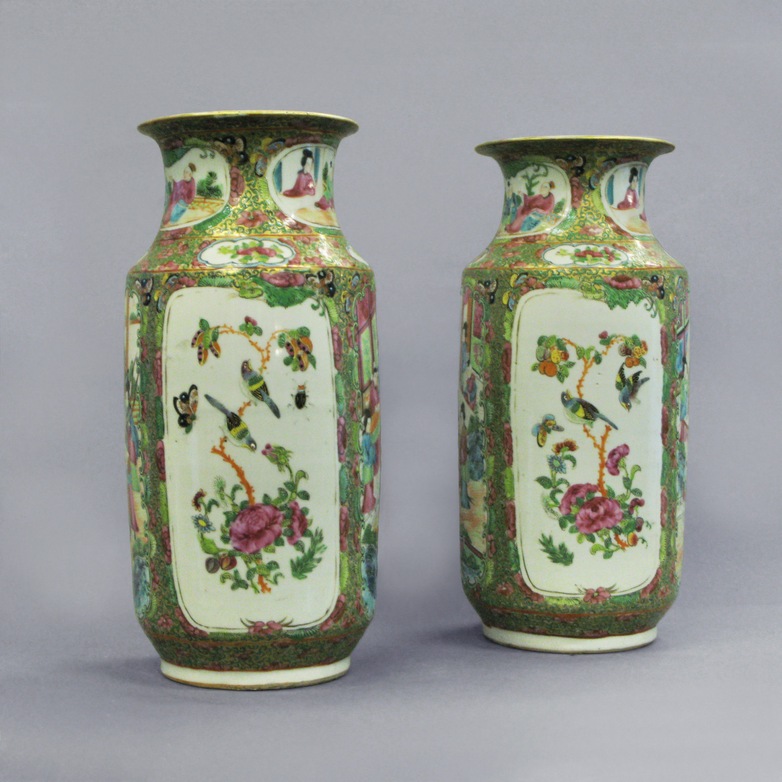 A pair of nineteenth century Canton vases decorated throughout with stylised birds, flowers and insects.