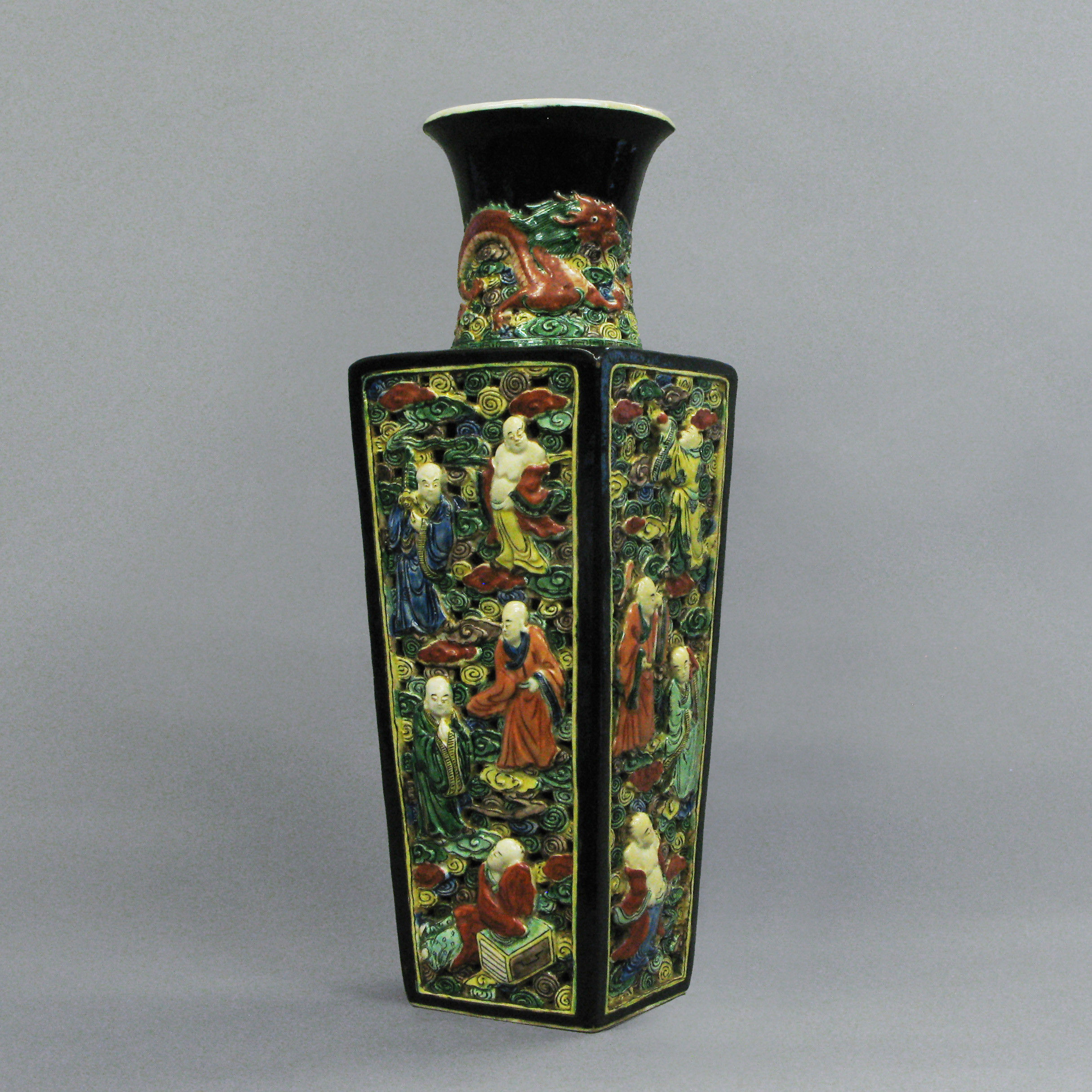 A famille noire vase of square tapering form the side panels pierced with figurative scenes.