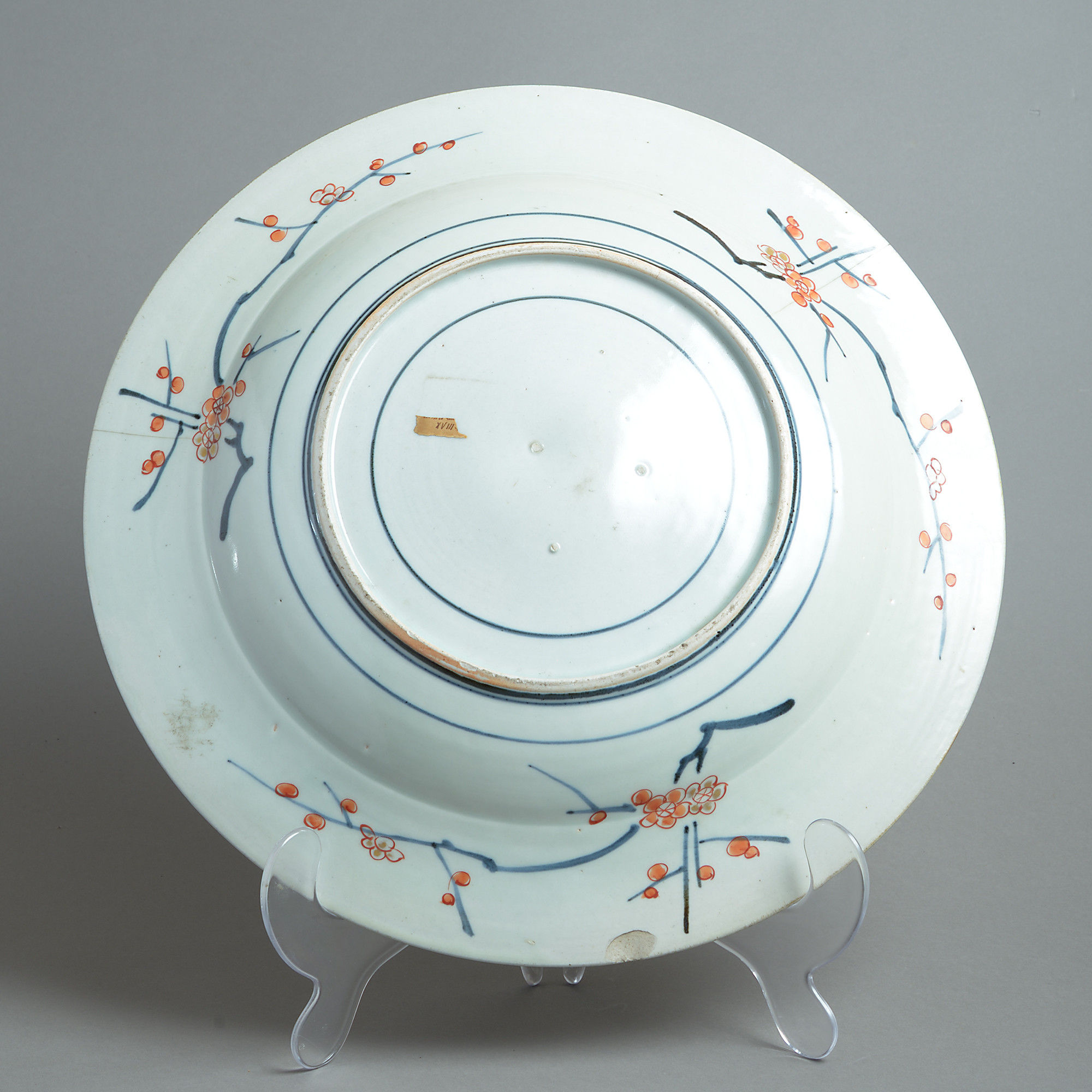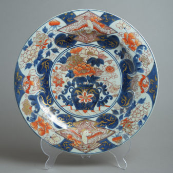 An early 18th century Imari charger of good scale, the central cartouche decorated with flowers in a vase, having a floral border with stylised birds of prey, all executed in red, blue and gold glazes upon a white ground.