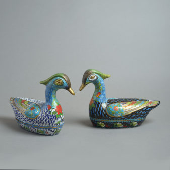 A late 19th century pair of cloisonné boxes taking the form of ducks, the lids lifting to reveal turquoise enamelled interiors.