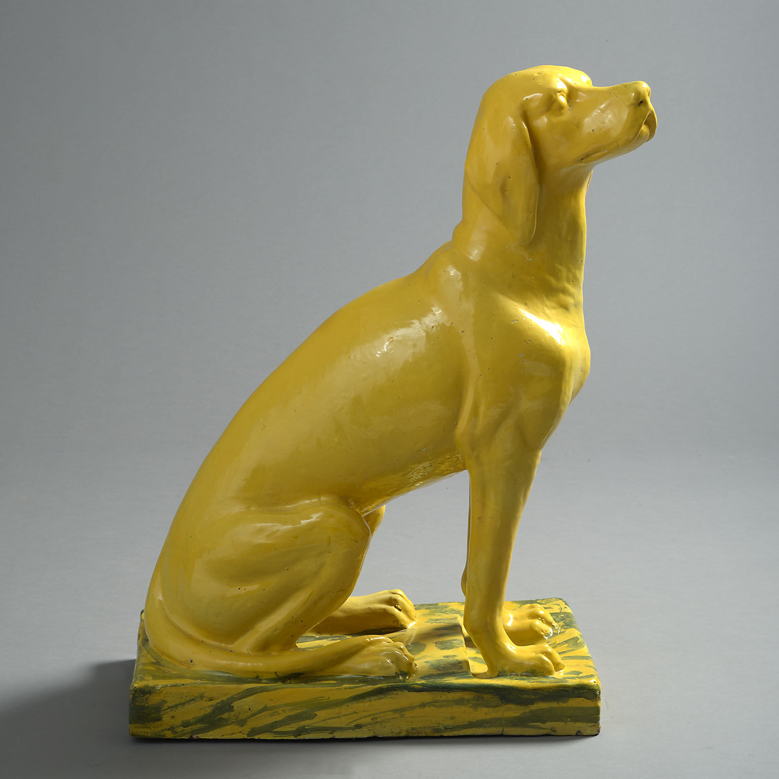 A bright, lifesize yellow glazed canine modelled in a majestic, seated position on a yellow and blue marbled base, the base restored.