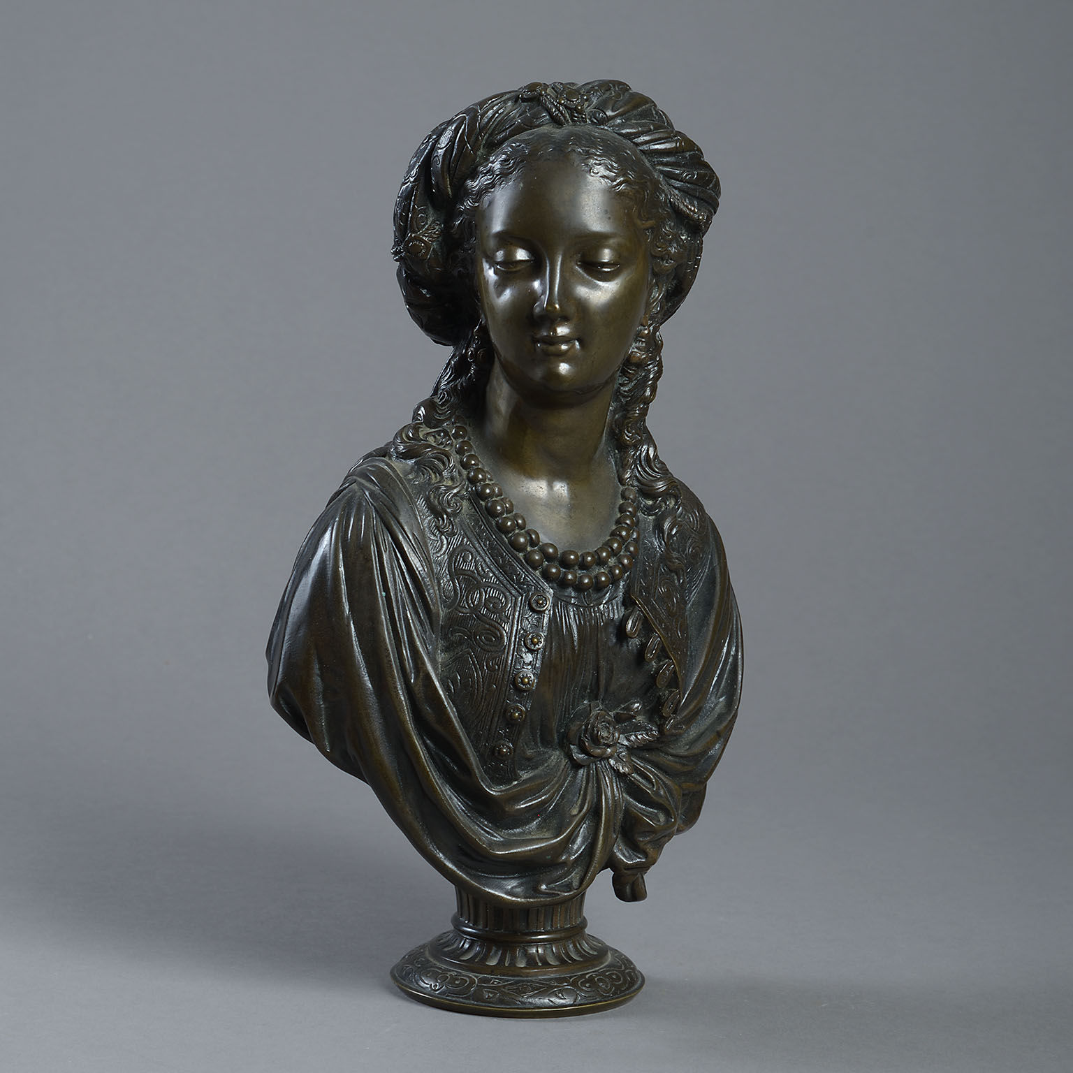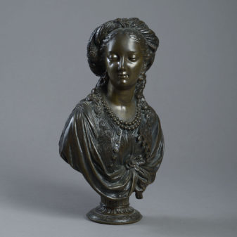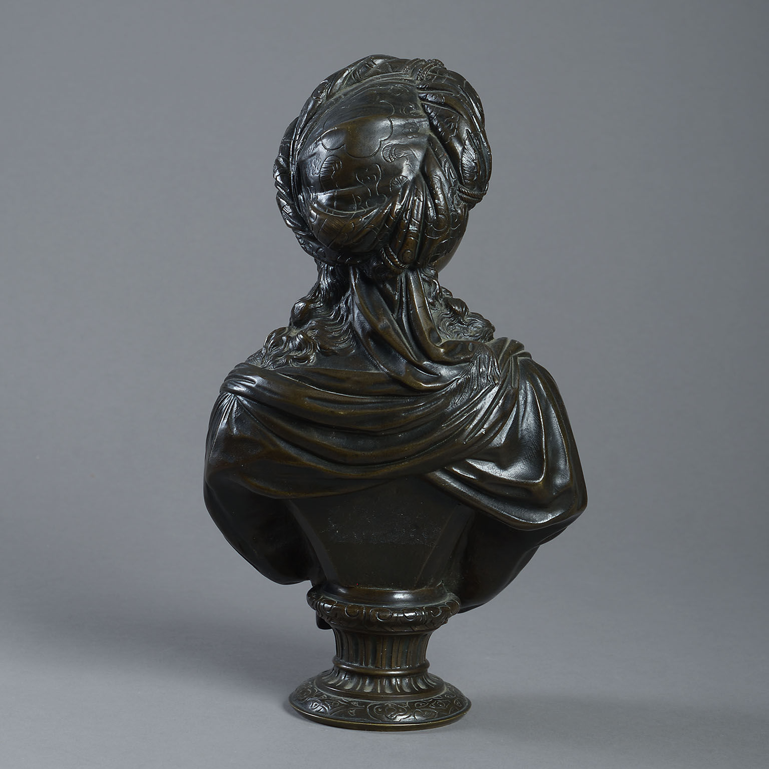19th Century Bronze Bust after Boizot depicting a lady wearing oriental dress modelled in exquisite detail in the Louis XVI style and with a wonderful patination.