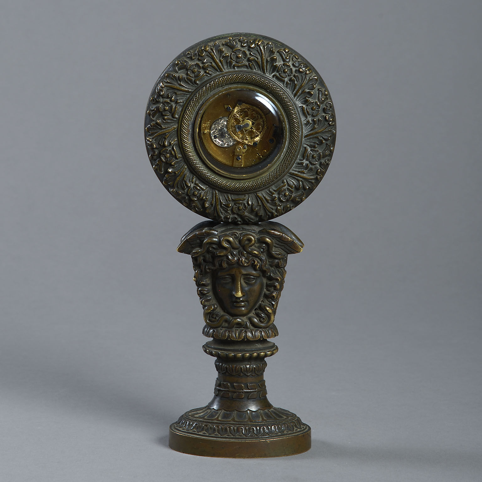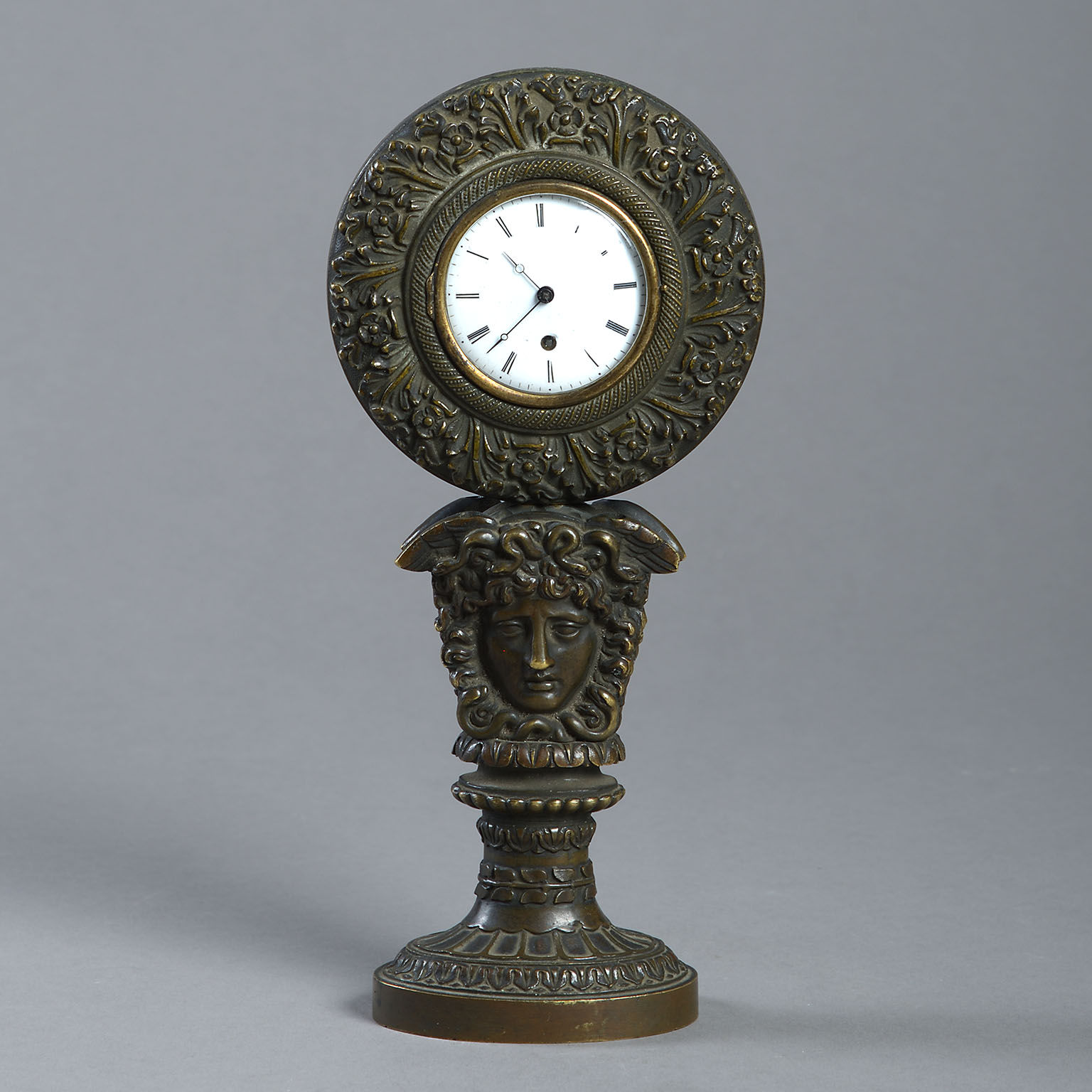 The circular white enamel dial contained within a leaf-cast frame enclosing the watch movement and supported by a Medusa mask on pedestal
