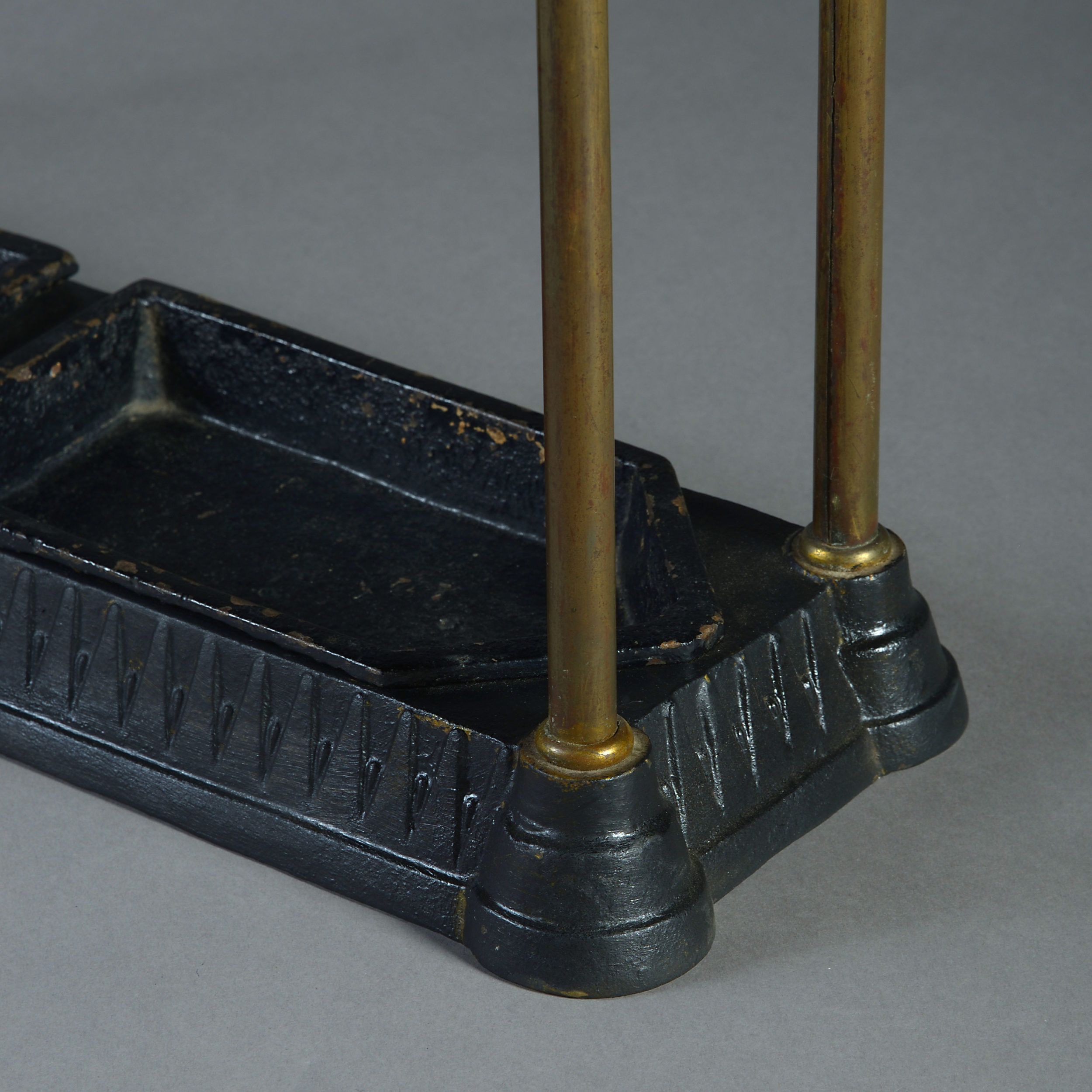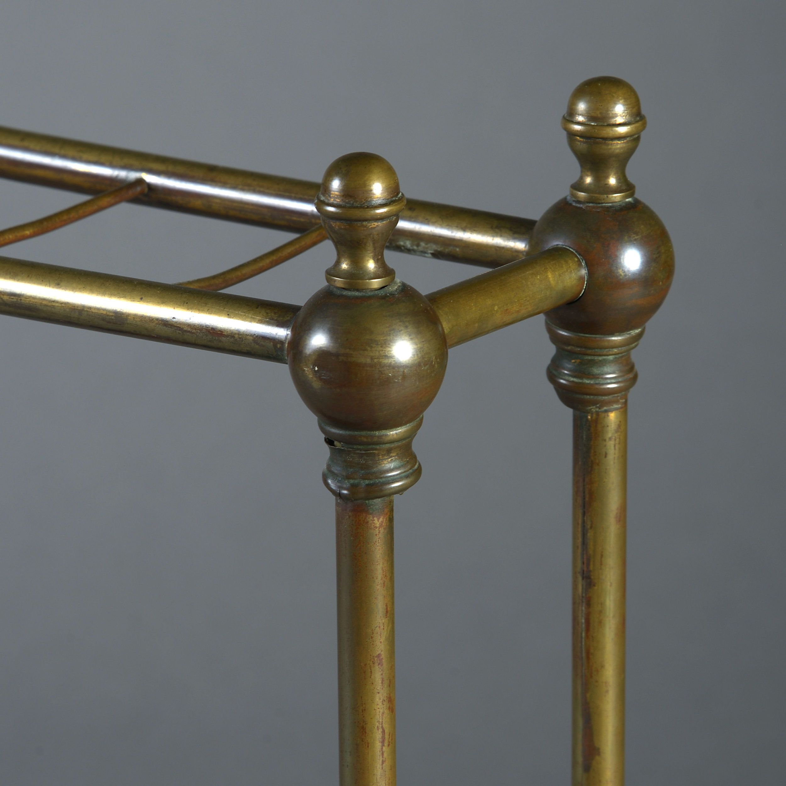 A late nineteenth century brass stick stand, having ball finials, six square divisions and retaining the original cast iron drip pans.