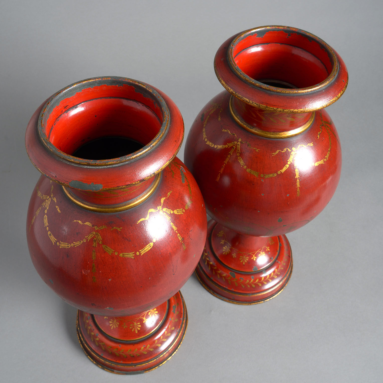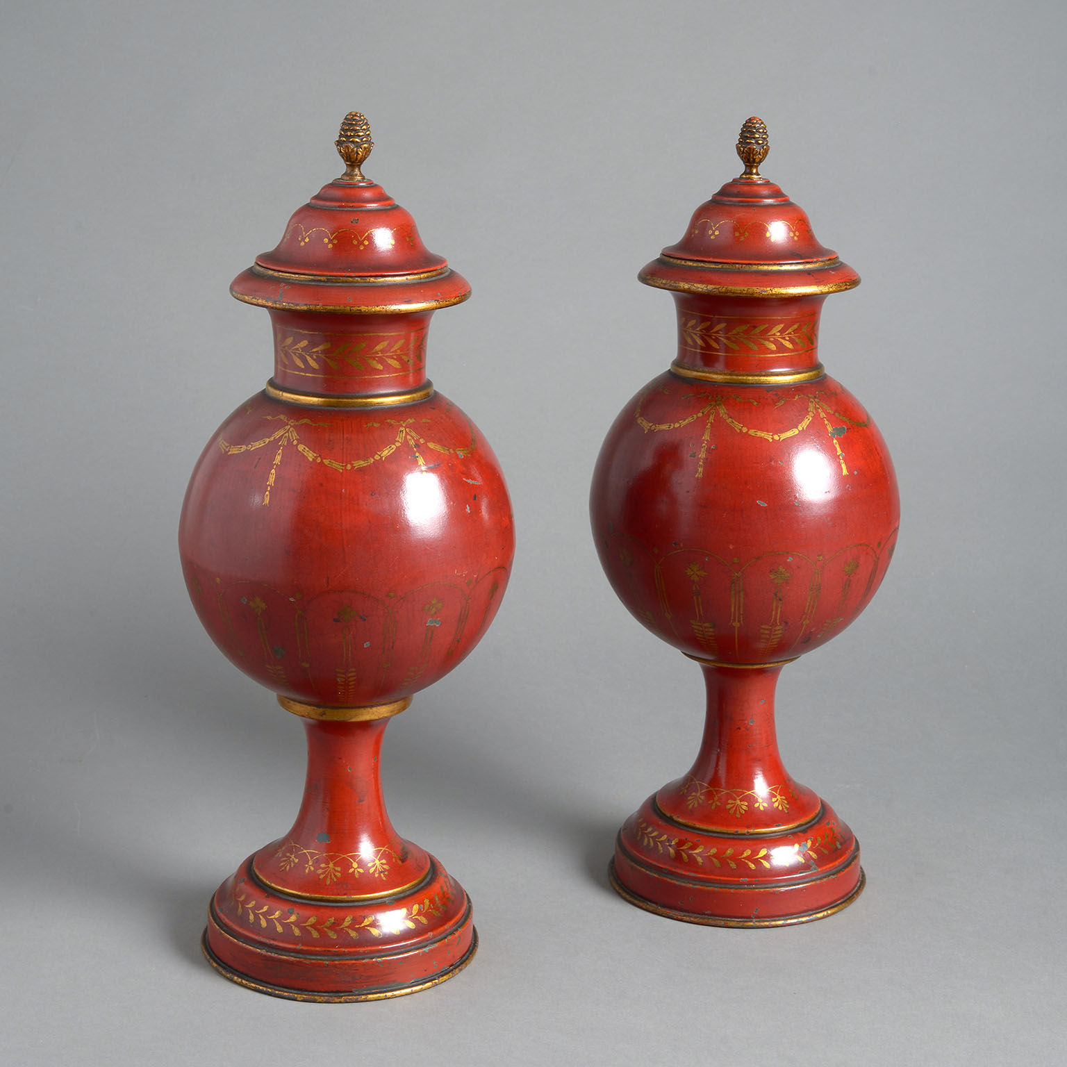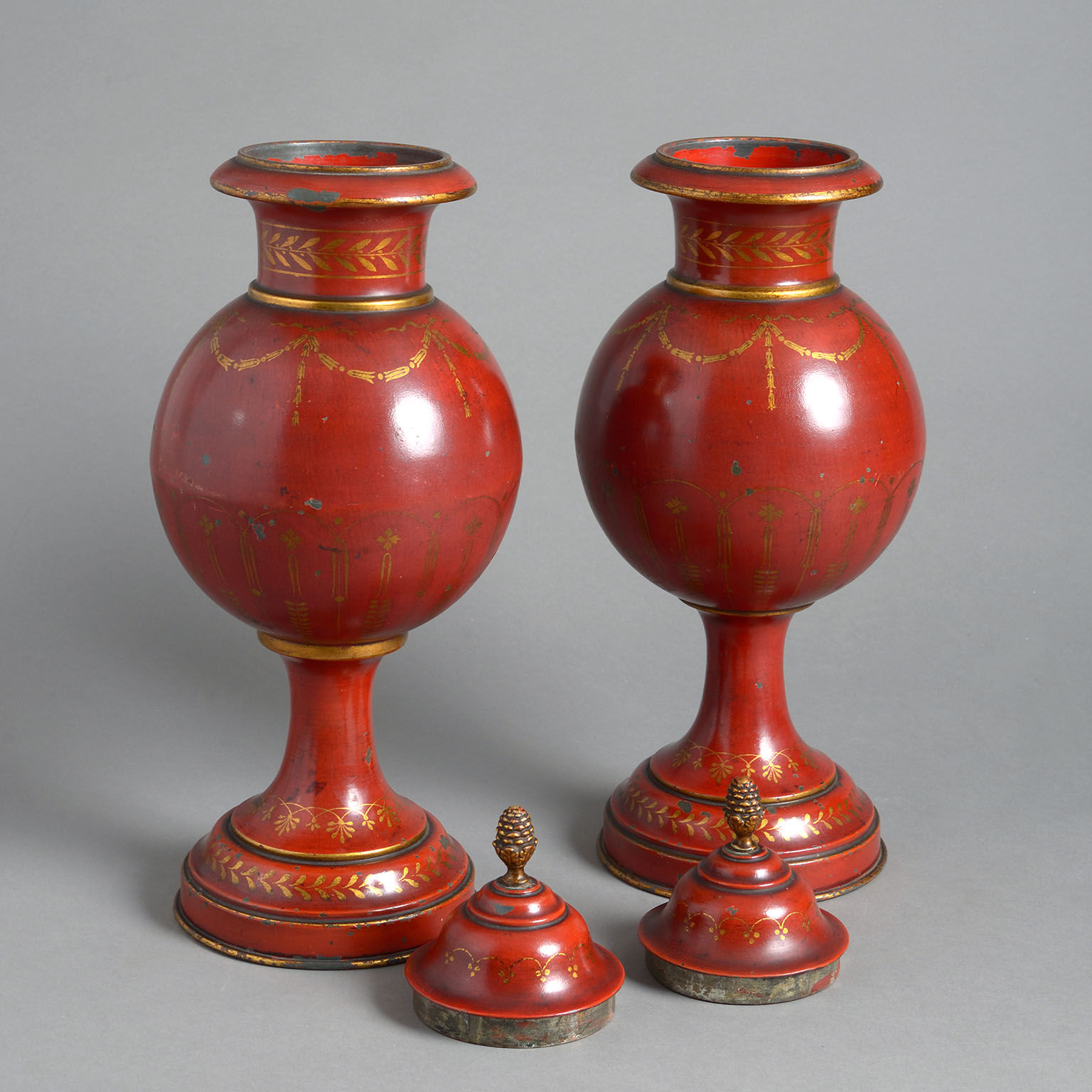 A Pair of Late 19th Century Red Tolewear Covered Urns decorated with gold swags on a bright red ground below a domed cover with acorn finial and standing on flared, weighted bases with gold wreath decoration.