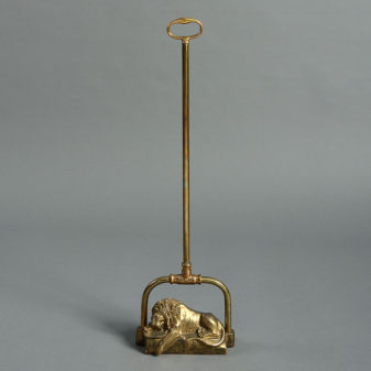 A rare nineteenth century brass door porter of tall scale, having a finely cast and chased lion dormant weight, beneath a long stem and carrying handle.