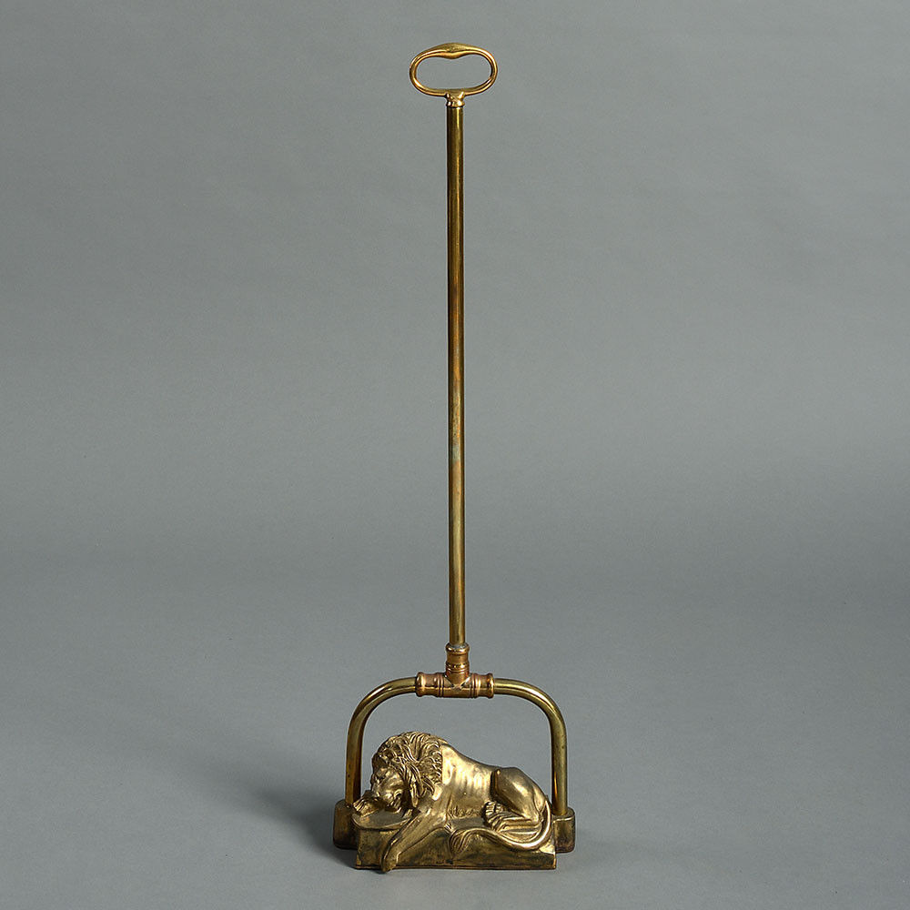 Elaborate doorstops (or Door Porters as grander models such as this are often described) have played an important role in the English interior the early Victorian period. Foundries created extraordinary forms, cast in brass, often with iron weights, to hold open the heavy mahogany doors of important houses throughout the Kingdom. Firms such as William Tonks & Sons and Voysey produced large catalogues detailing a variety of forms, some animate; others purely sculptural or architectural. Heraldic and Classical references are often present as in this example.