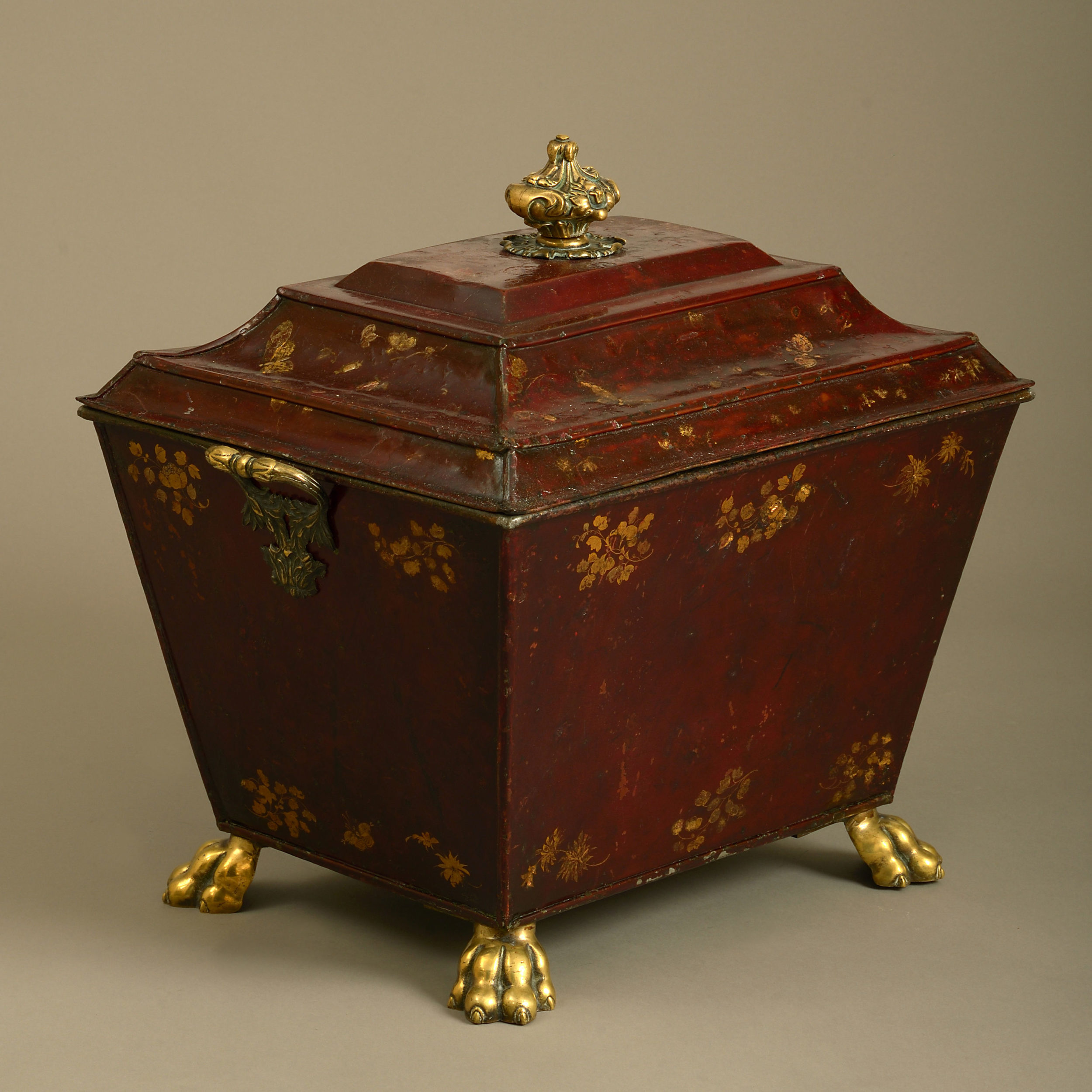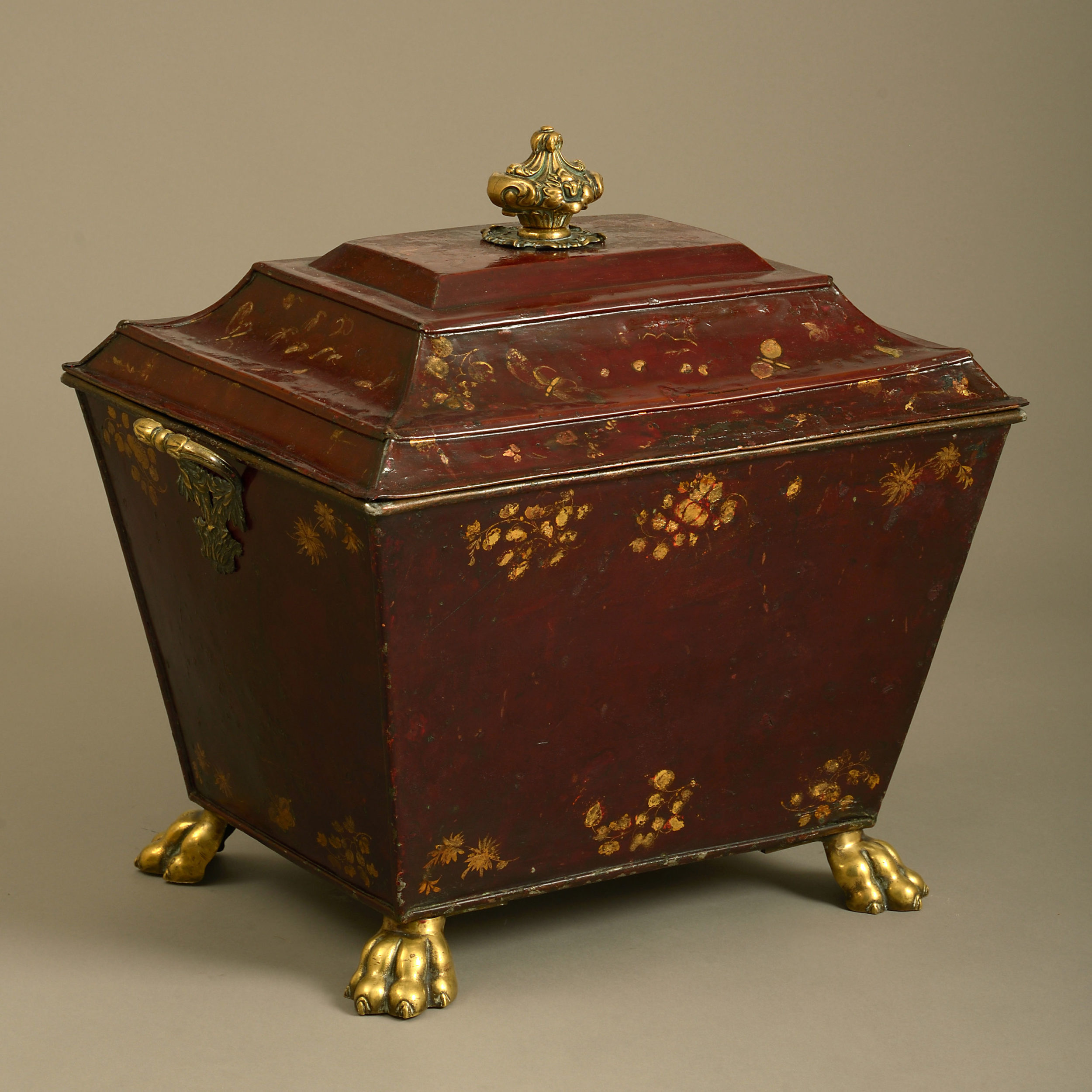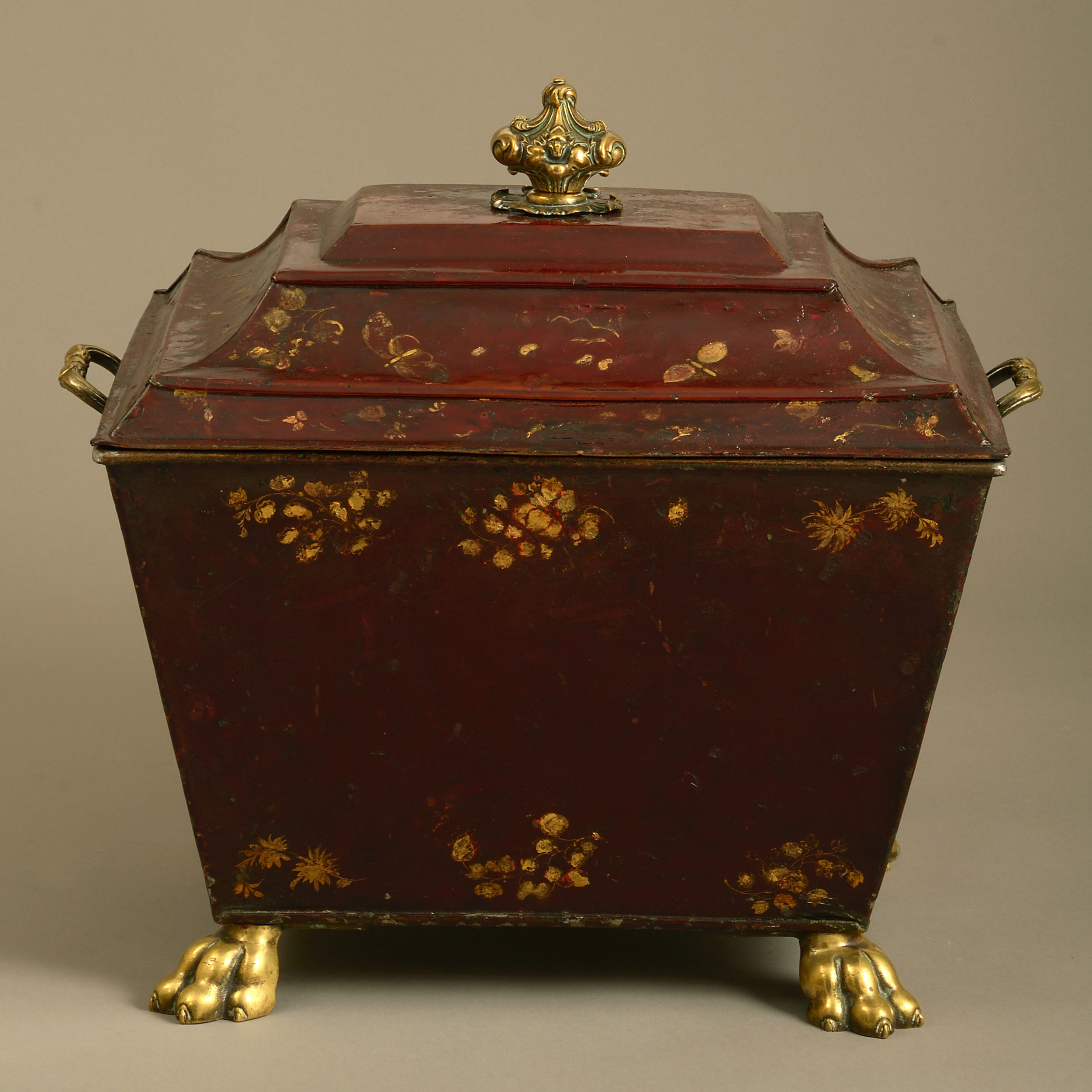 A fine early 19th century Regency Period tole coal bin decorated throughout with gilded butterflies, flowers and foliage upon a dark red ground, the lid having a finely cast knop, the body with carrying handles and lions paw feet of the same.