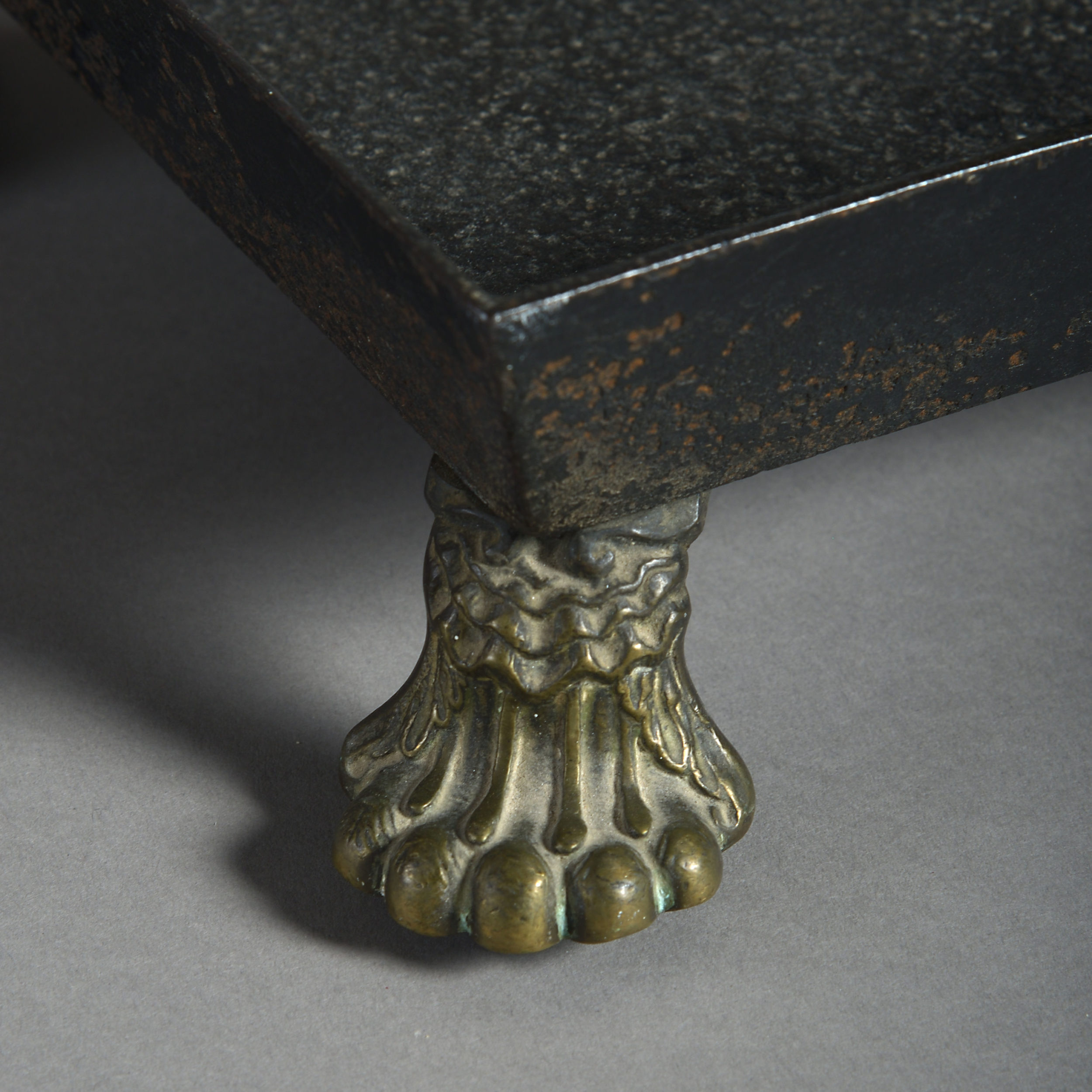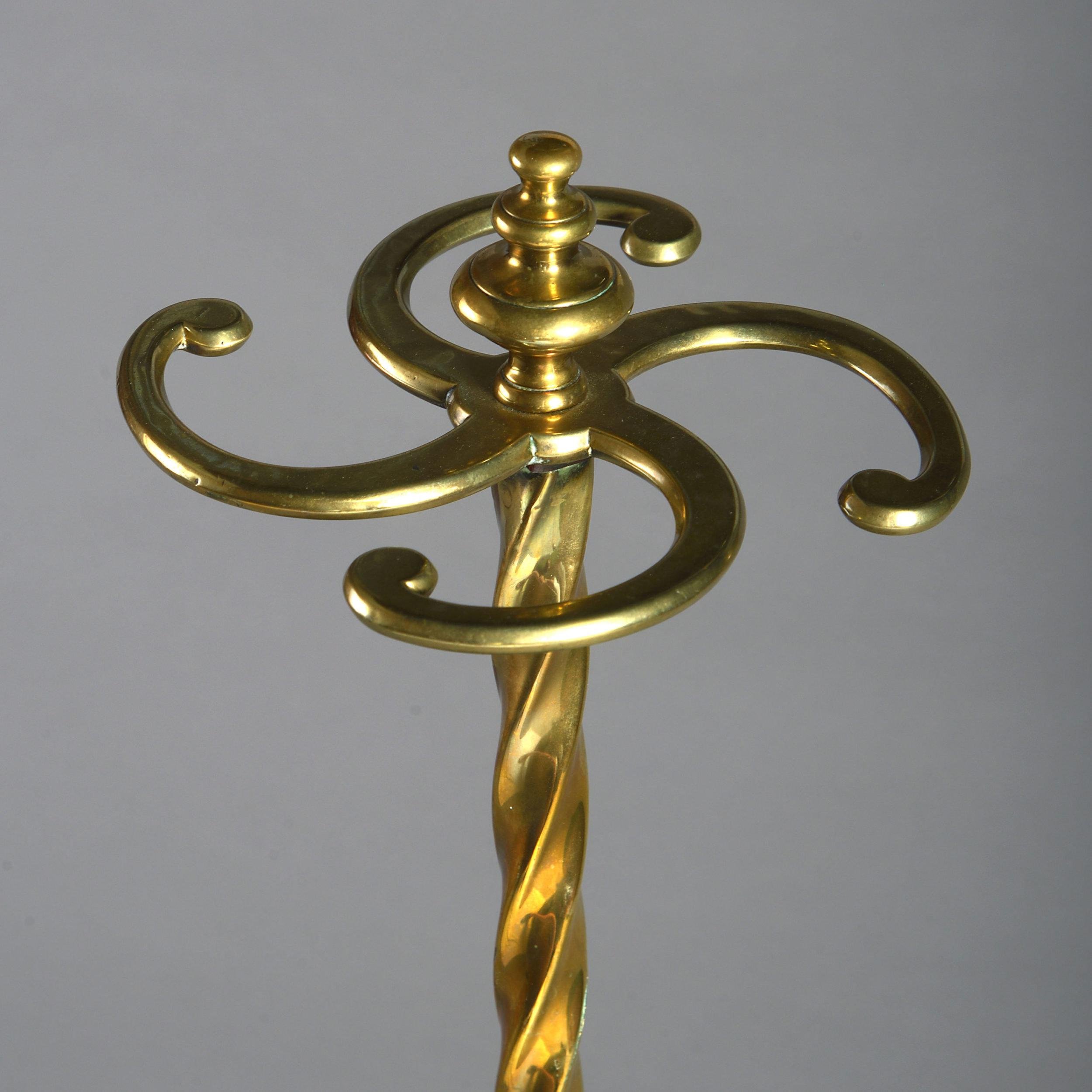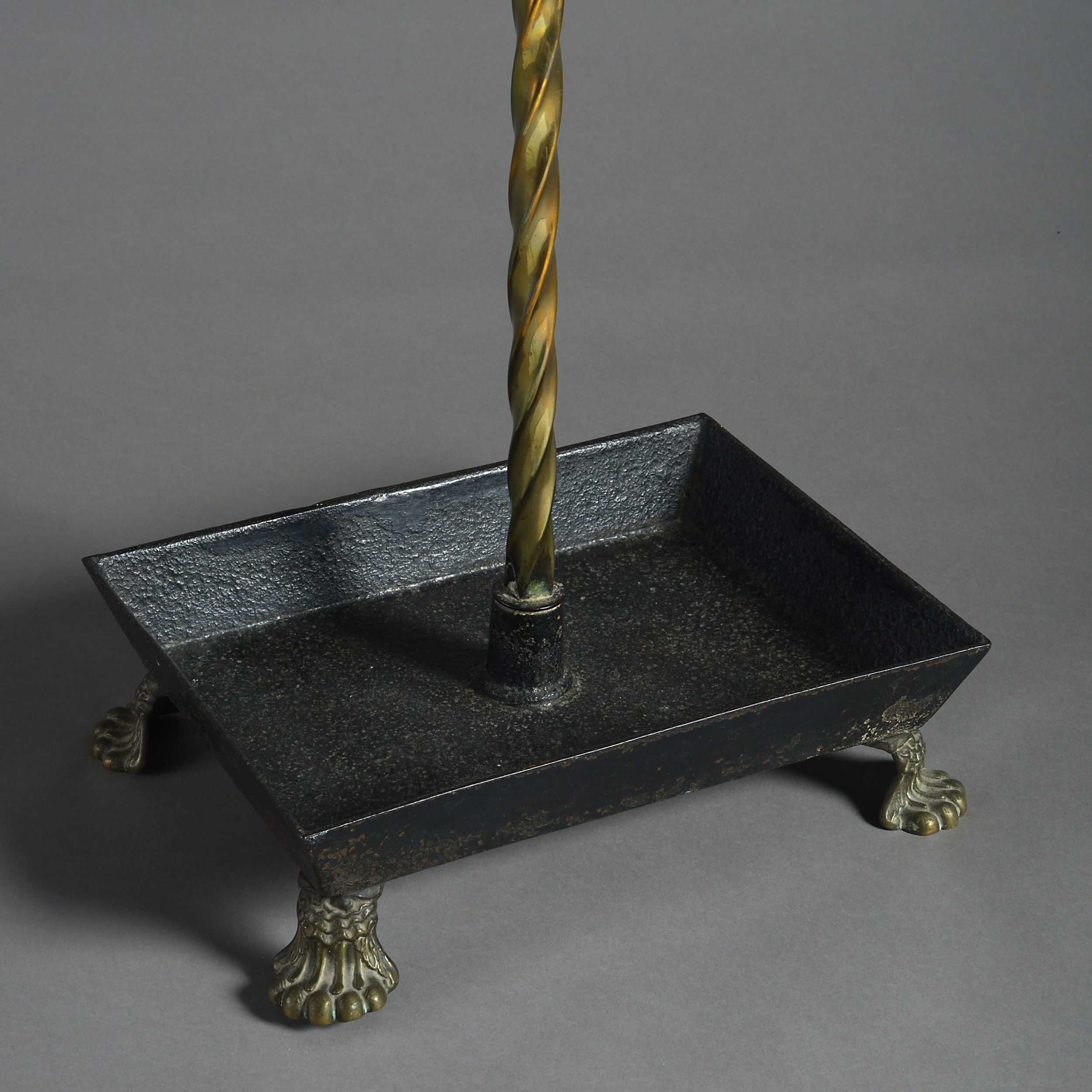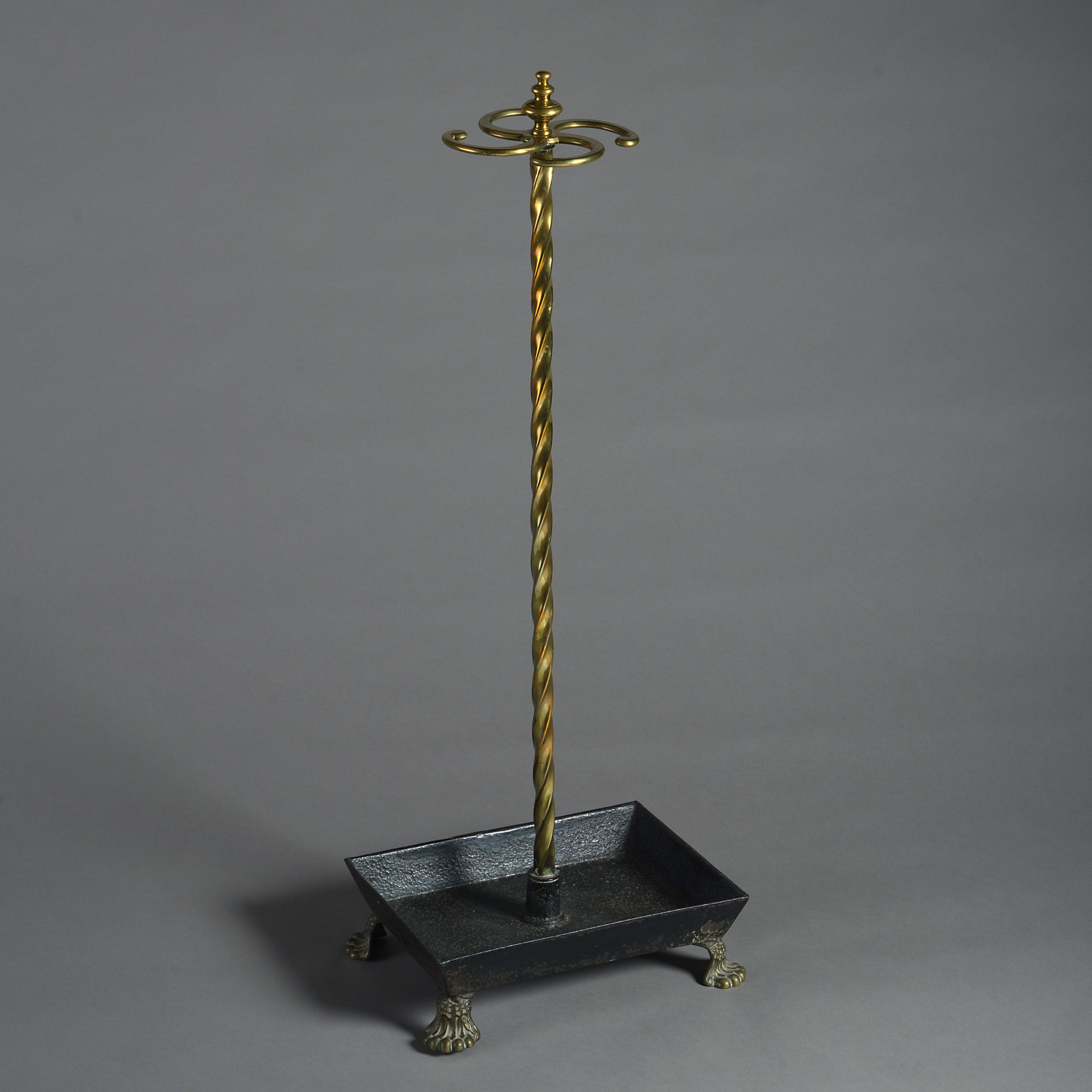 A fine and unusual tall Victorian brass stick stand, the four scrolling divisions, with turned finial, surmounting a twisted shaft and set upon a cast iron drip tray, terminating in four brass hairy paw feet.