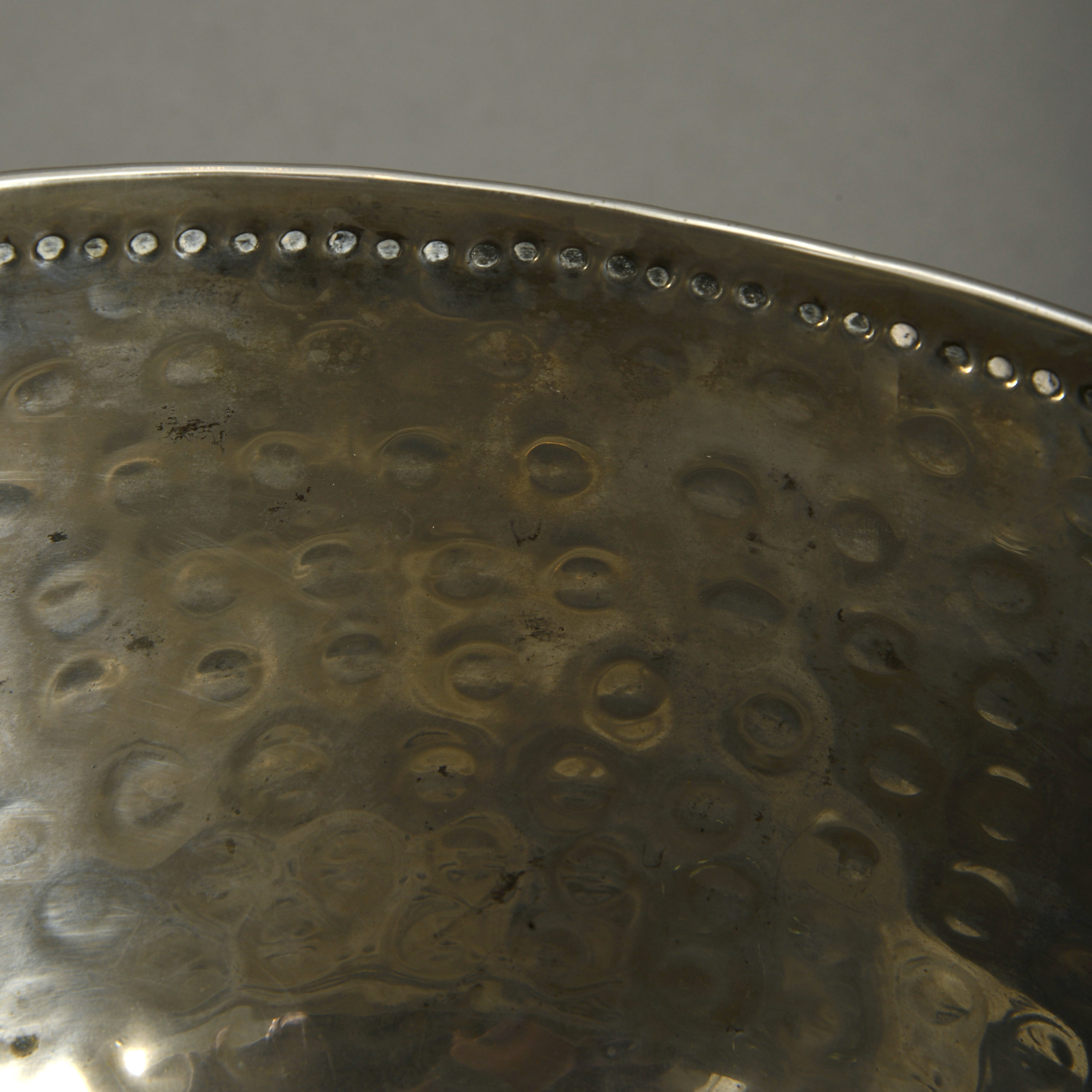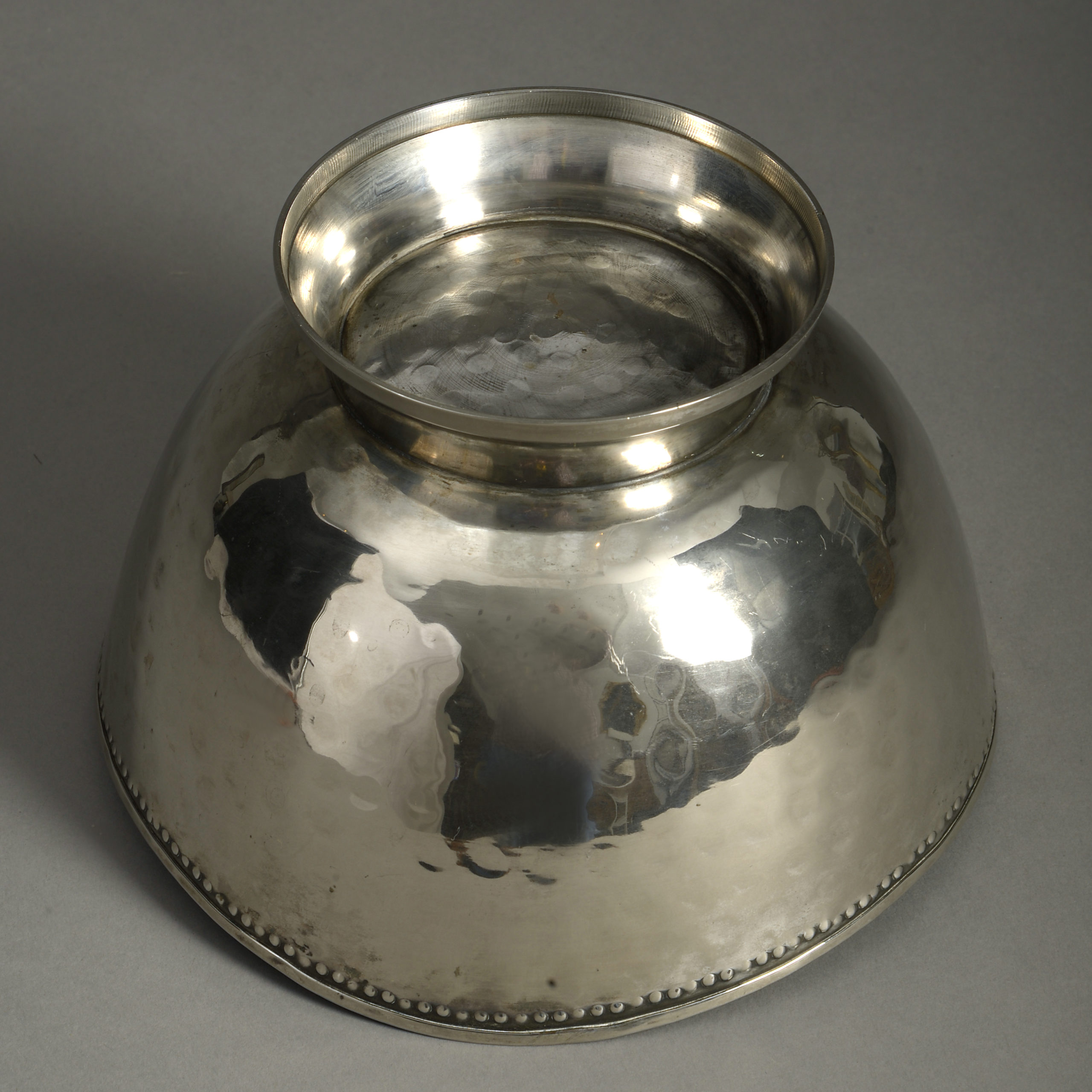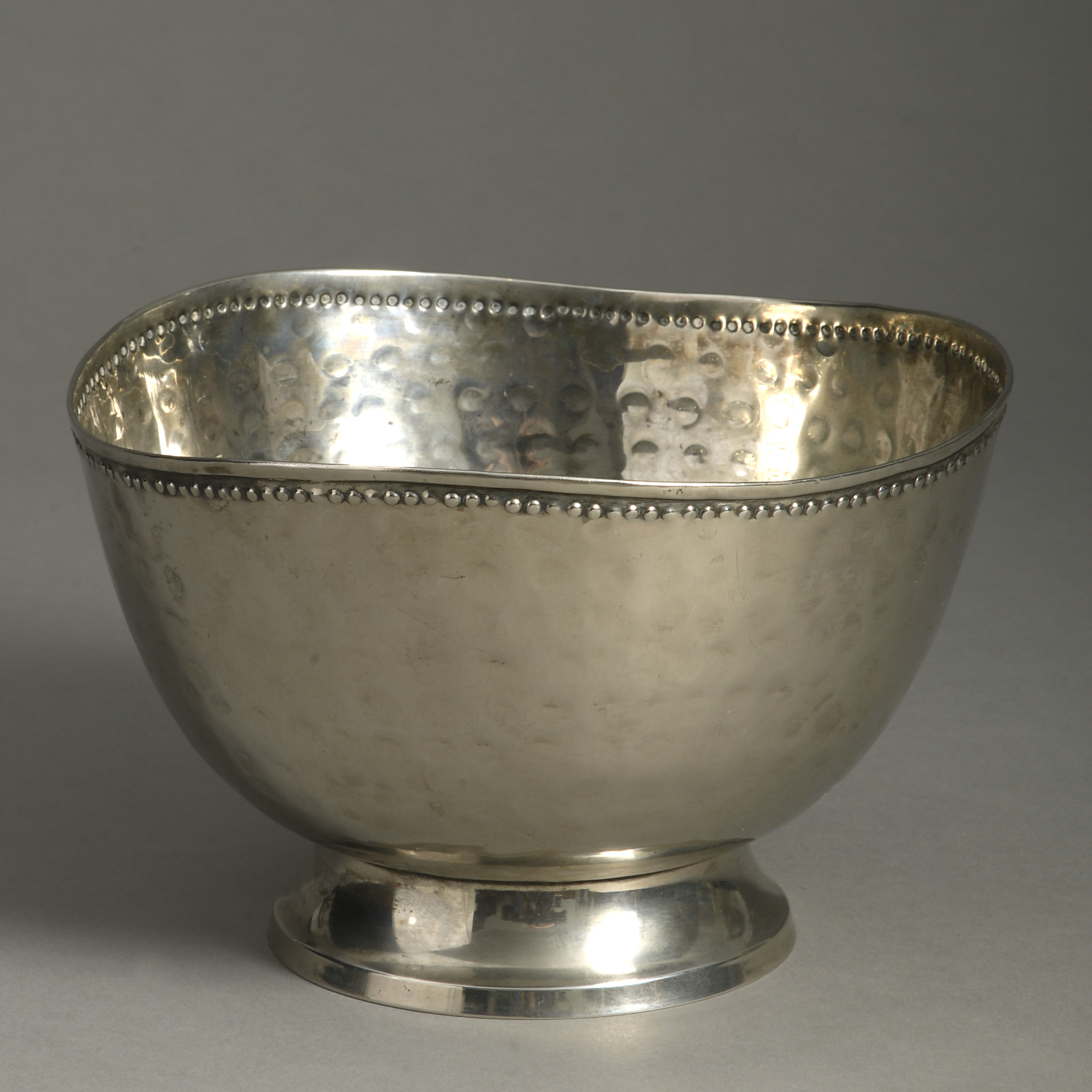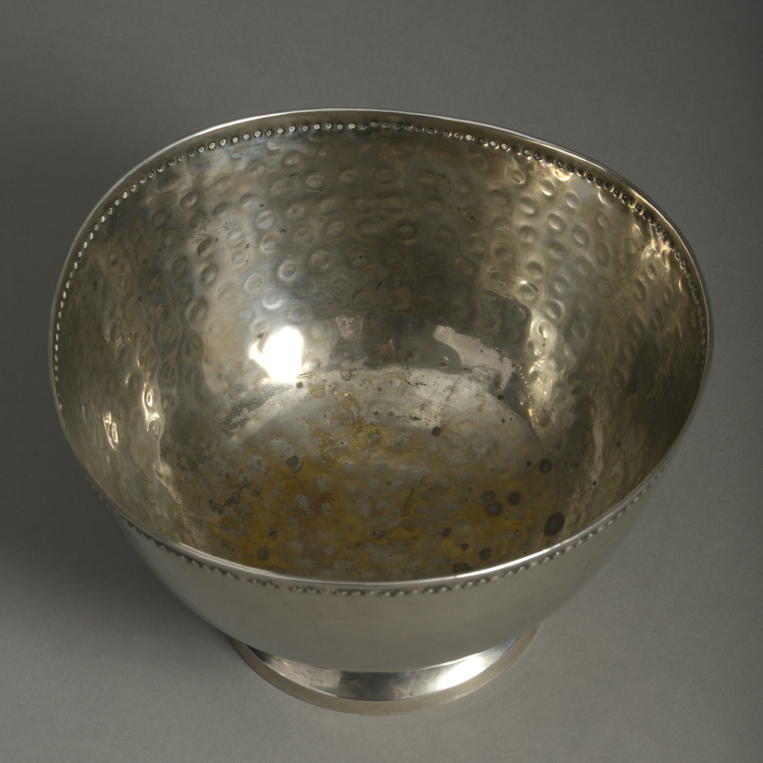 A mid-twentieth century silver-plated bowl, the body with hammered decoration, the undulating rim with beaded decoration, all set upon a turned foot