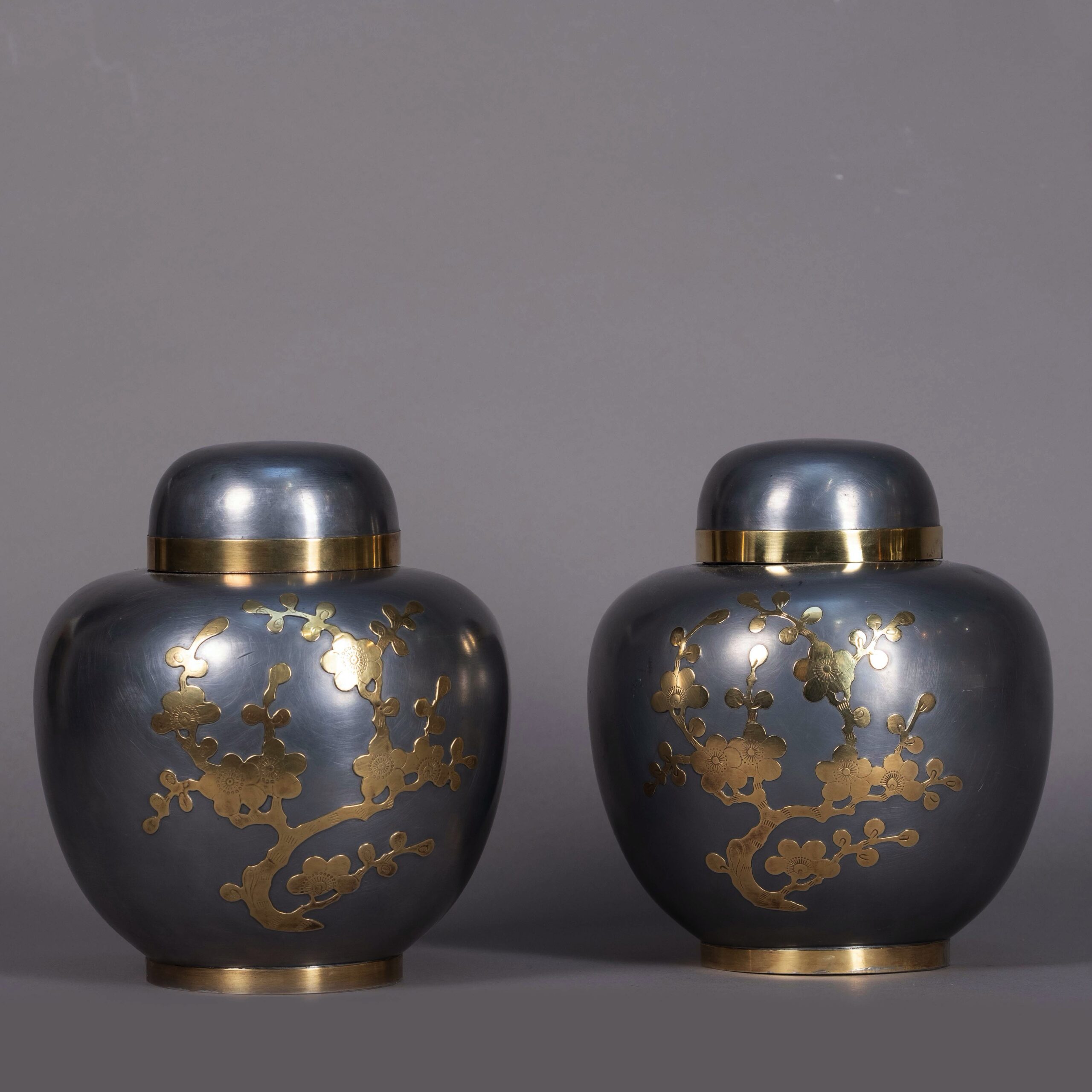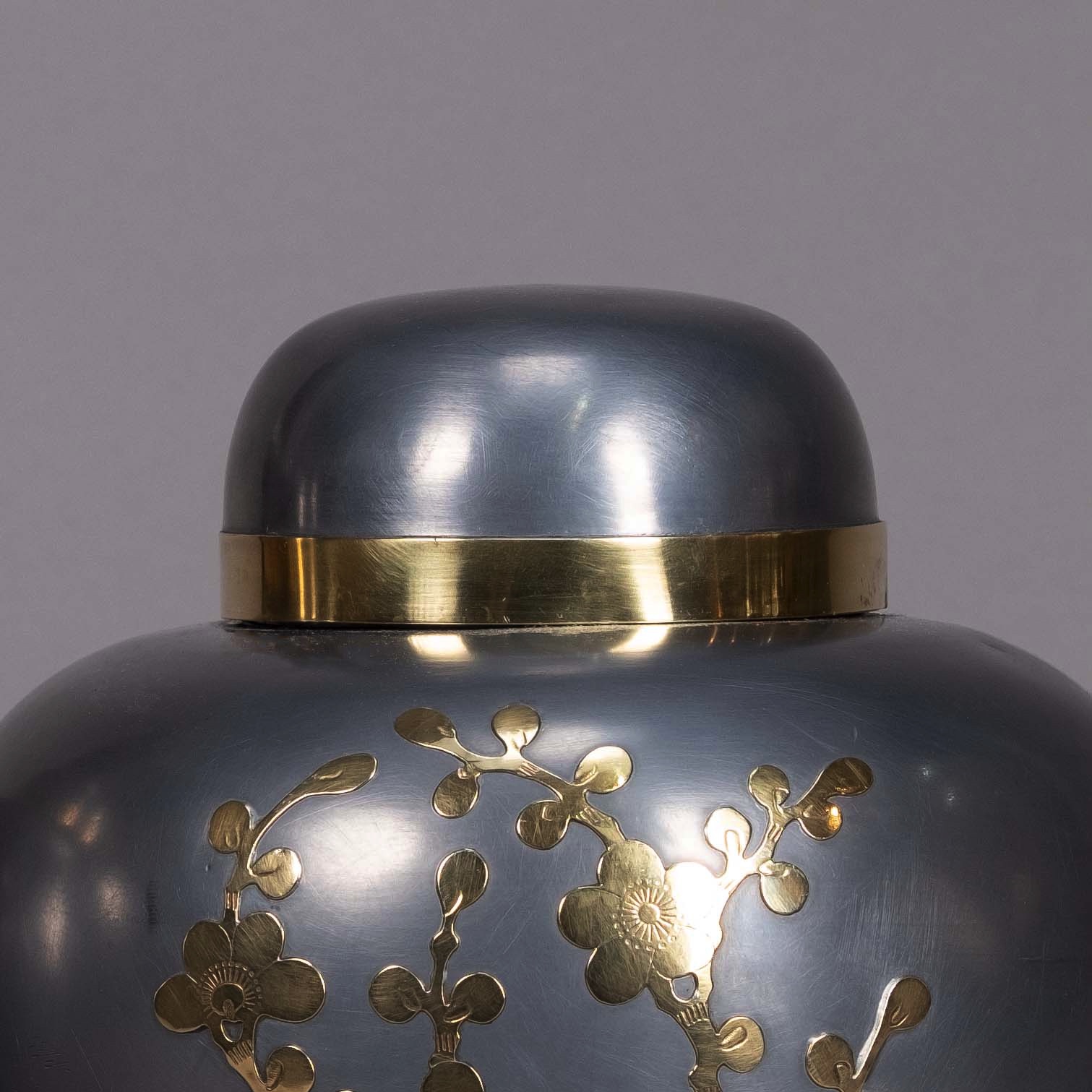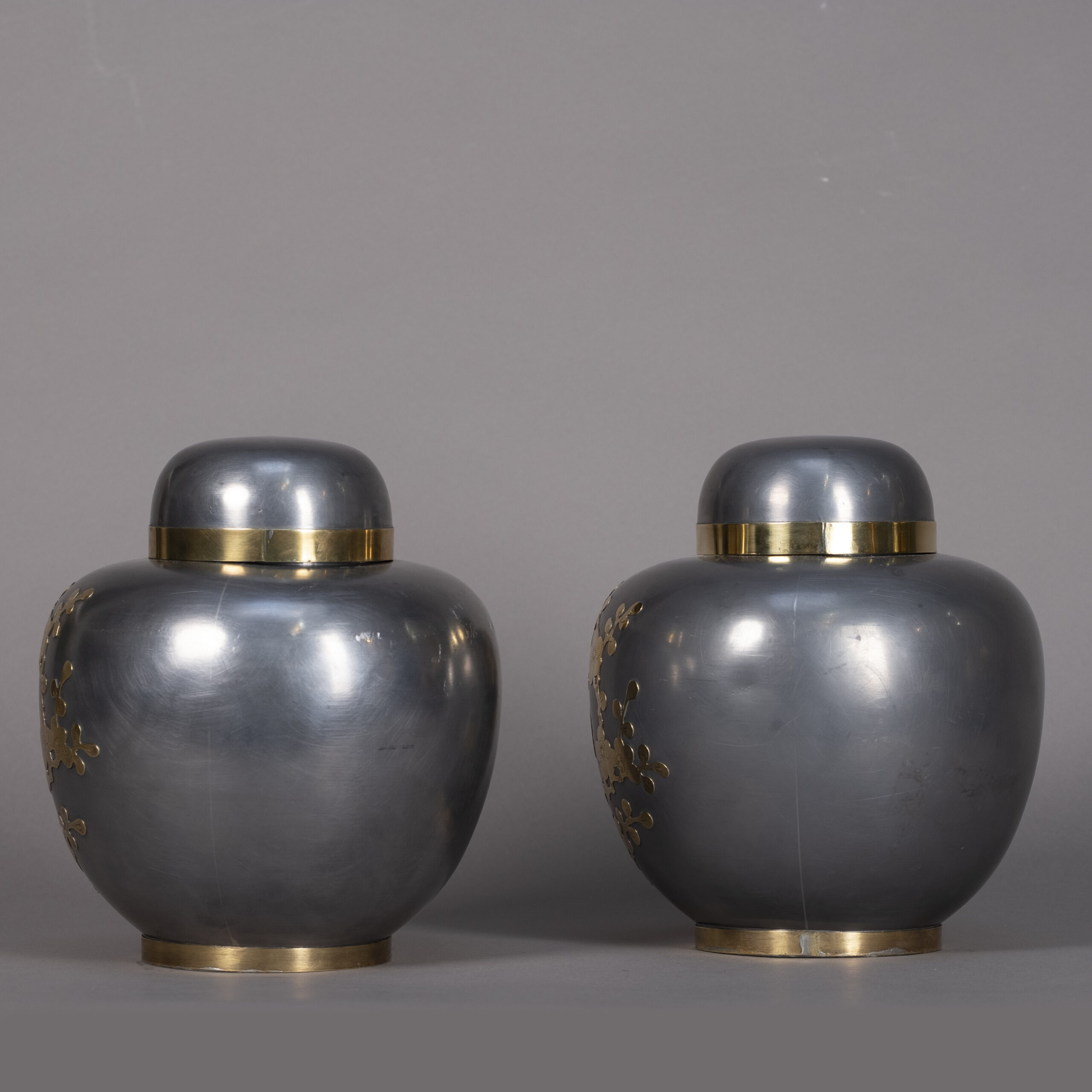 A pair of polished pewter ginger jars and covers, of bulbous form, the bodies inlaid with brass cherry blossom