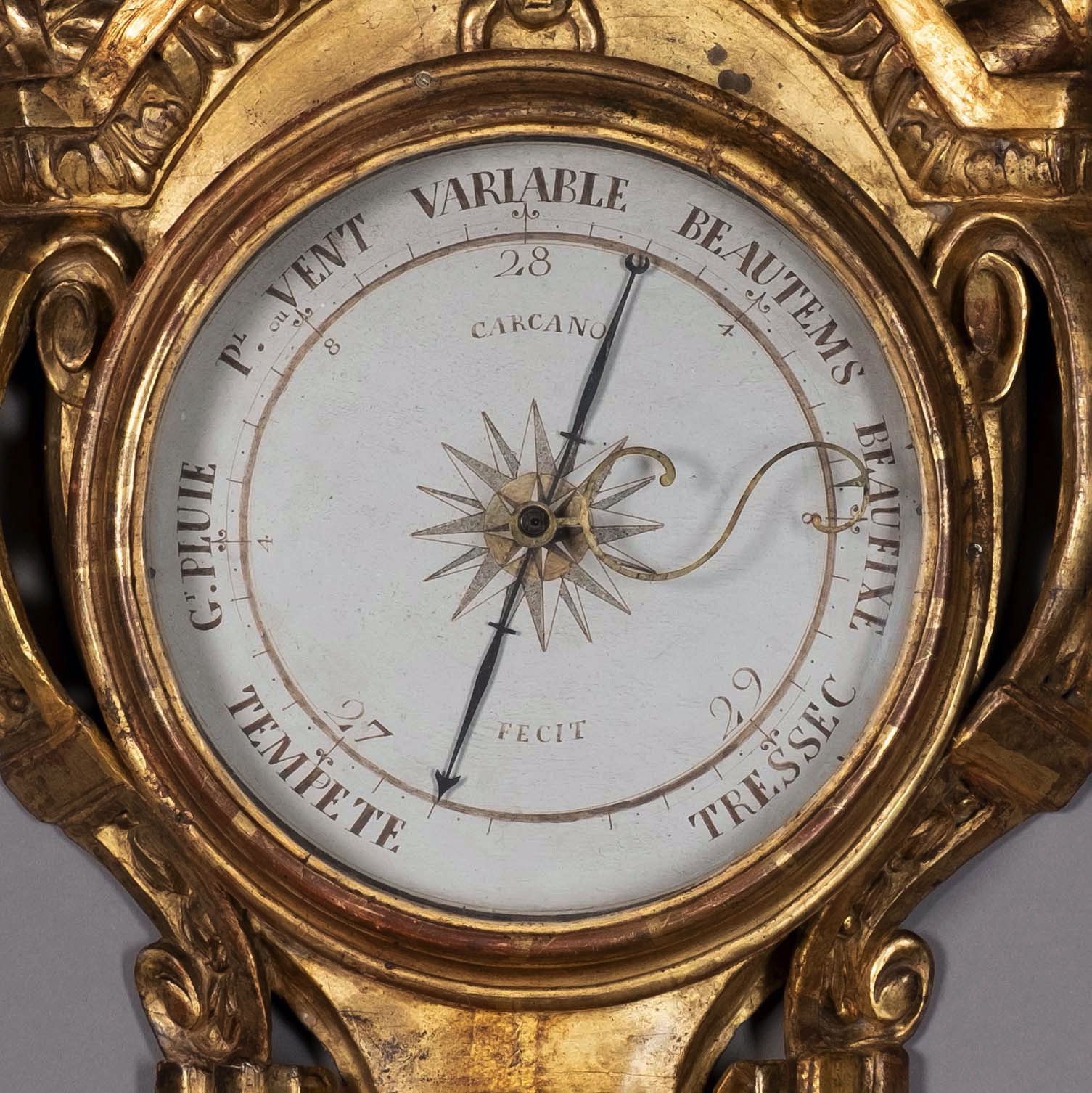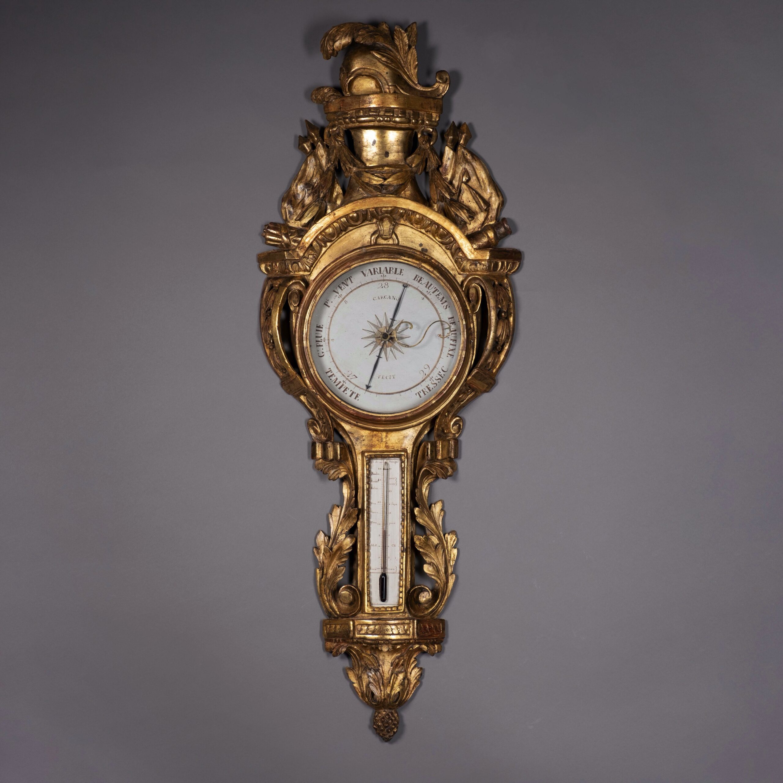 A very fine late eighteenth century Louis XVI Period giltwood barometer, the carved acanthus chapeau cresting above banners, a gun barrel and laurel swags, all set upon a segmental egg and dart cornice, the painted dial within scrolling brackets, above a rectangular thermometer plate with supporting acanthus scrolls and terminating in a chamfered plinth of guilloche and foliage with pine cone finial.