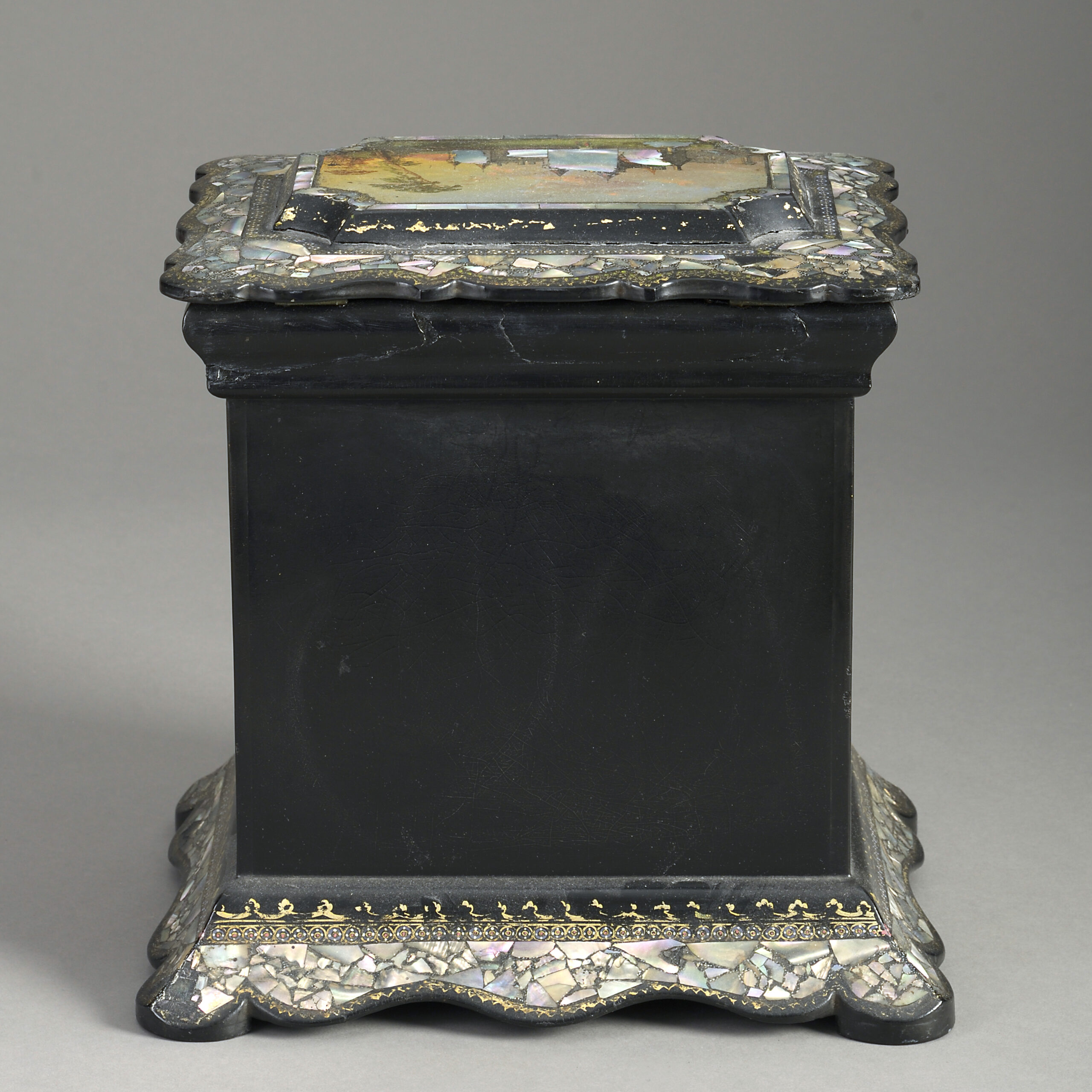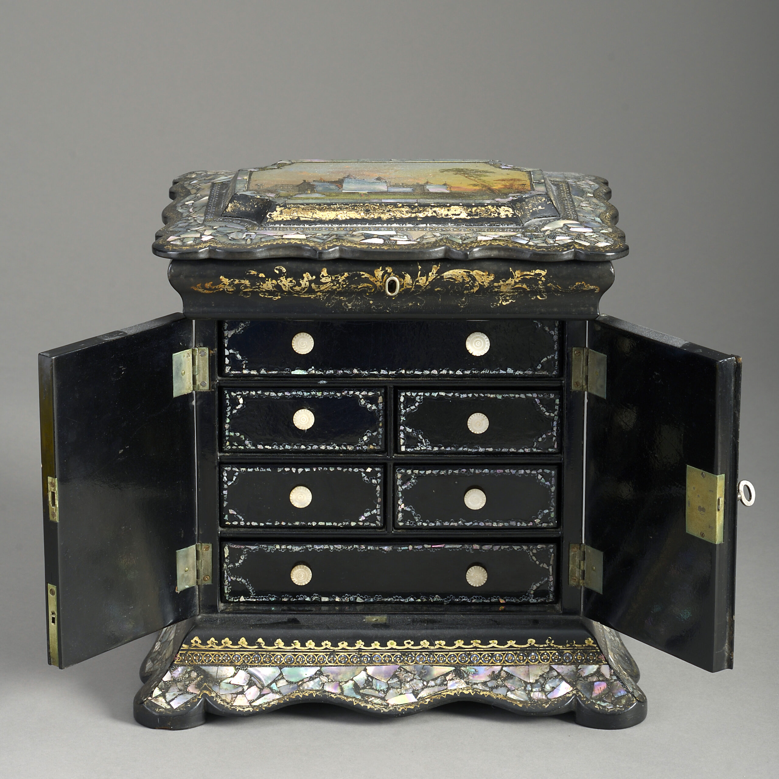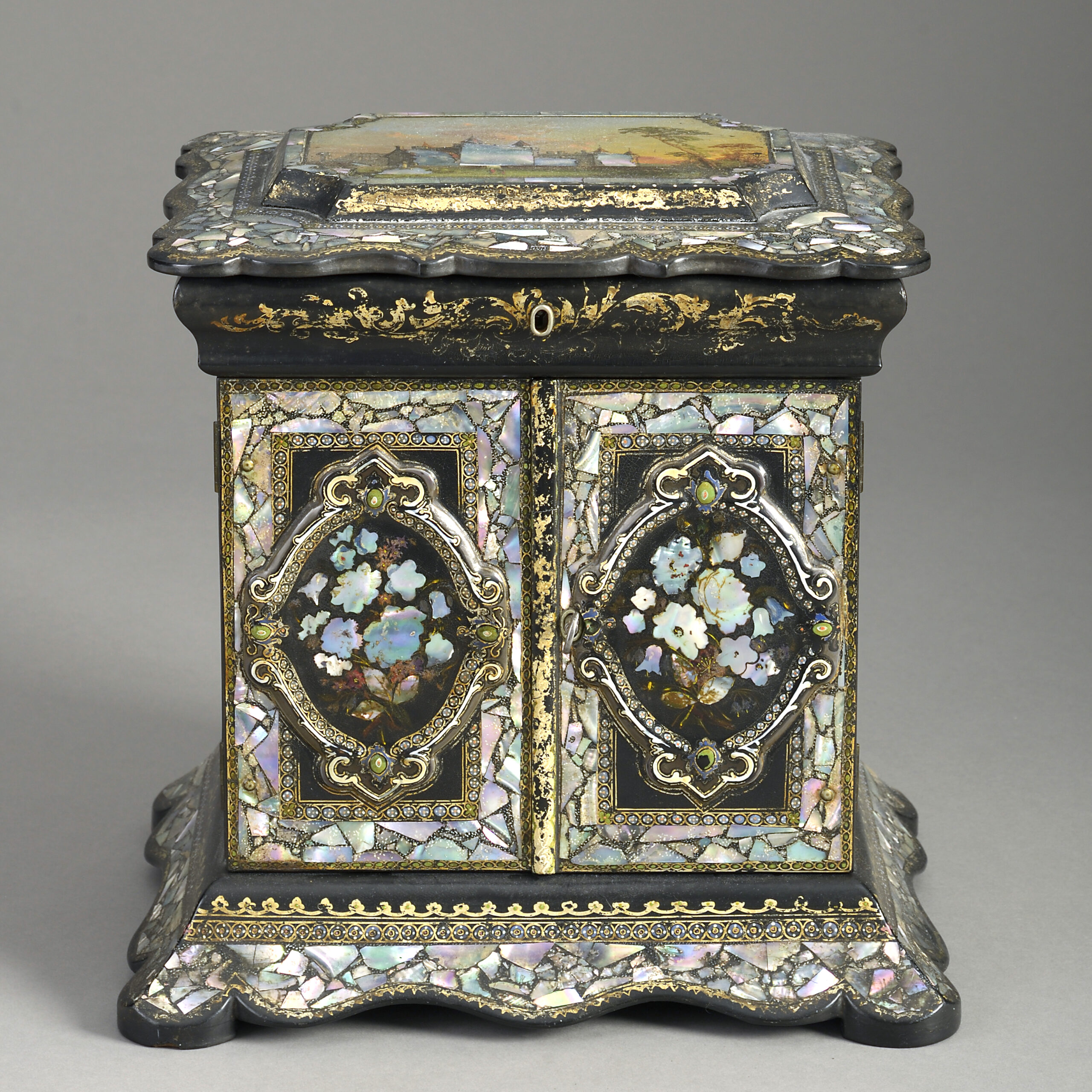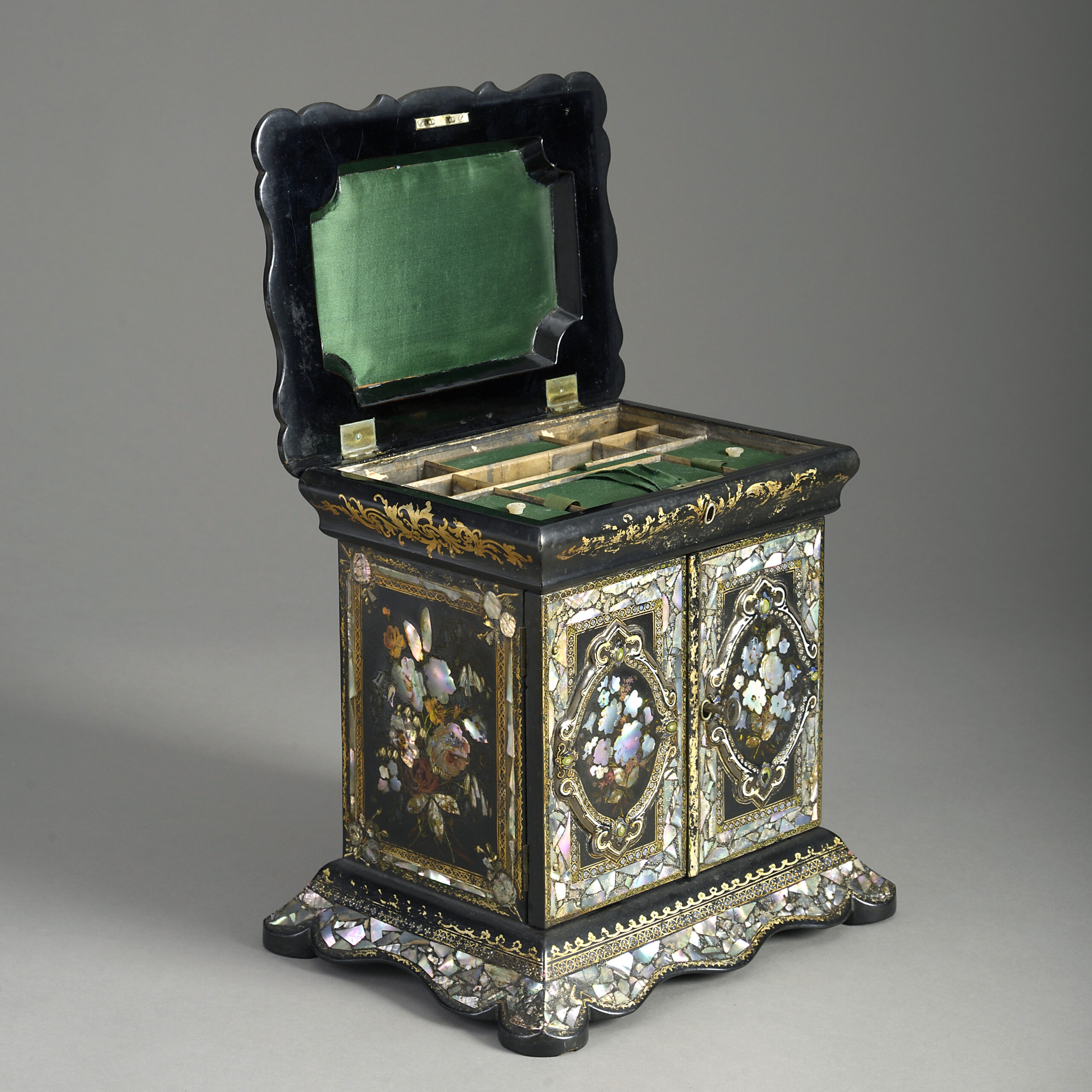 A mid-nineteenth century Victorian Period black japanned sewing box, of architectural form, decorated throughout with mother of pearl floral veneers and gilded scrollwork, having two doors, opening to reveal shelves.