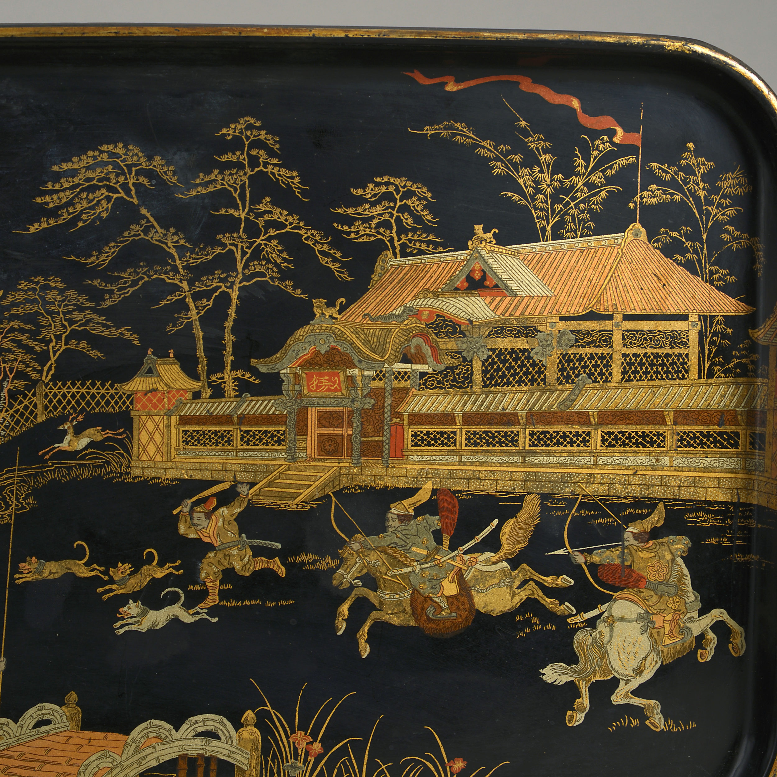 A late 19th century Meiji Period black lacquer tray, of rectangular form, decorated throughout in various gilded tones, depicting a stag hunt.