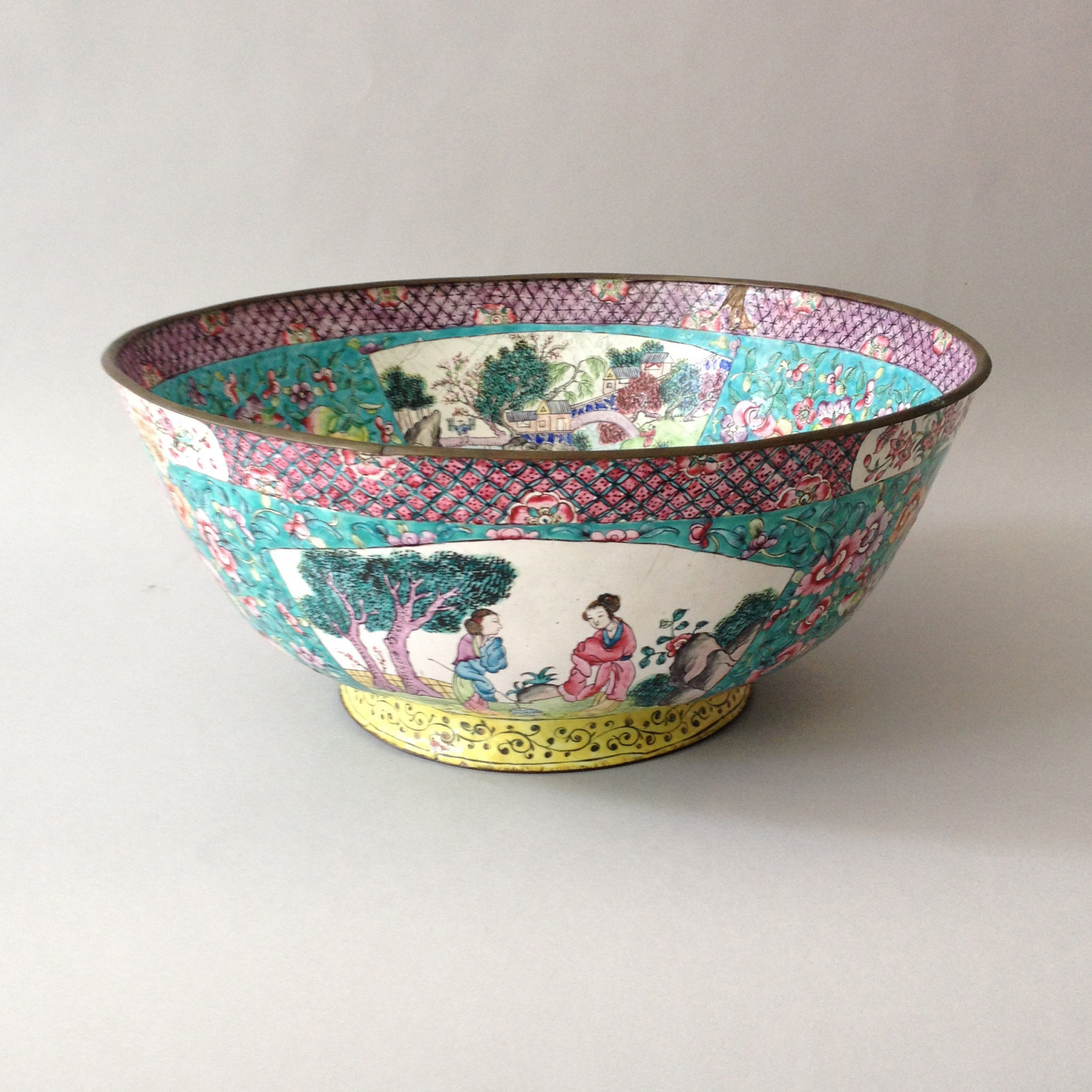 A polychrome Canton Enamel basin of good scale, the inside decorated with a dragon motif and floral decoration articulated by fan shaped landscape panels, the outer surface with figurative decoration, the whole set upon a yellow foot.