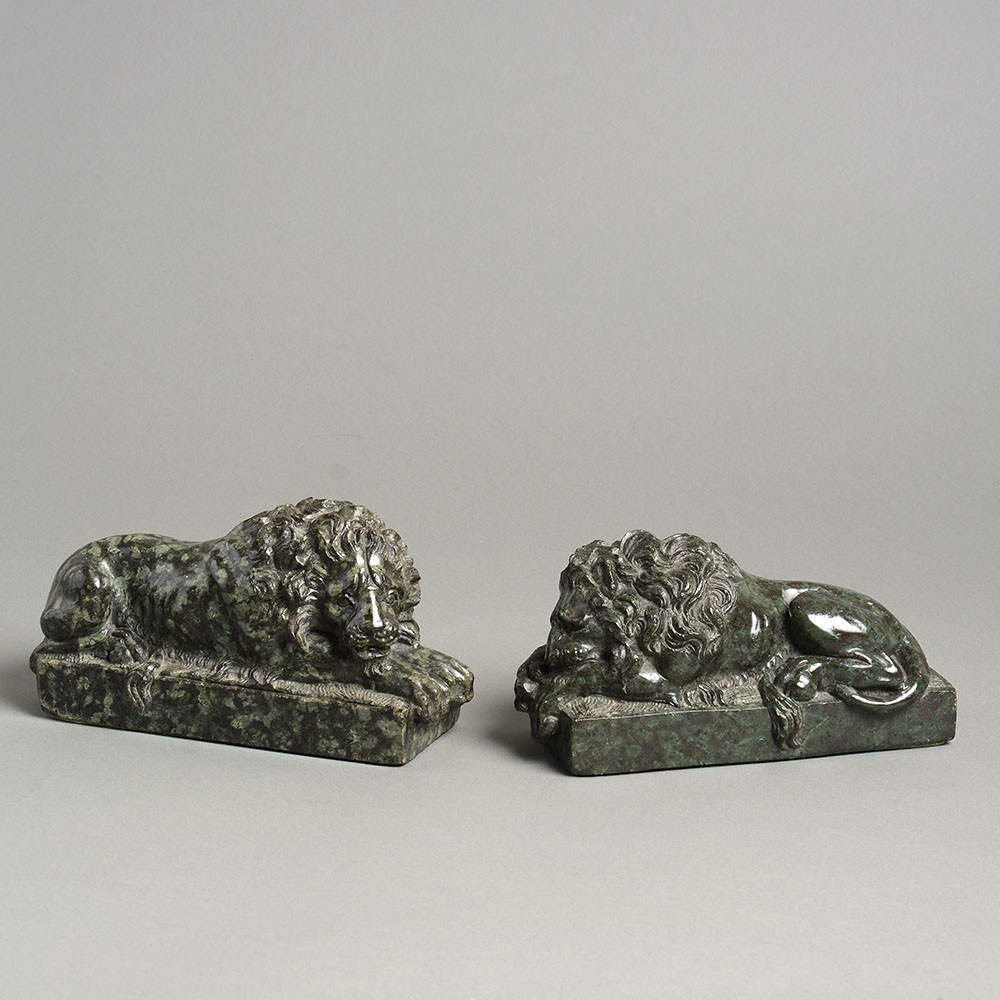 A finely carved pair of Italian serpentine marble lions after Antonio Canova.